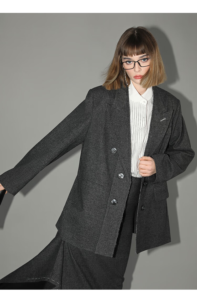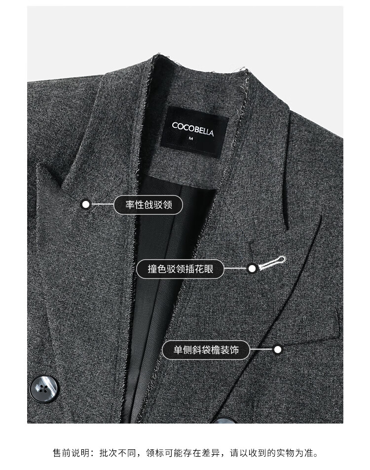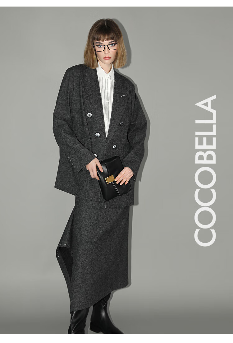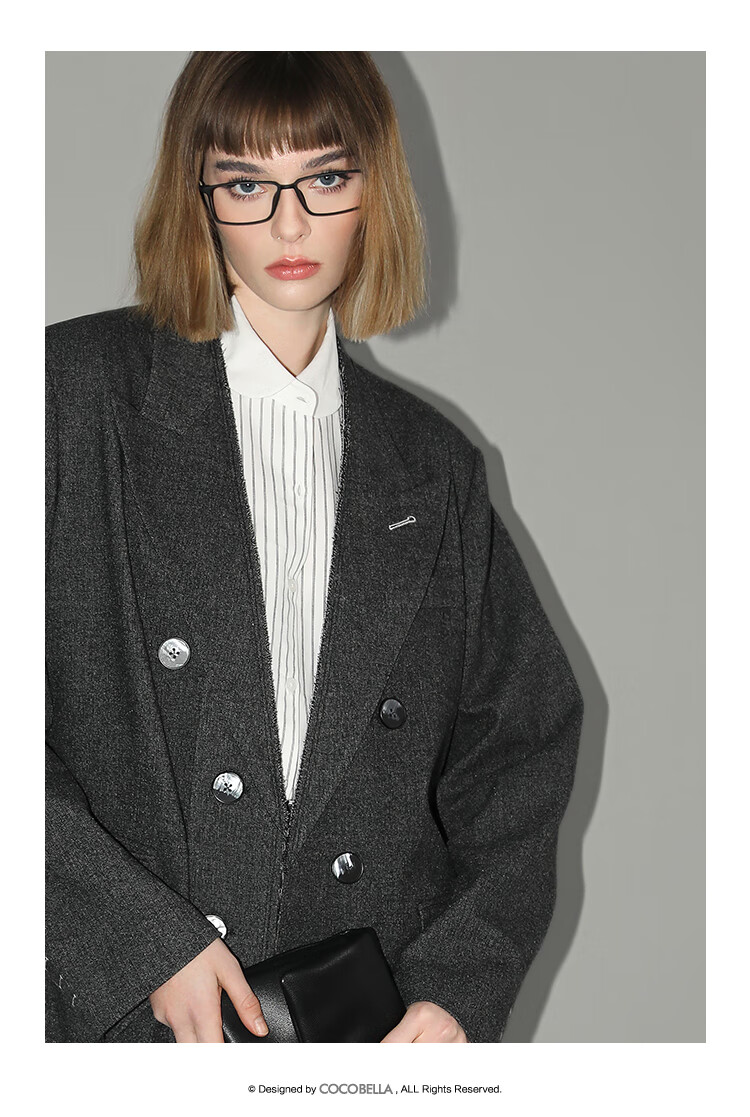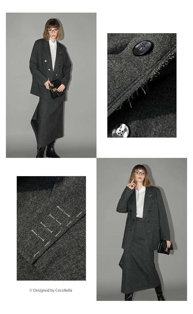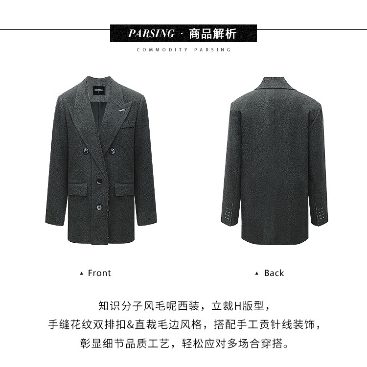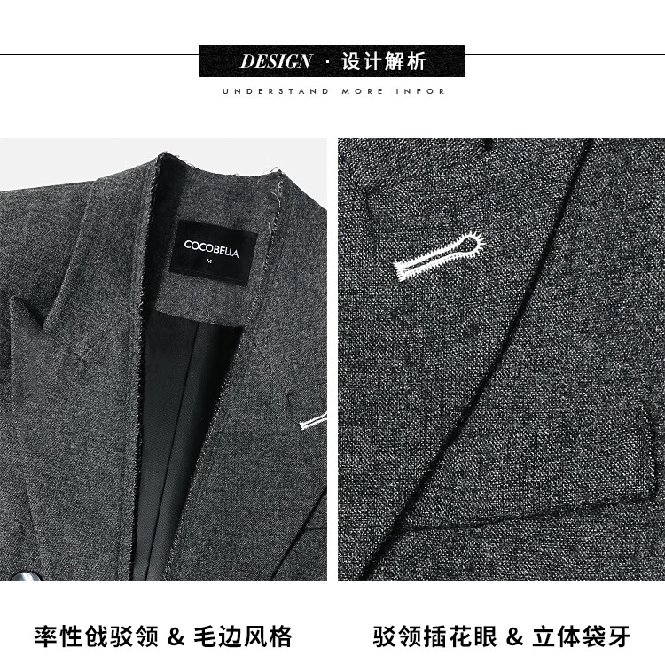 COCOBELLA知识分子风手工贡针毛呢西装女宽肩毛边西服SI3009