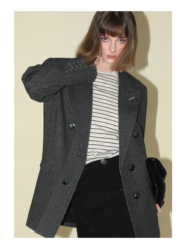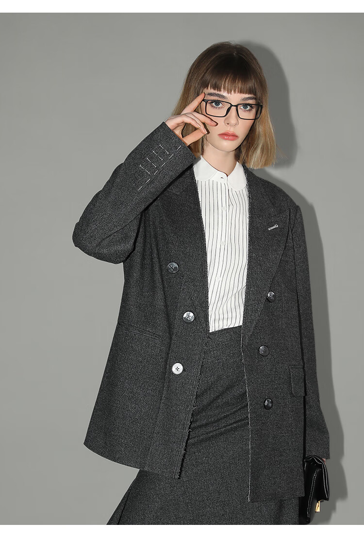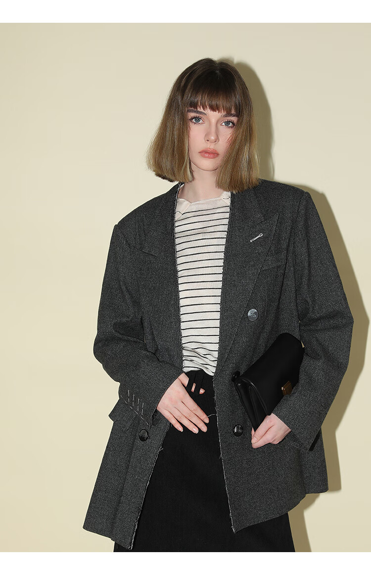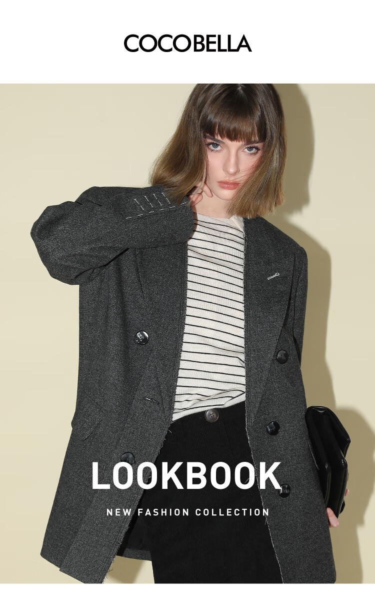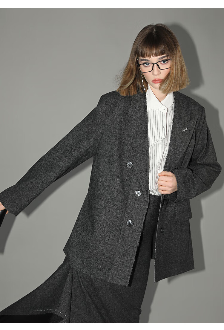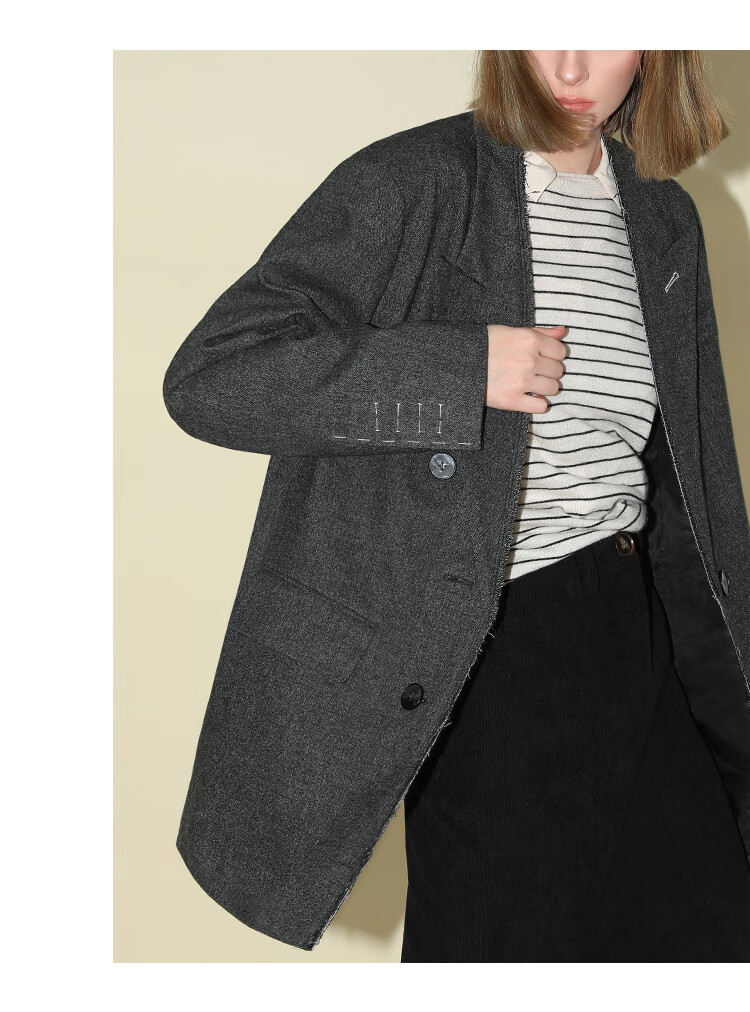 COCOBELLA知识分子风手工贡针毛呢西装女宽肩毛边西服SI3009