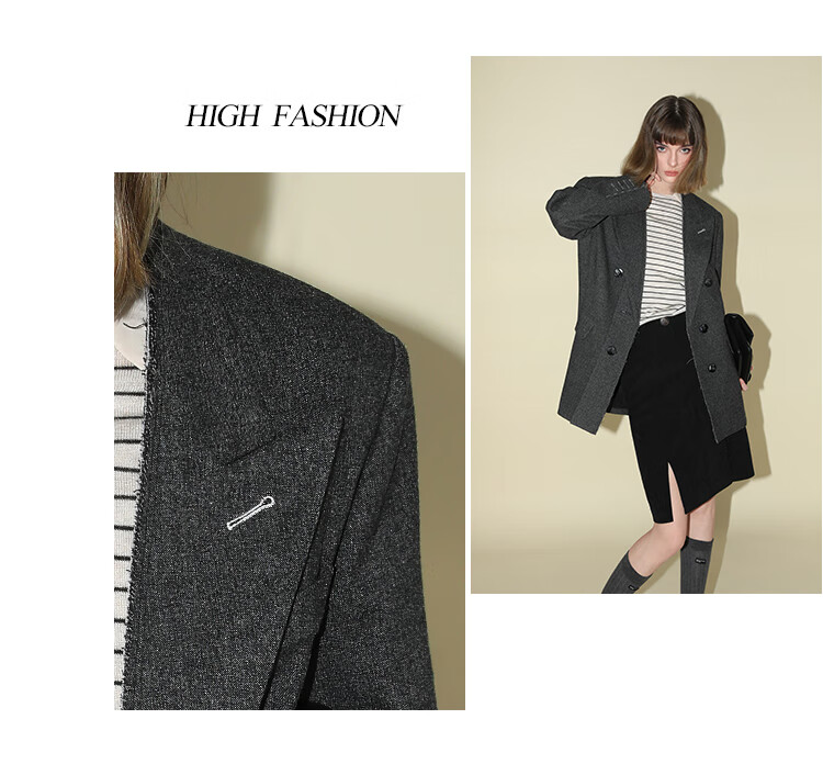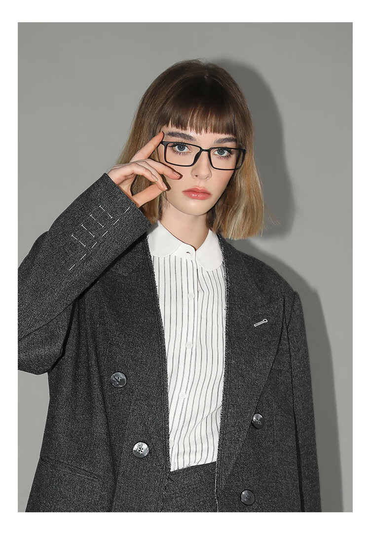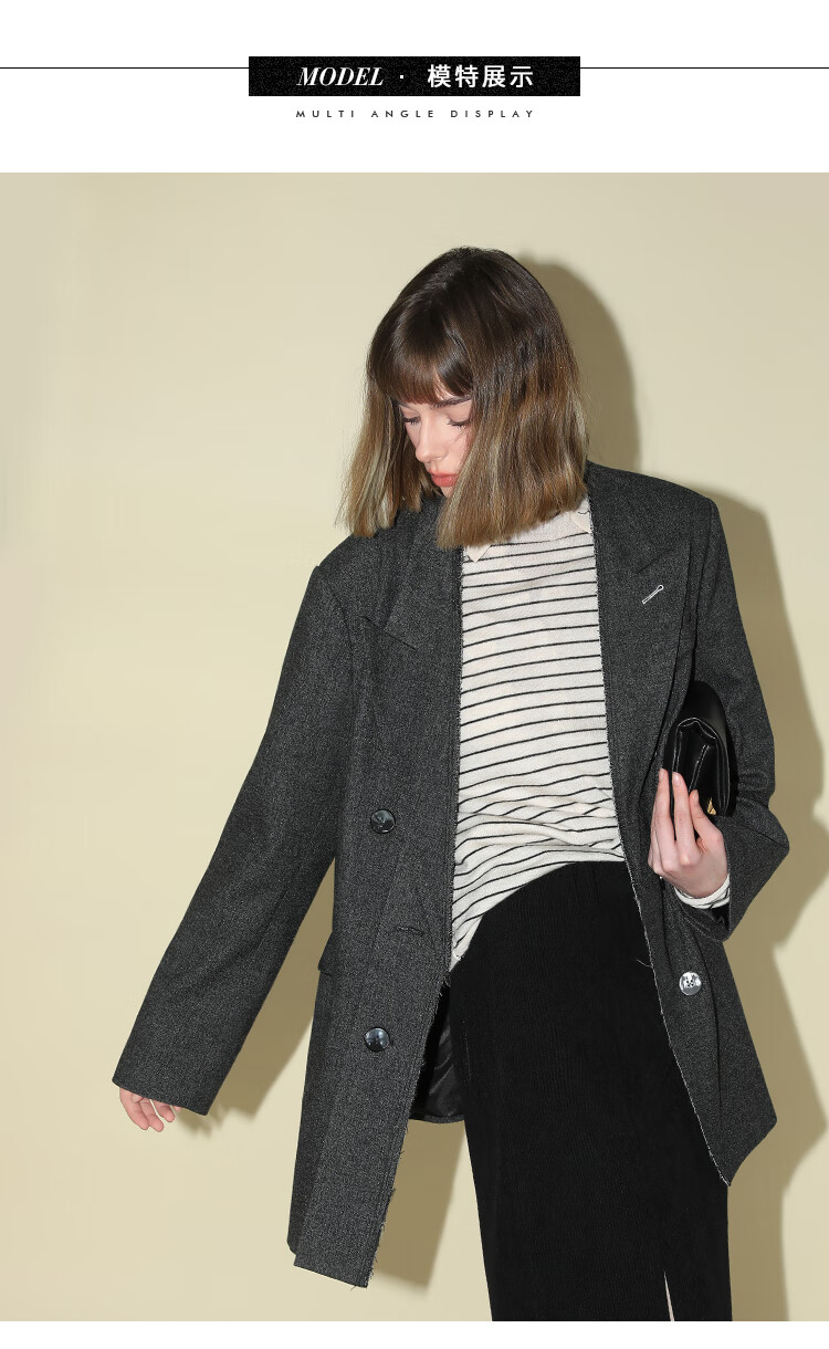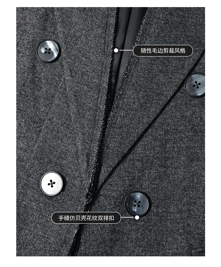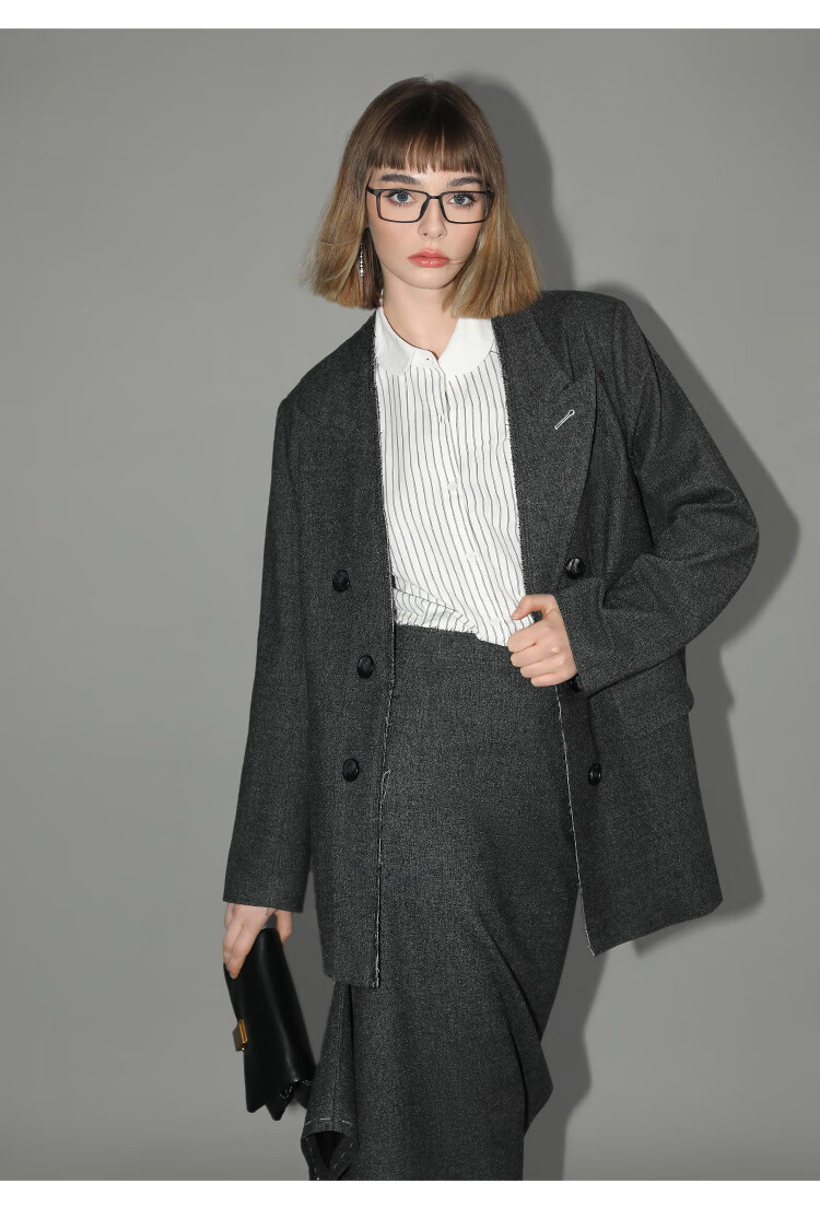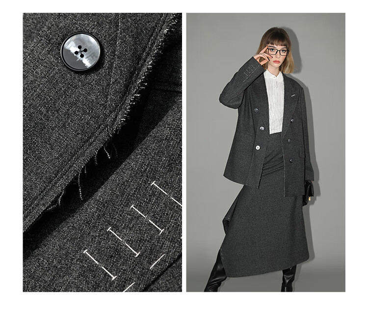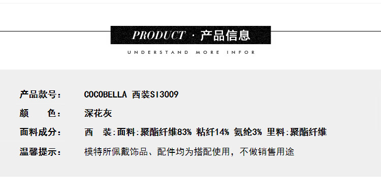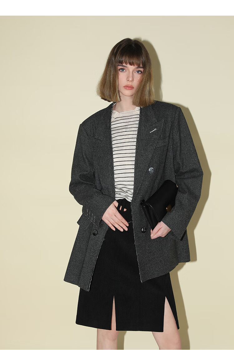 COCOBELLA知识分子风手工贡针毛呢西装女宽肩毛边西服SI3009