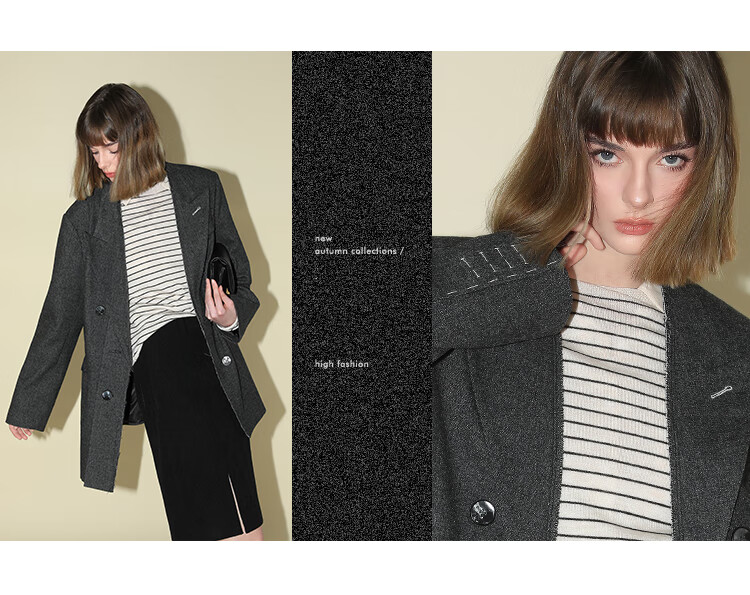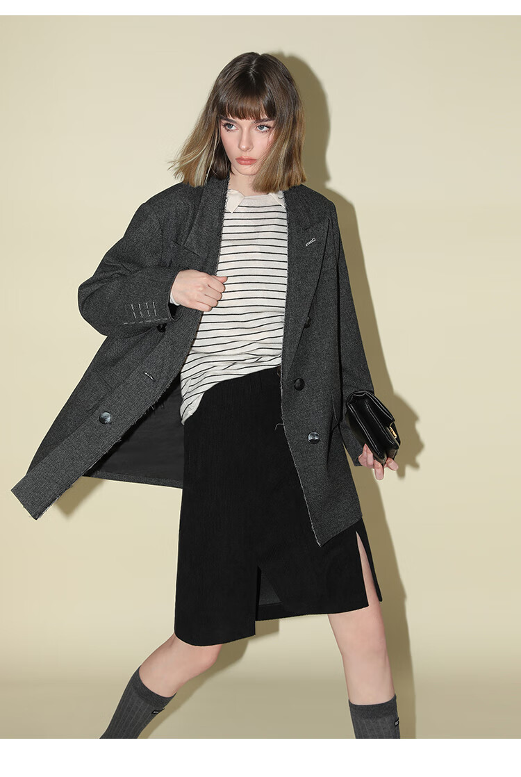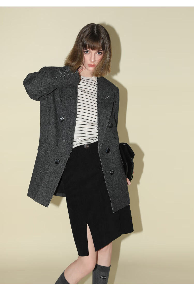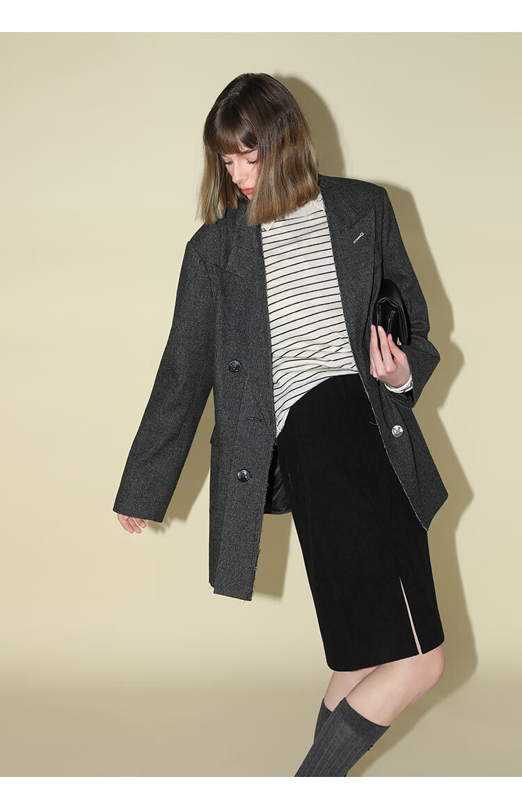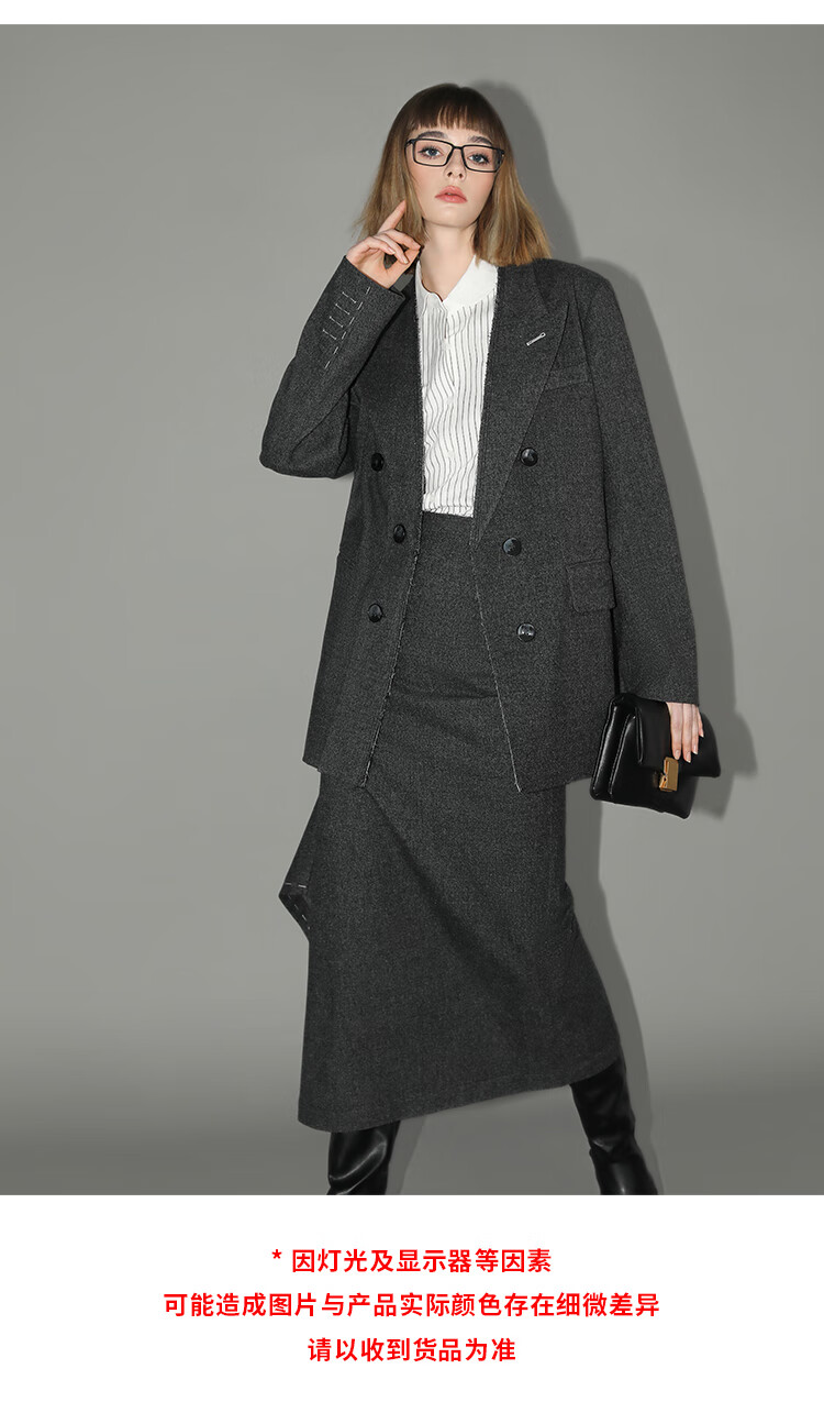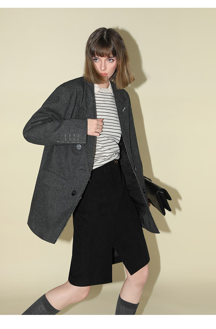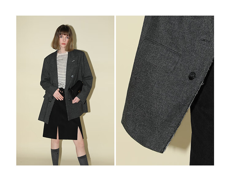 COCOBELLA知识分子风手工贡针毛呢西装女宽肩毛边西服SI3009