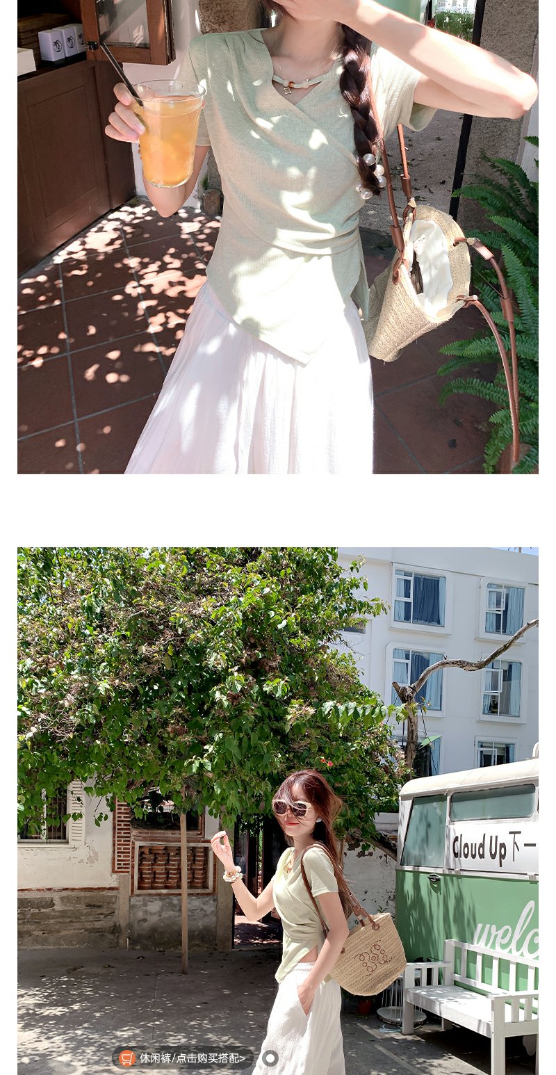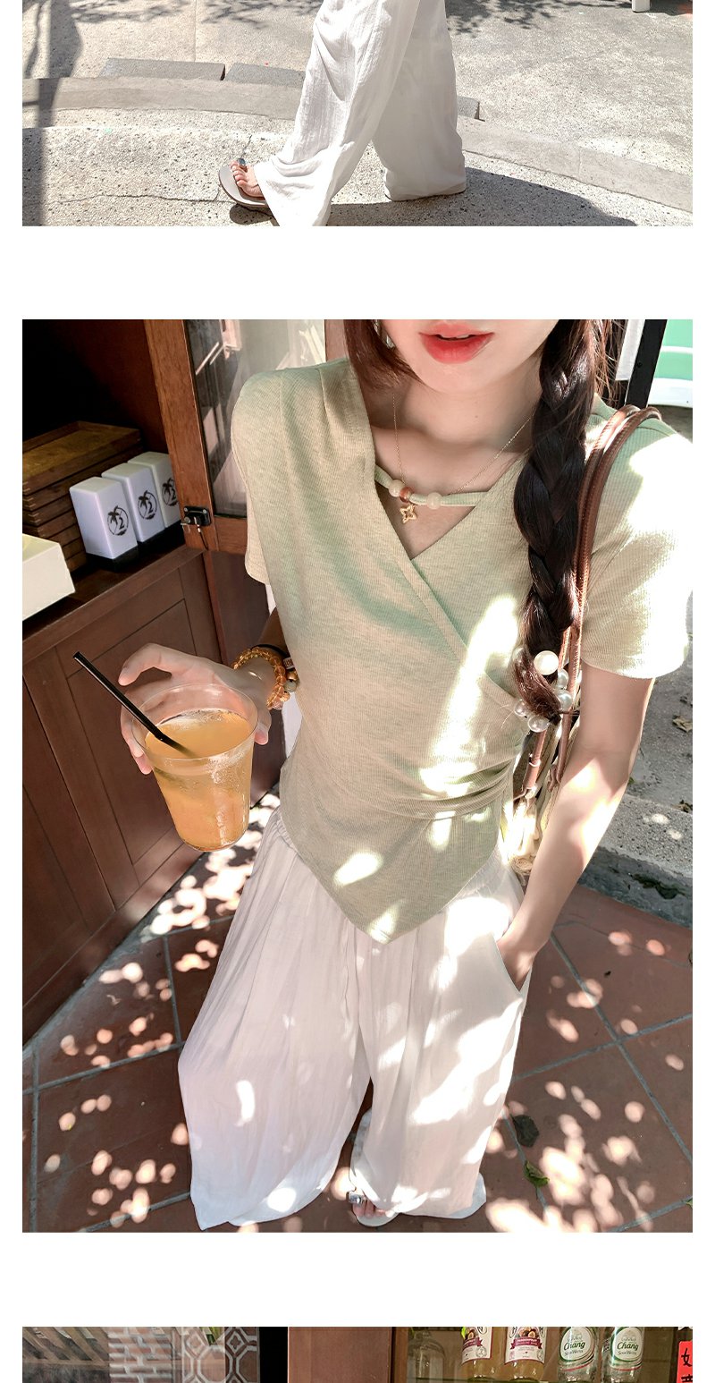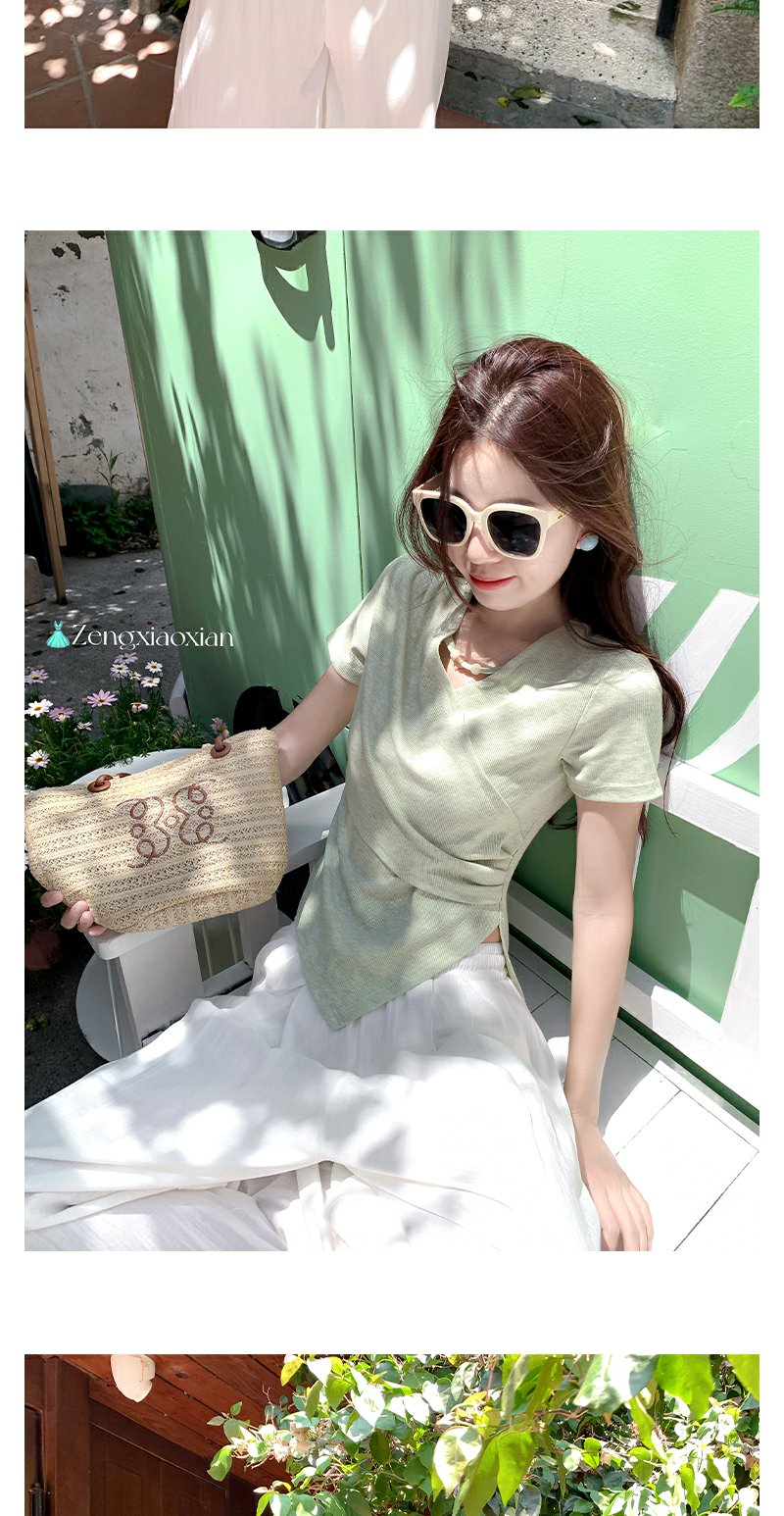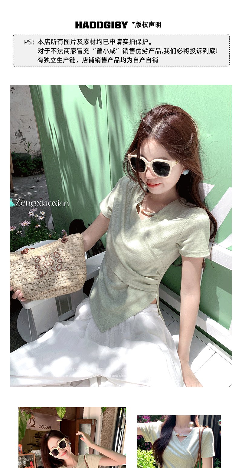 <曾小咸推荐>不规则绿色交叉v领收腰短袖T恤