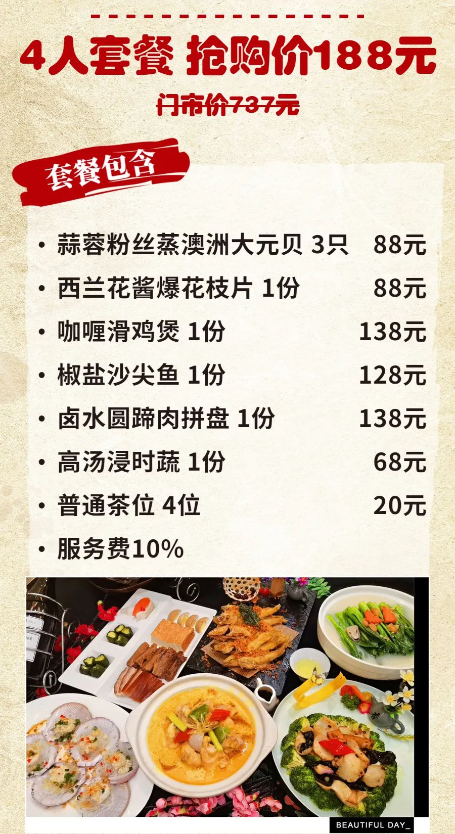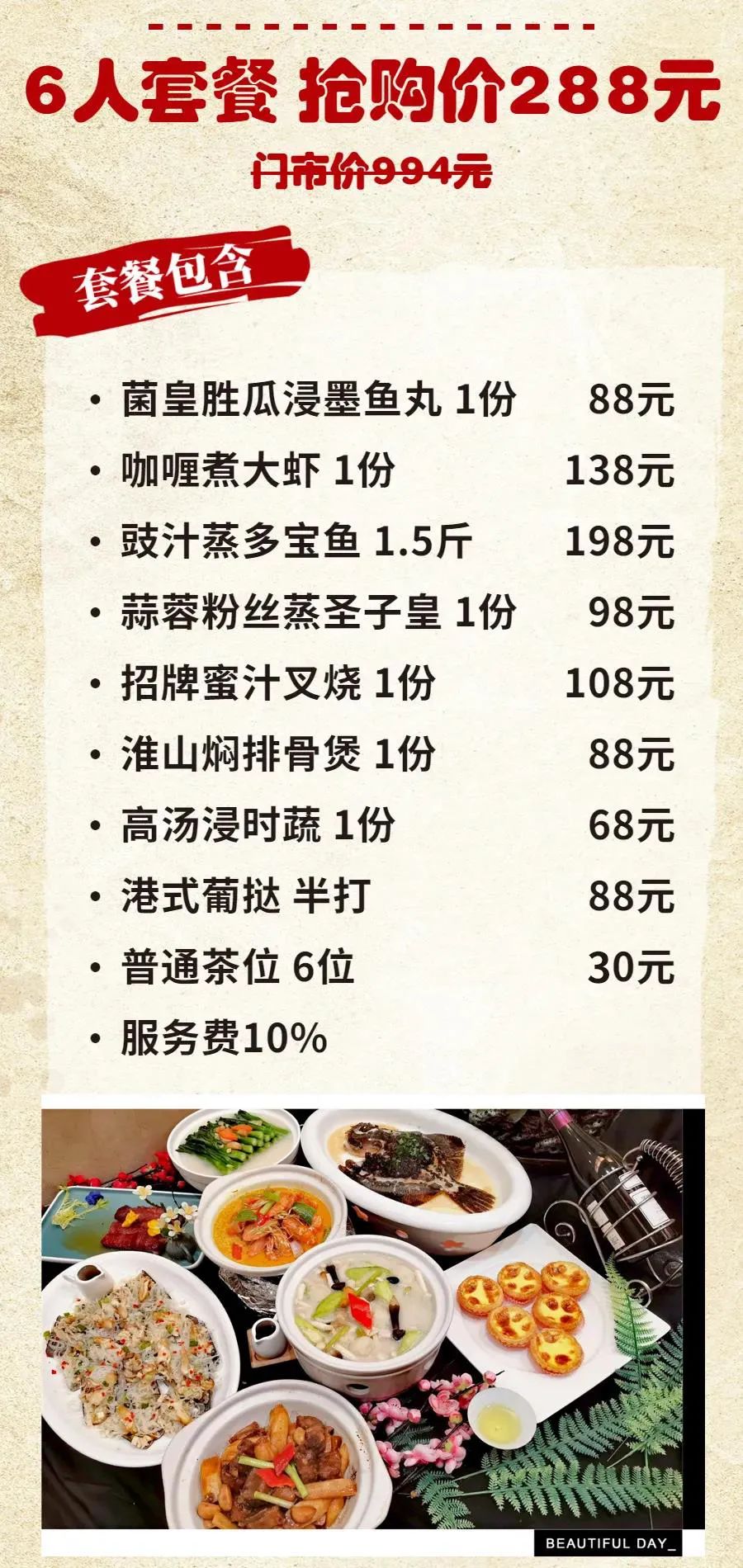 ◆ 套餐包含菜品需1次消费完毕,不可拆分不同日期享用,部分菜品若因时令或其他不可抗因素导致无法提供,将视实际情况以等价菜品替换