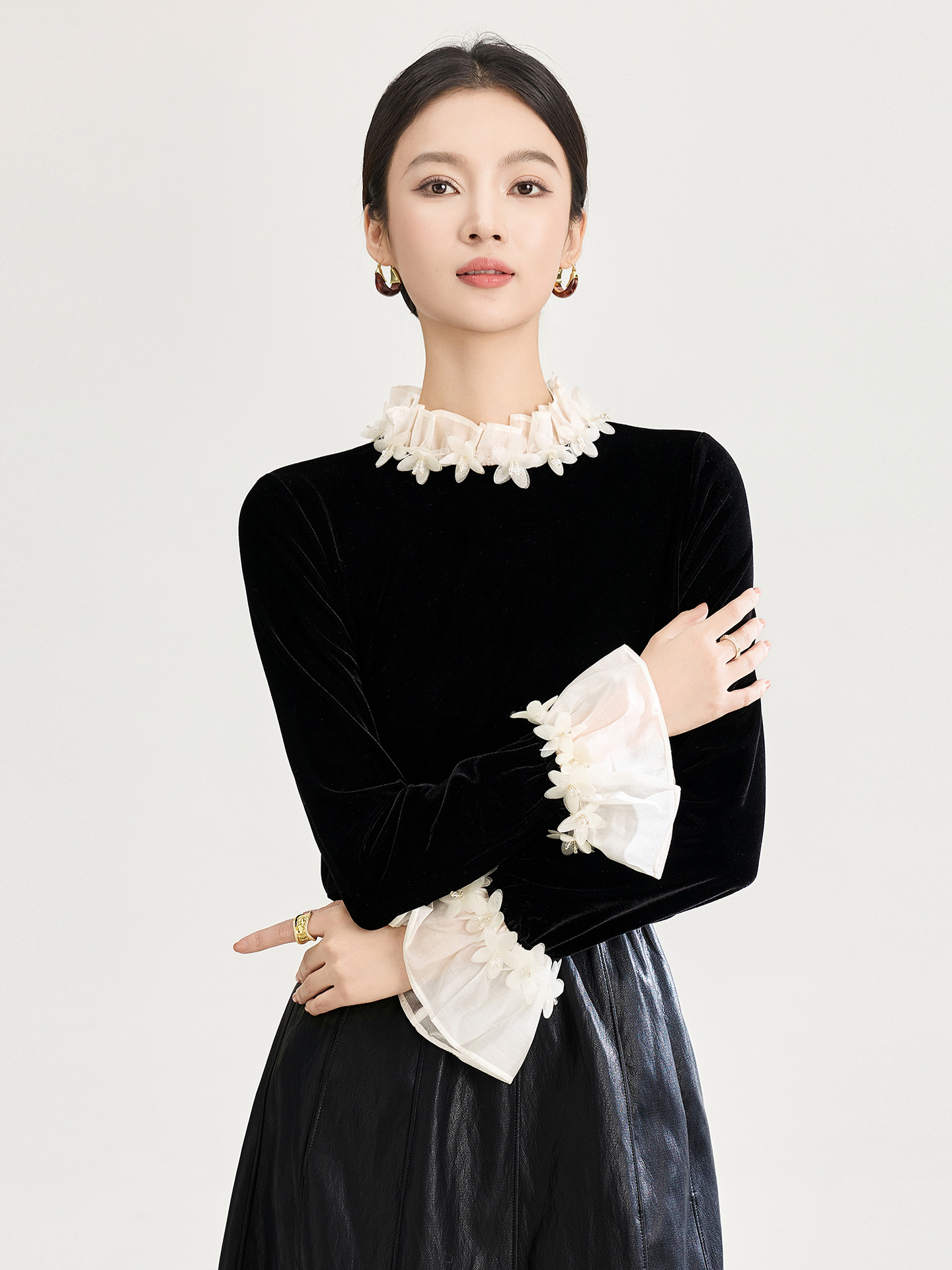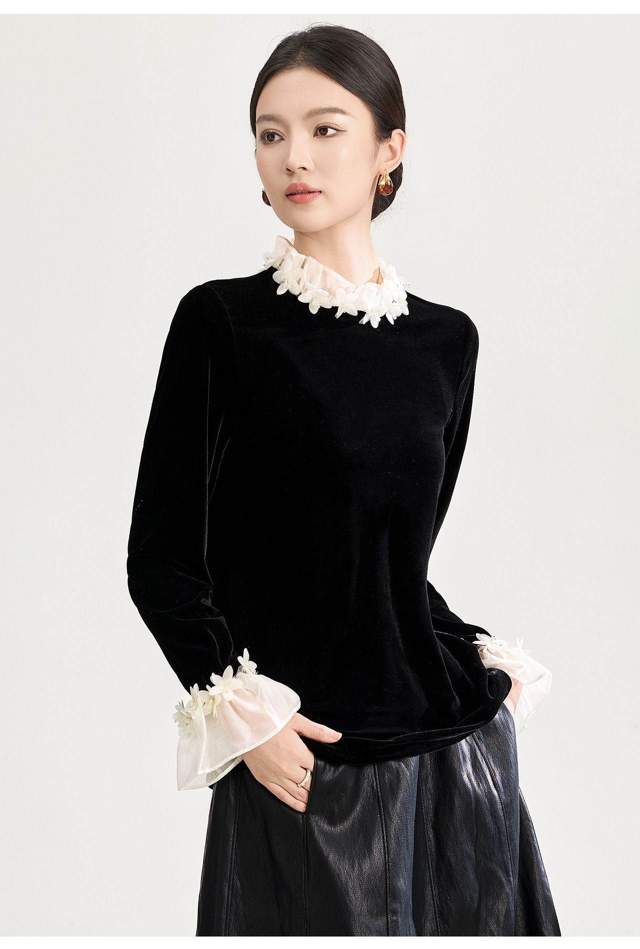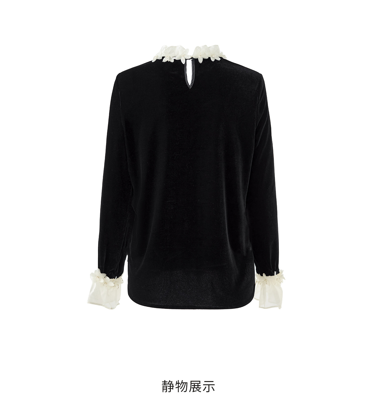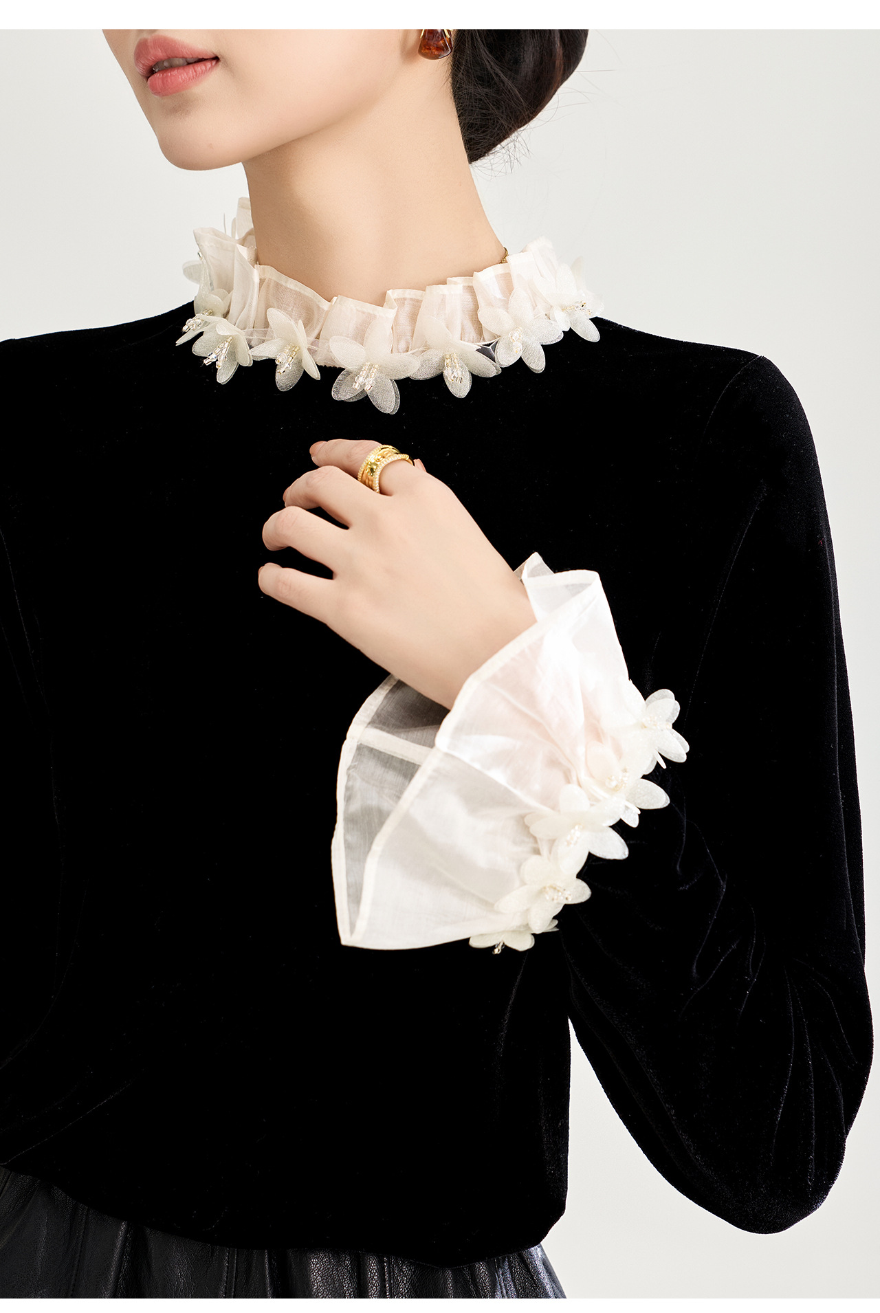 2026春装法式浪漫高贵洋气四方立绒衬衫蕾丝花瓣领上装