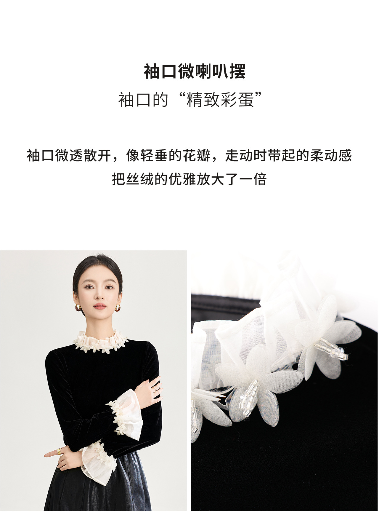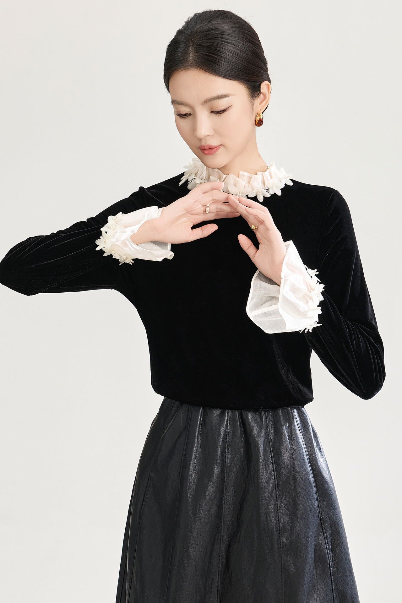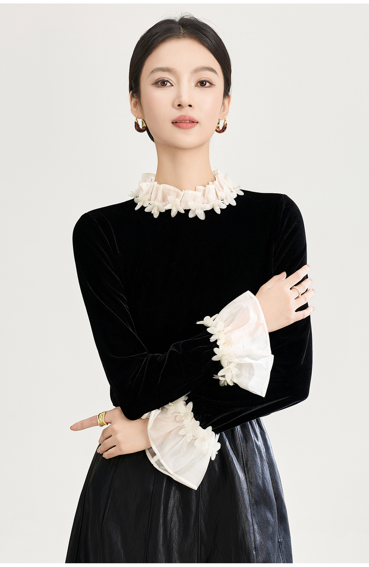2026春装法式浪漫高贵洋气四方立绒衬衫蕾丝花瓣领上装