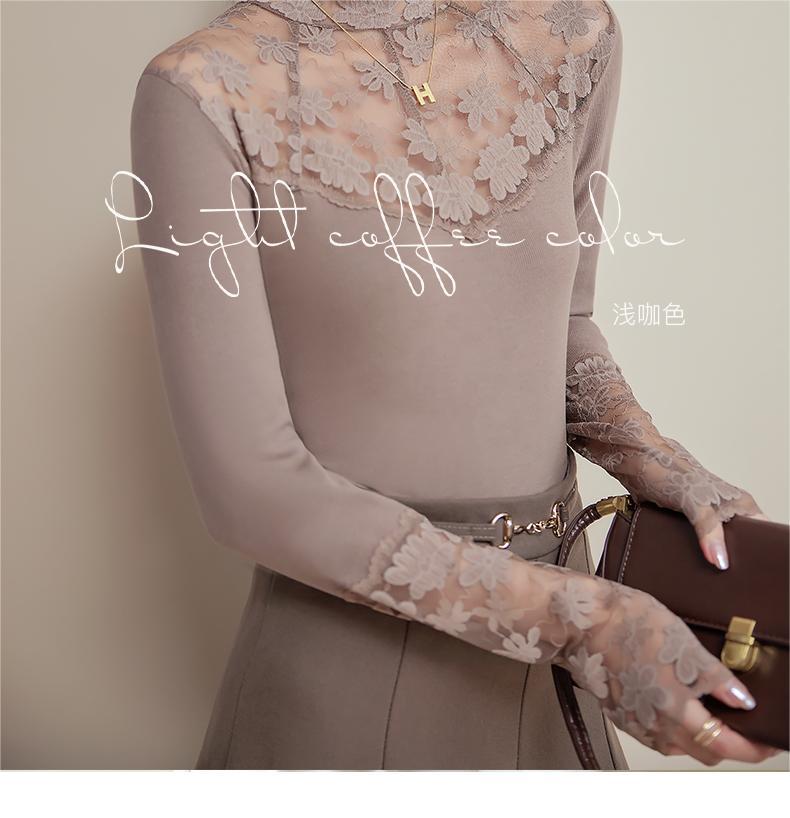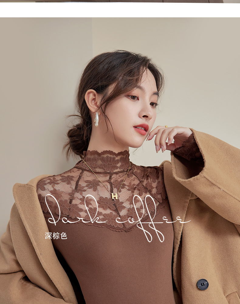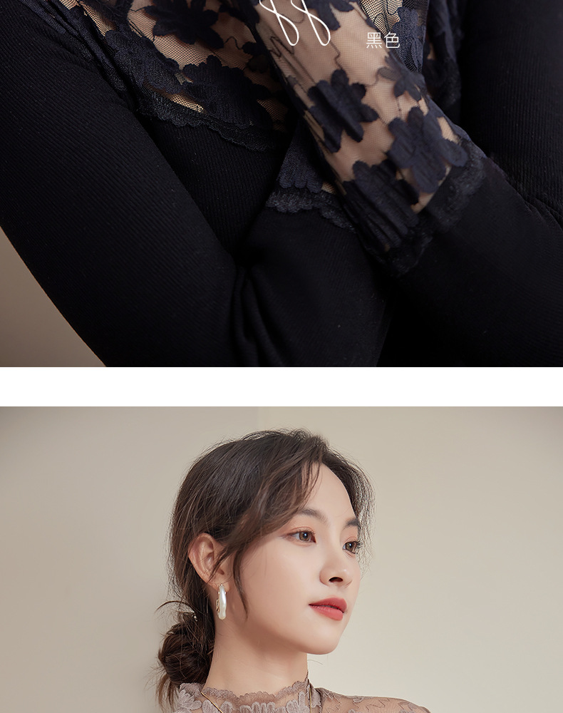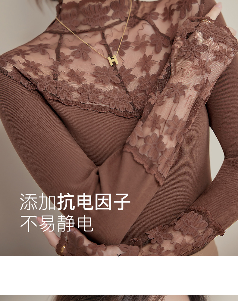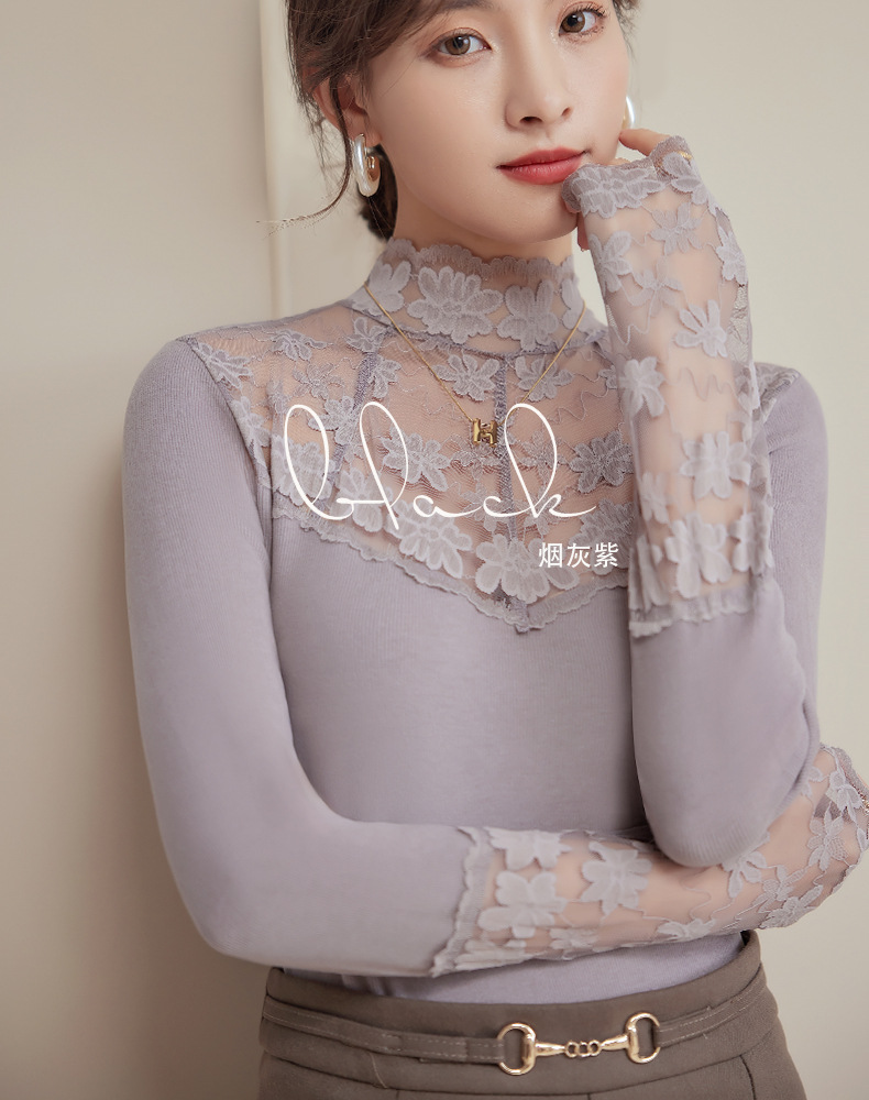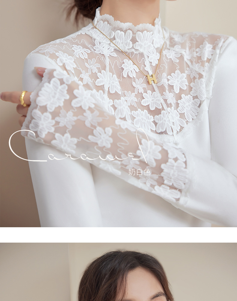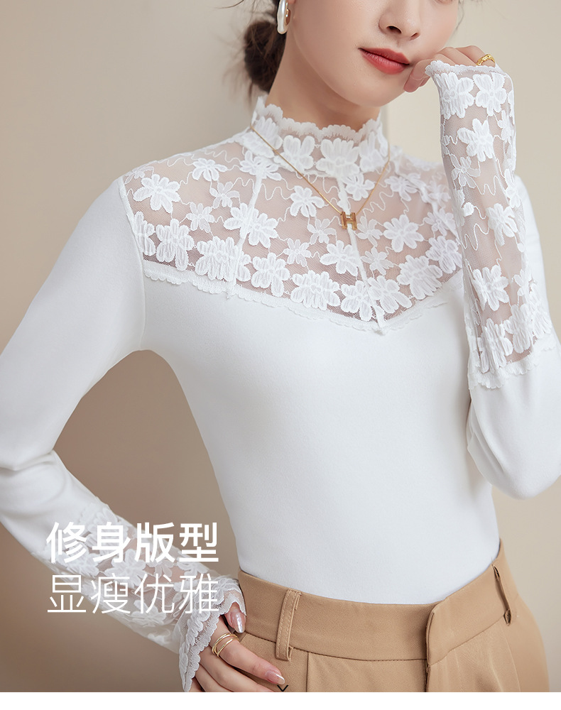 2024新款加绒加厚蕾丝半高领打底衫女春秋内搭修身长袖上衣针织衫