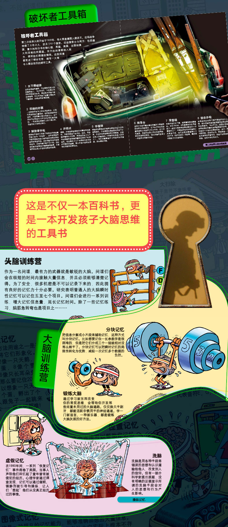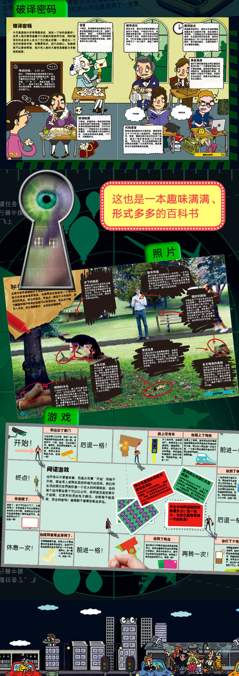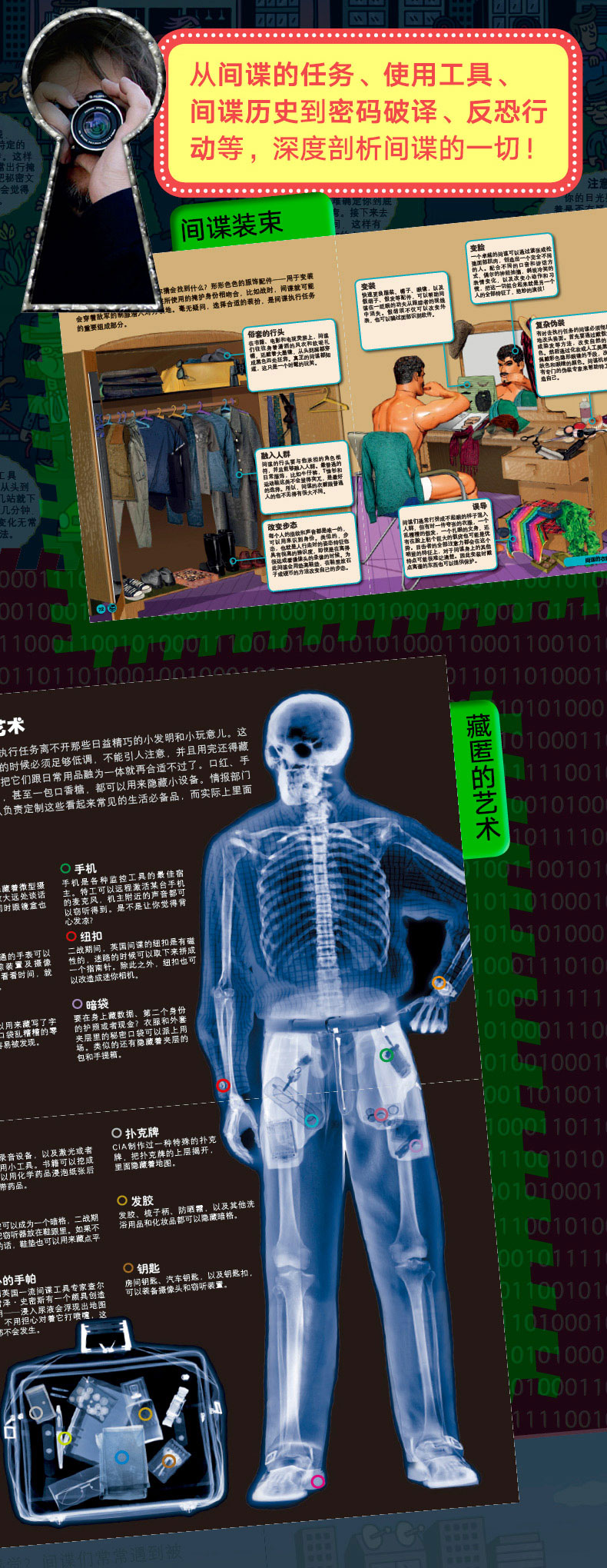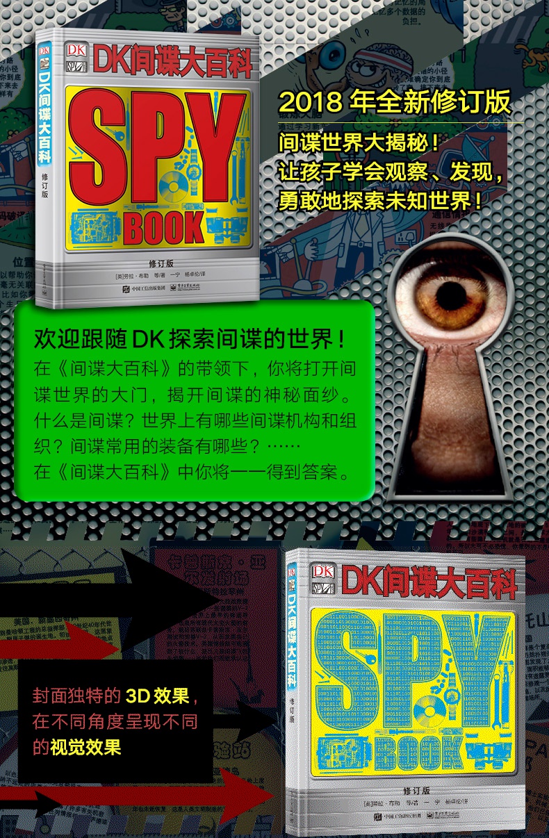 欢迎跟随DK探索间谍的世界!在《间谍大百科》的带领下,你将打开间谍世界的大门,揭开间谍的神秘面纱。什么是间谍?世界上有哪些间谍机构和组织?间谍常用的装备有哪些?……在《间谍大百科》中你将一一得到答案。你也可以从书中学到间谍活动中需要的一些小技巧。《间谍大百科》中丰富的插图和实拍图,让你直观且深刻的感受到间谍世界的刺激和惊险,了解间谍这个神奇的职业背后的故事和历史。幽默的文字和图片,融合历史、侦探、工具制造等各个方面,让你全方位了解间谍和间谍世界。