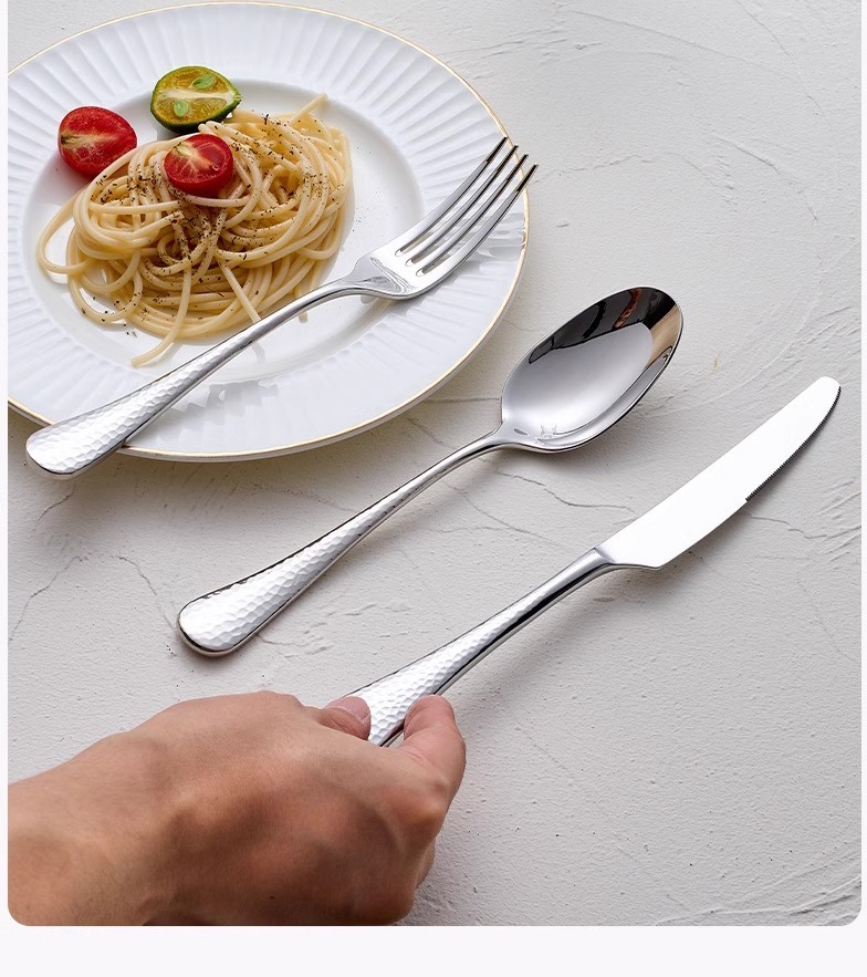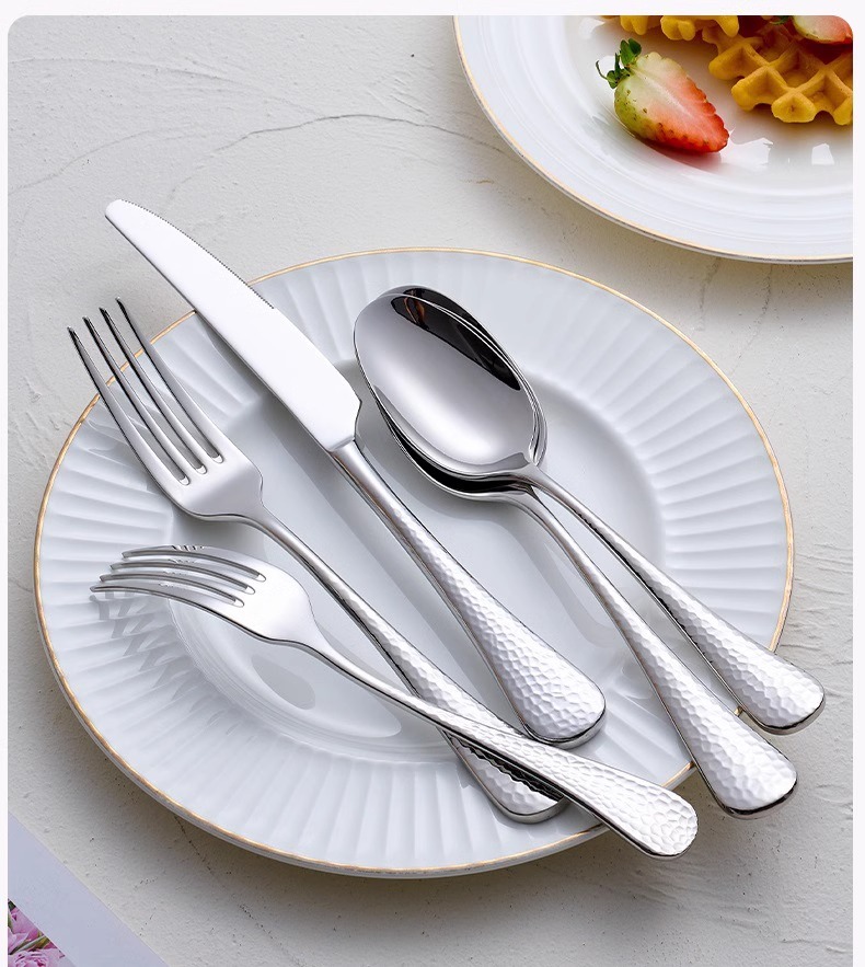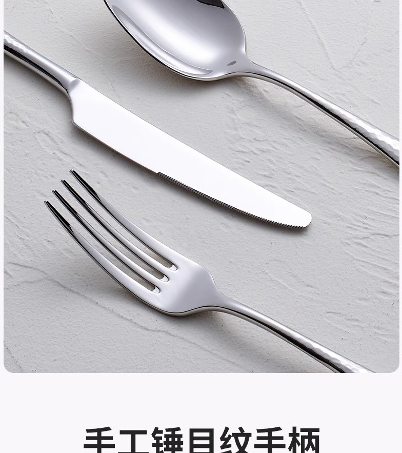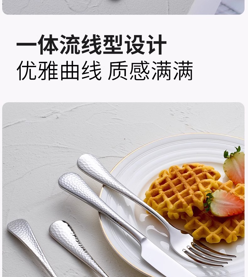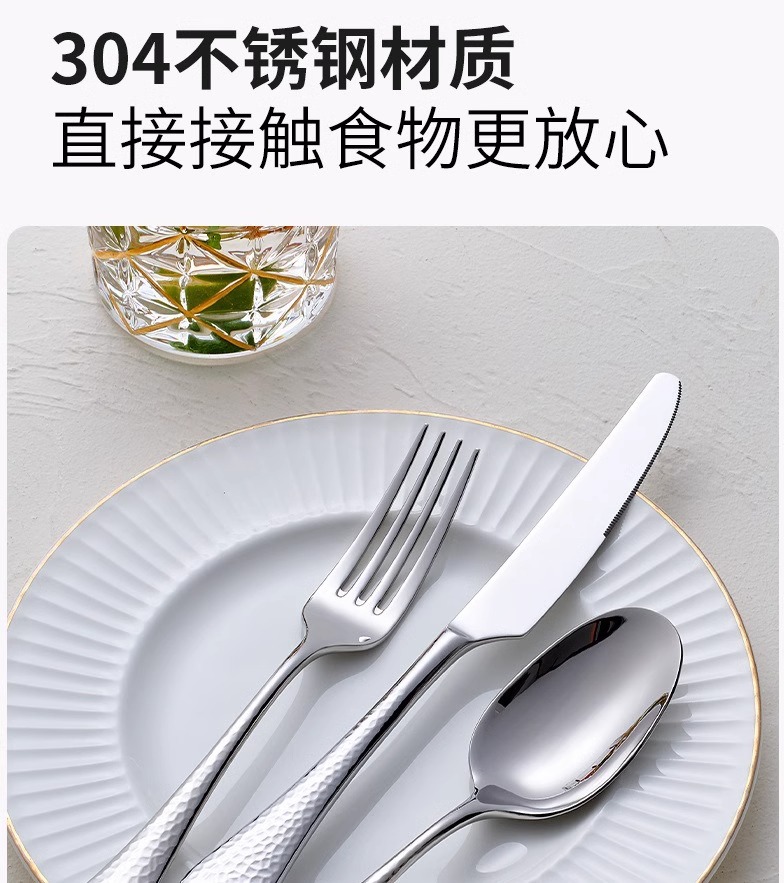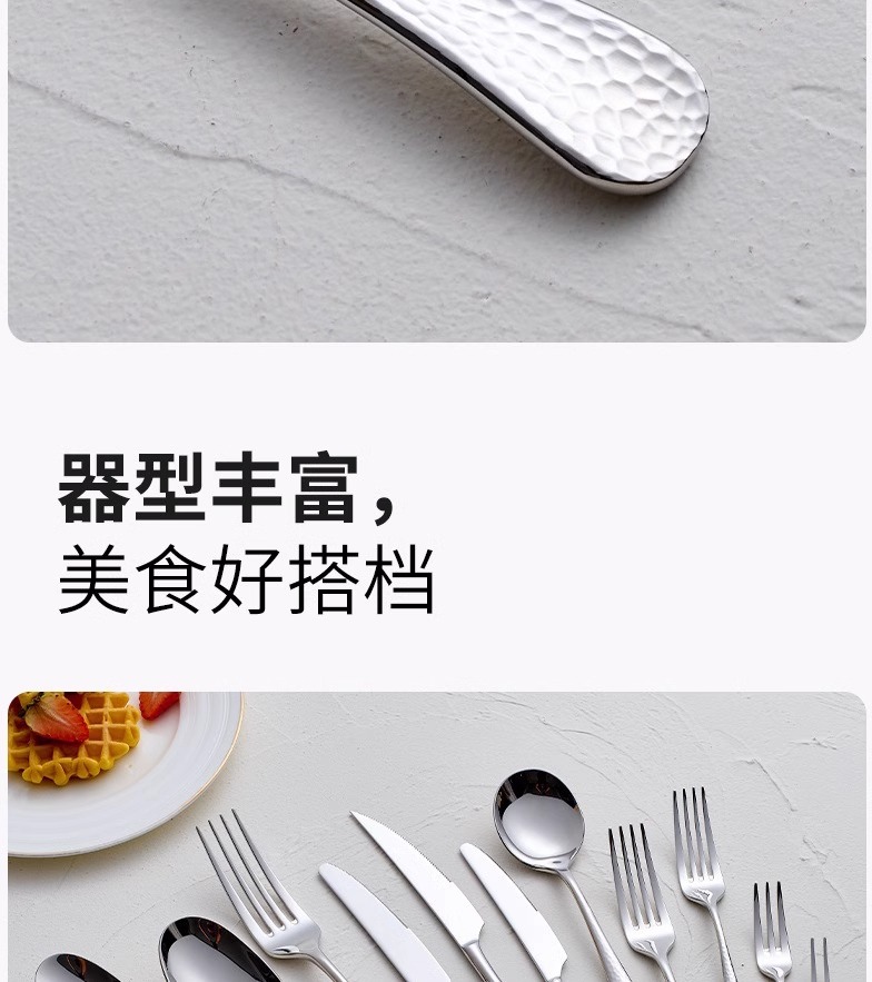 简约北欧风304不锈钢精抛锤纹西餐牛排刀叉勺子四件套装甜品餐具加州锤点原色系列