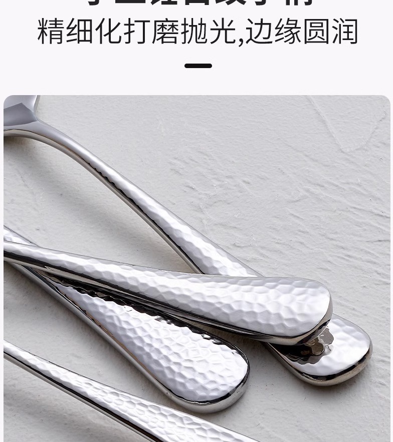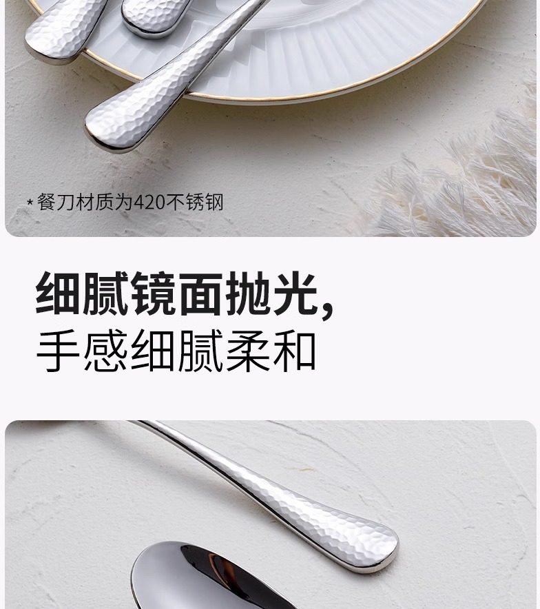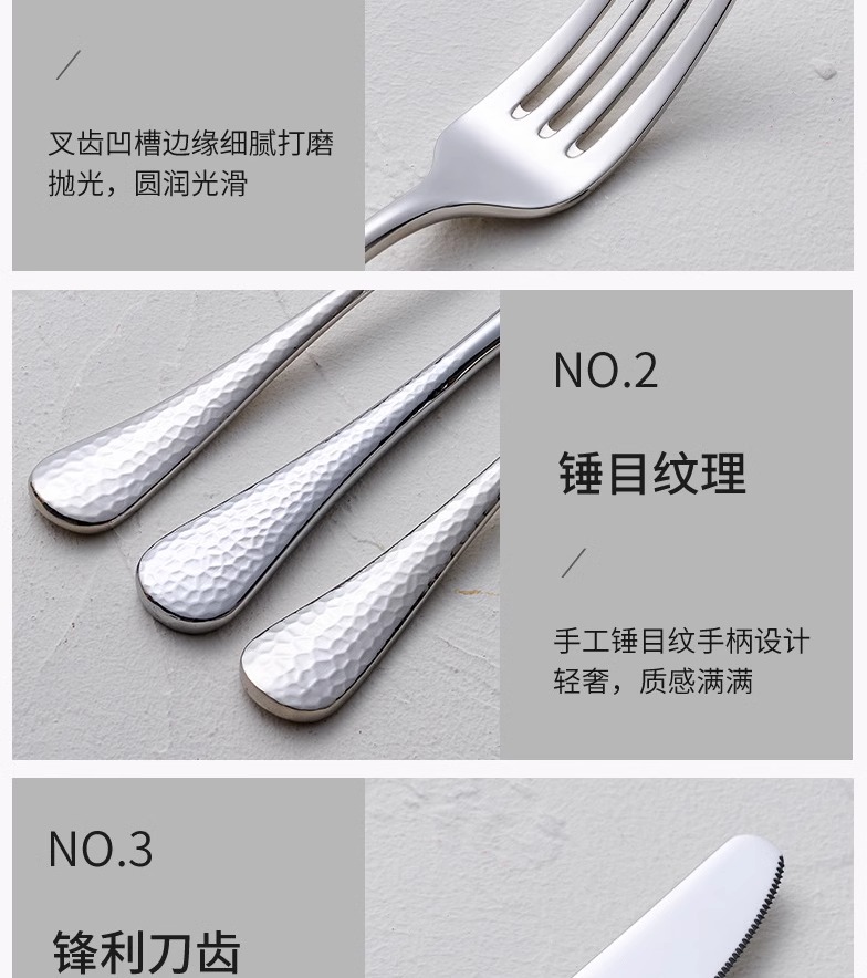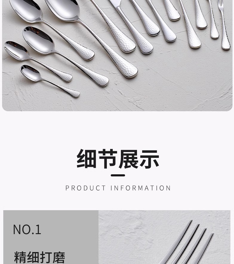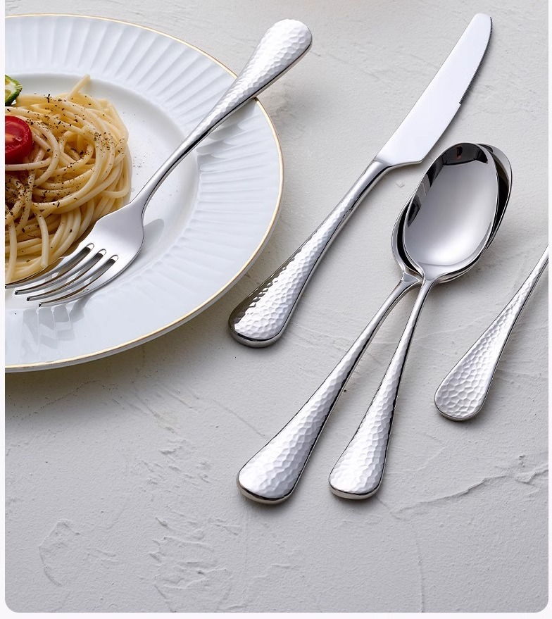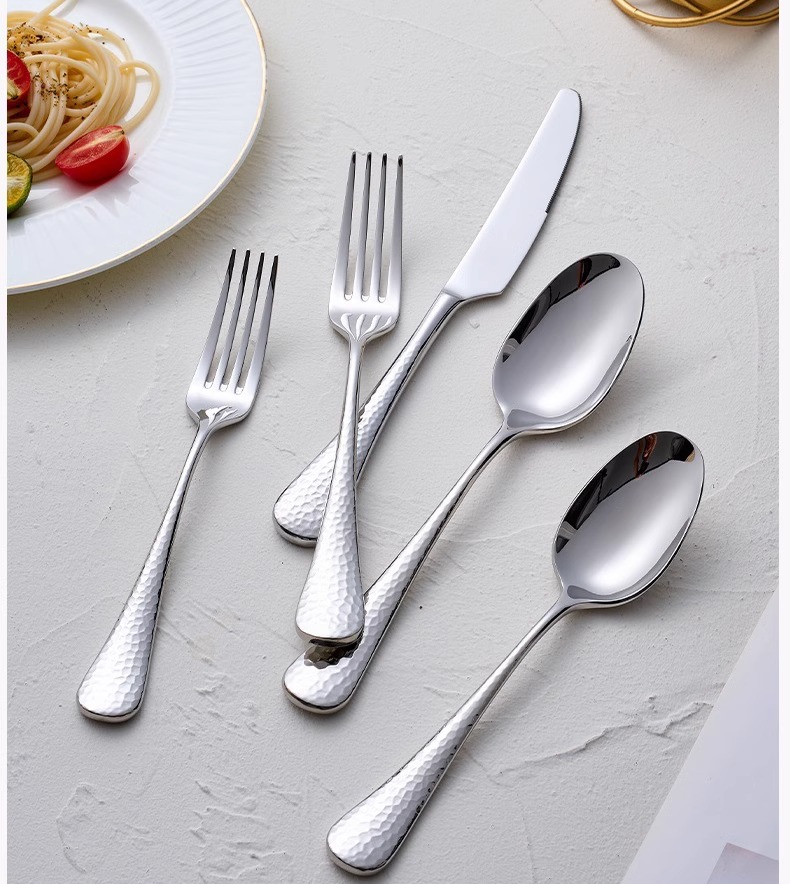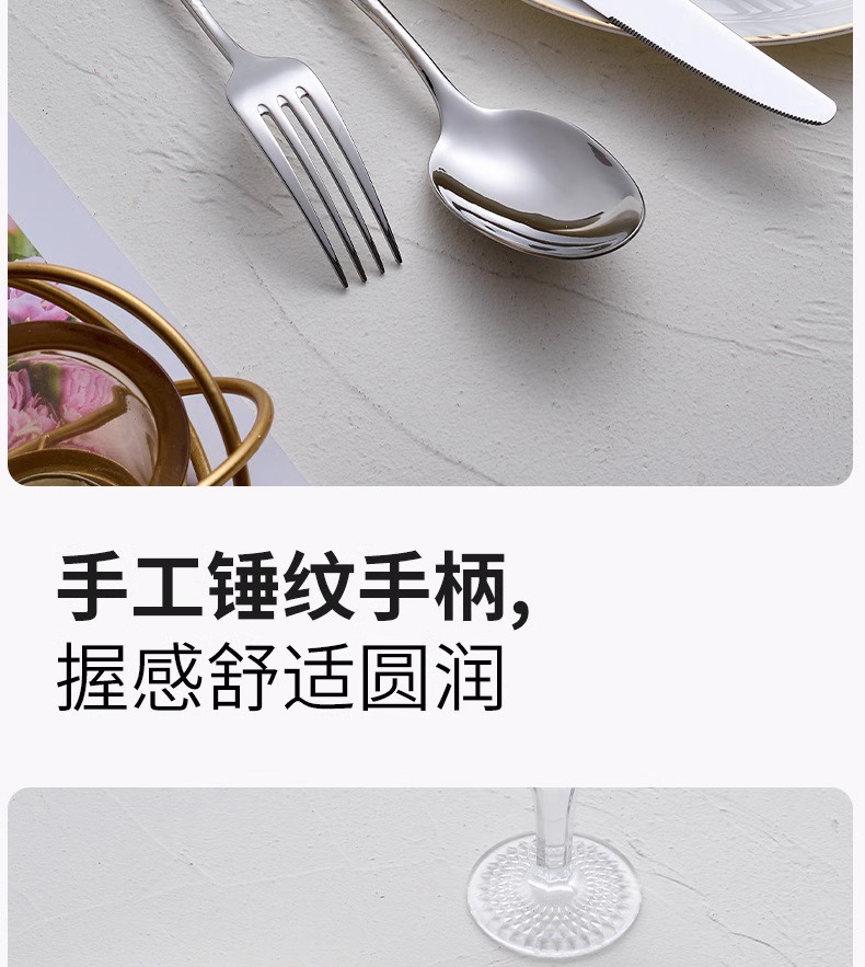 简约北欧风304不锈钢精抛锤纹西餐牛排刀叉勺子四件套装甜品餐具加州锤点原色系列