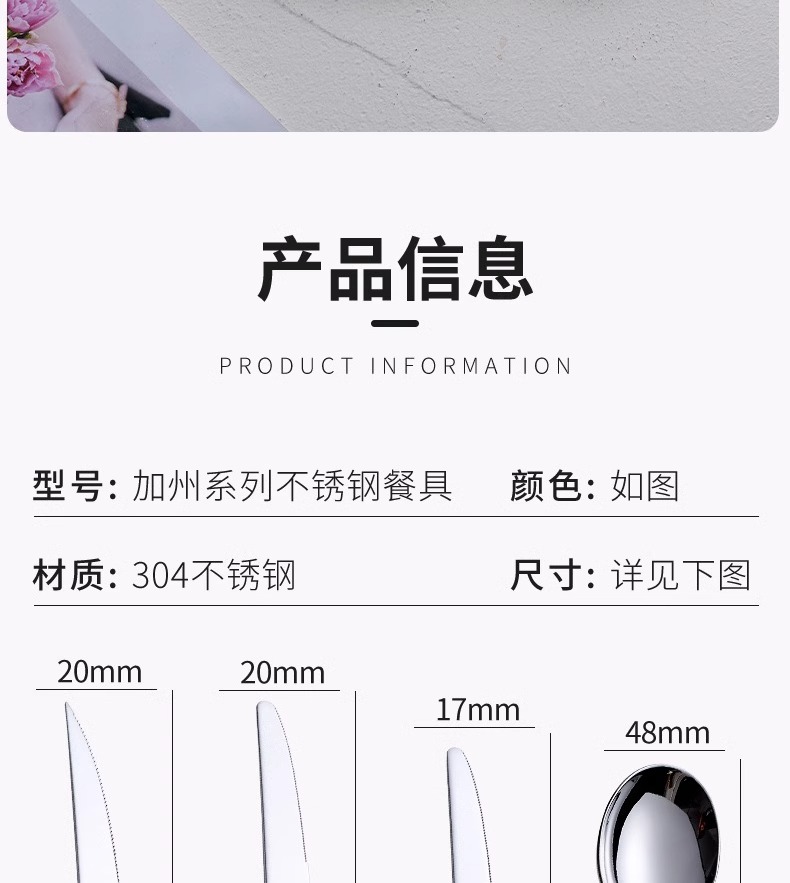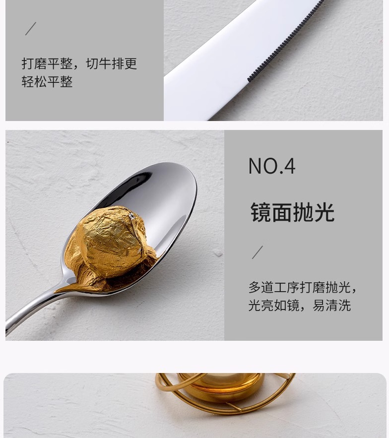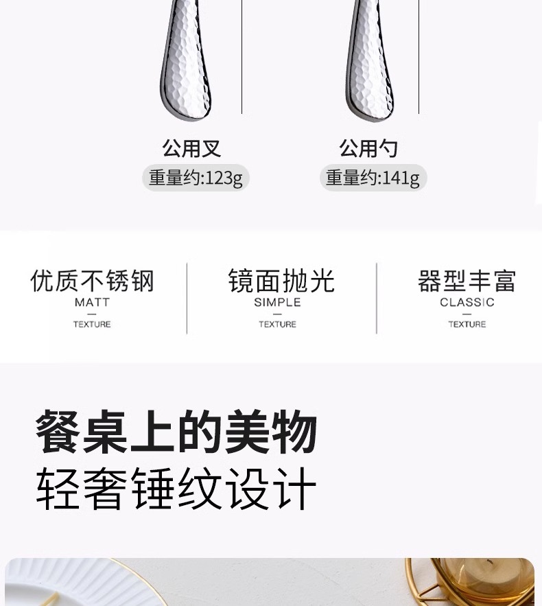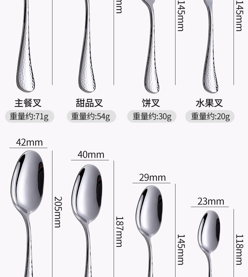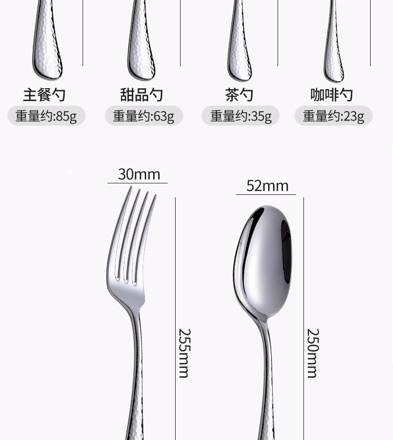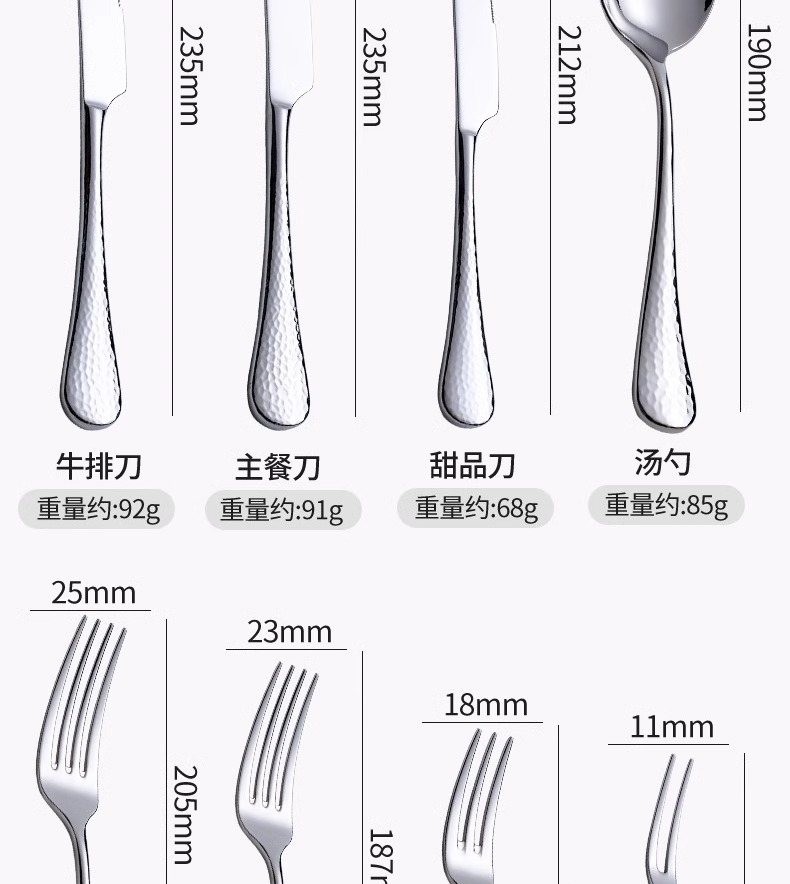 简约北欧风304不锈钢精抛锤纹西餐牛排刀叉勺子四件套装甜品餐具加州锤点原色系列