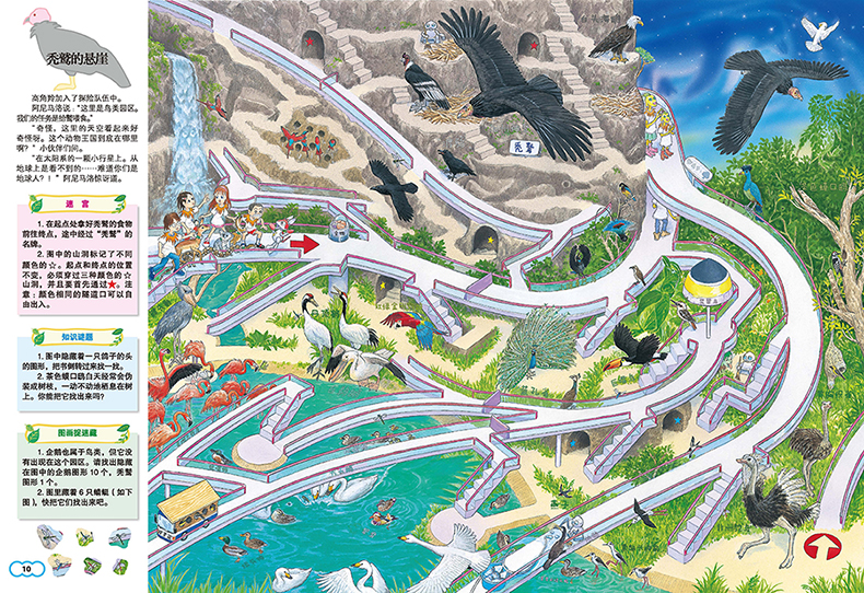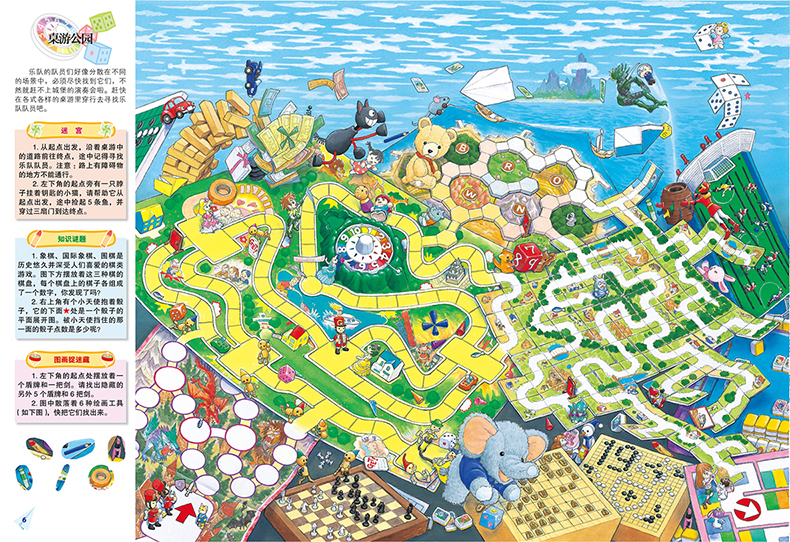 1.大型跨页迷宫图,同时配有简洁的场景说明。全书的说明文字连起来就是一个有趣的探险故事,让小读者们跟着迷宫一起捉迷藏。