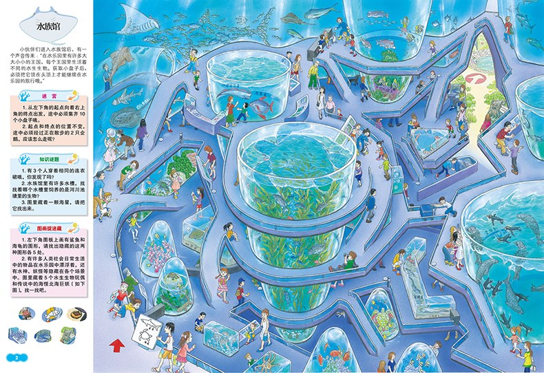 2. 每个巨幅大图中设计了两个不同难度的大迷宫:根据箭头的指示和迷宫规则,找出距离最近且畅通无阻的路径。
