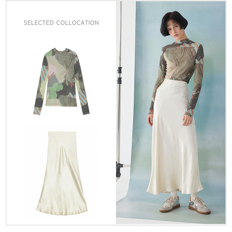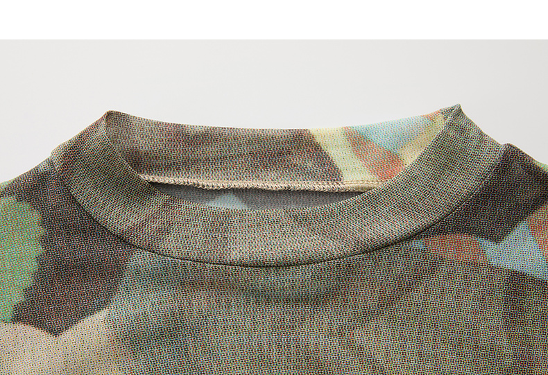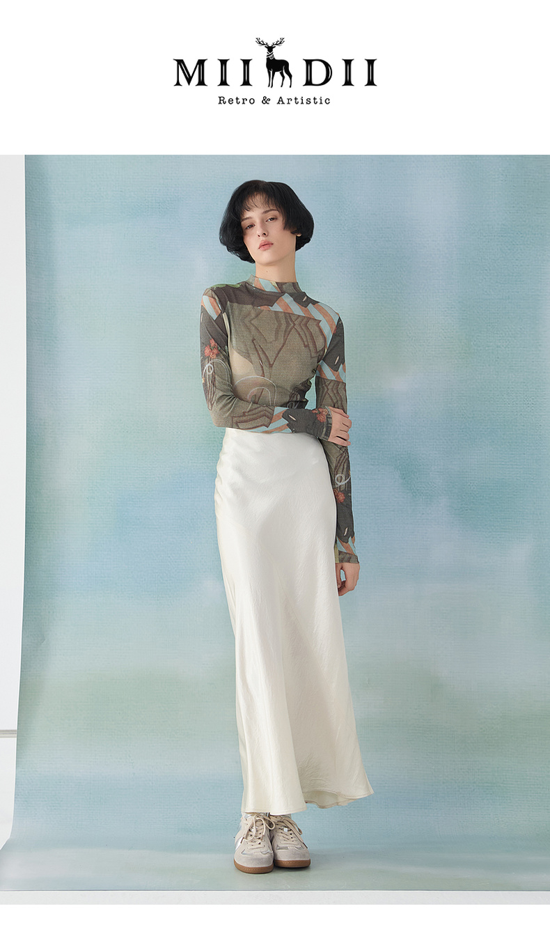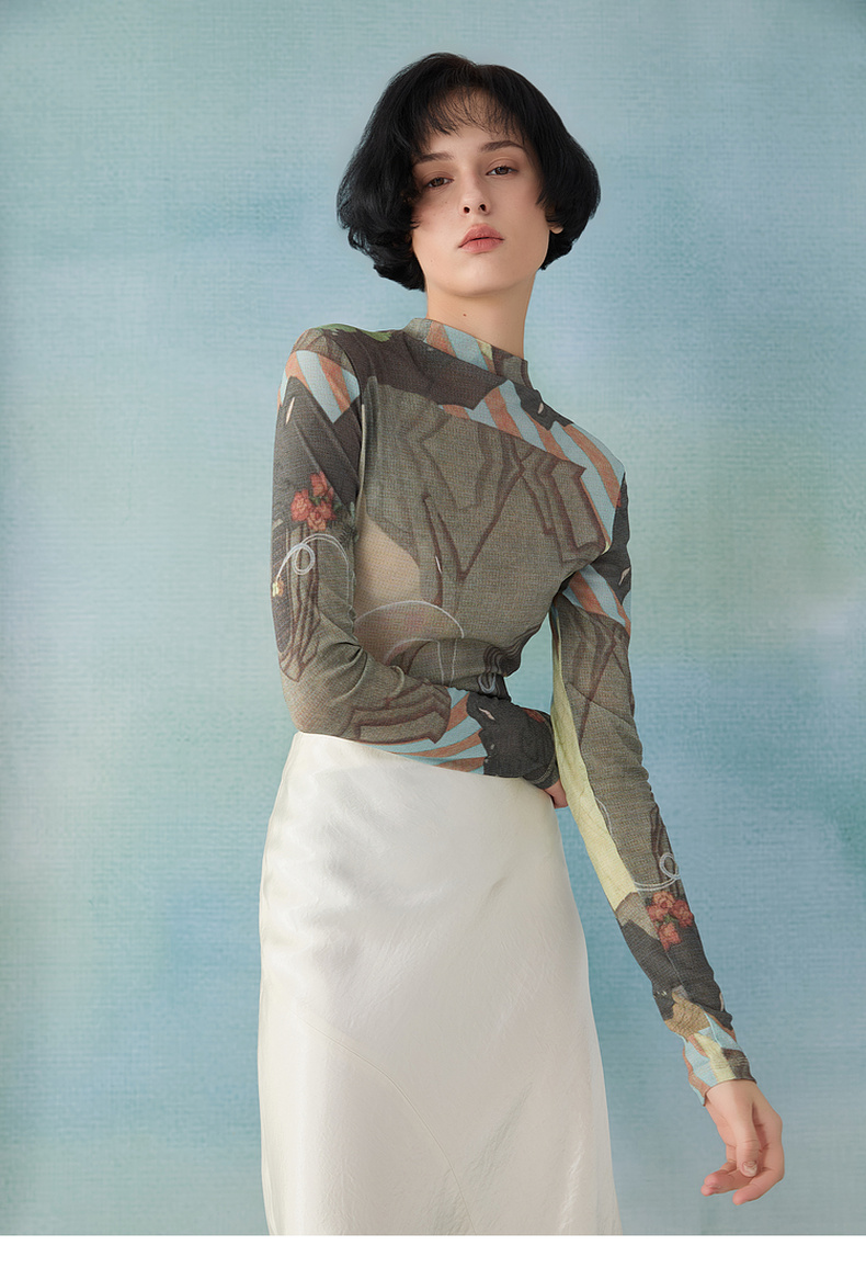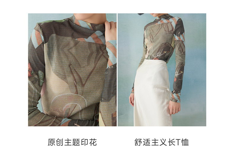 谜底印花高弹打底衫长袖女2025春新品文艺风网纱上衣T恤251MT0145