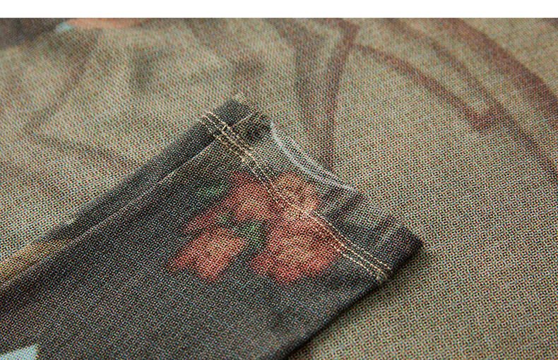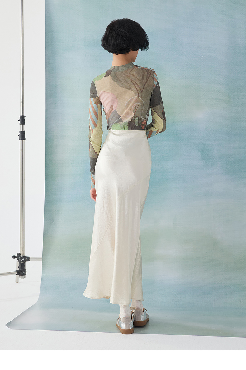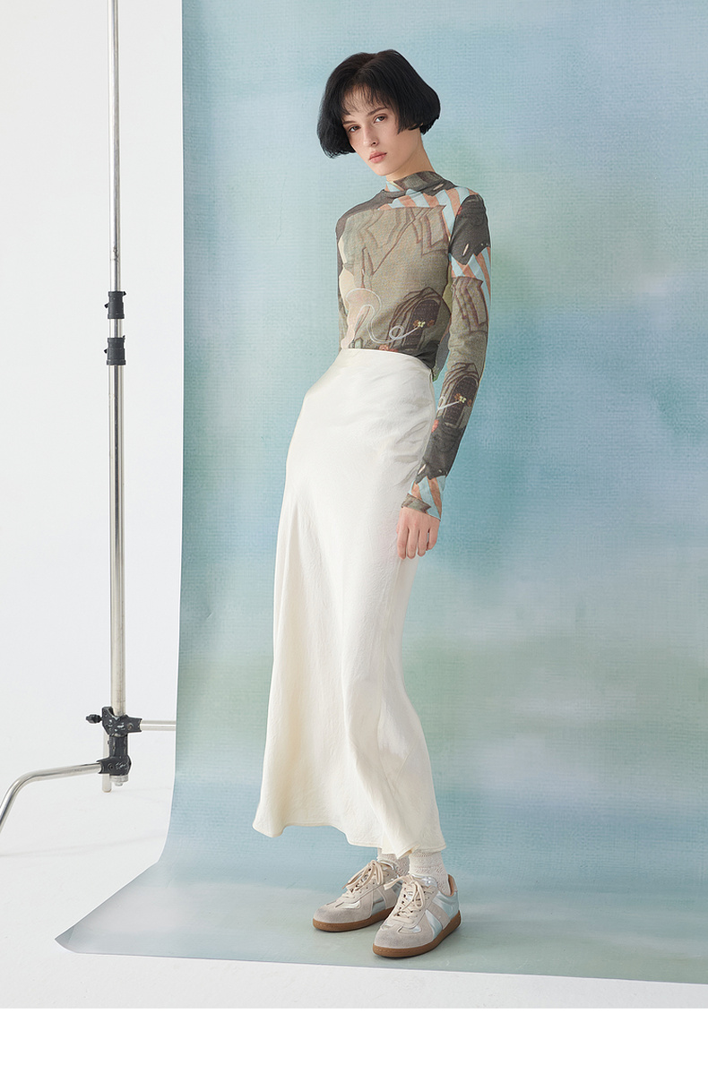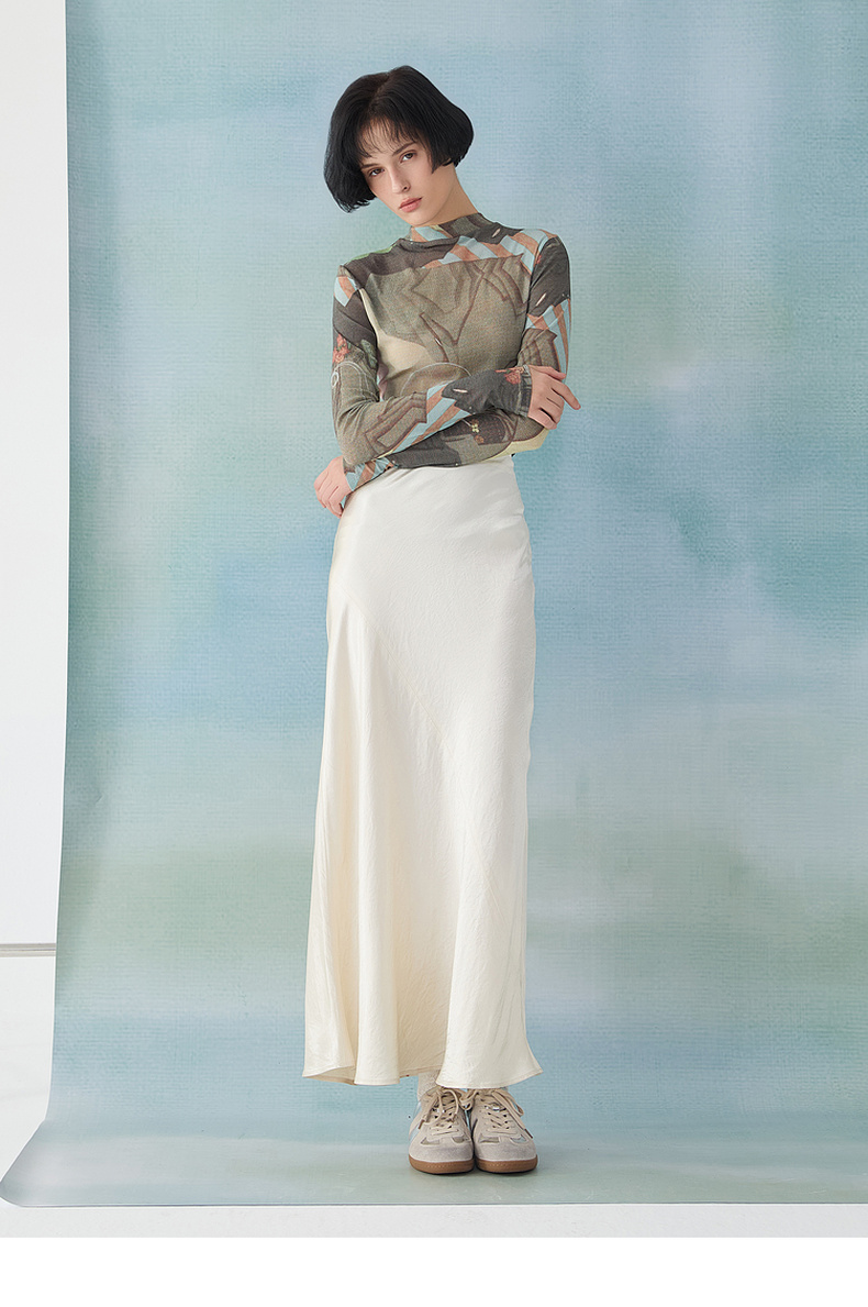 谜底印花高弹打底衫长袖女2025春新品文艺风网纱上衣T恤251MT0145