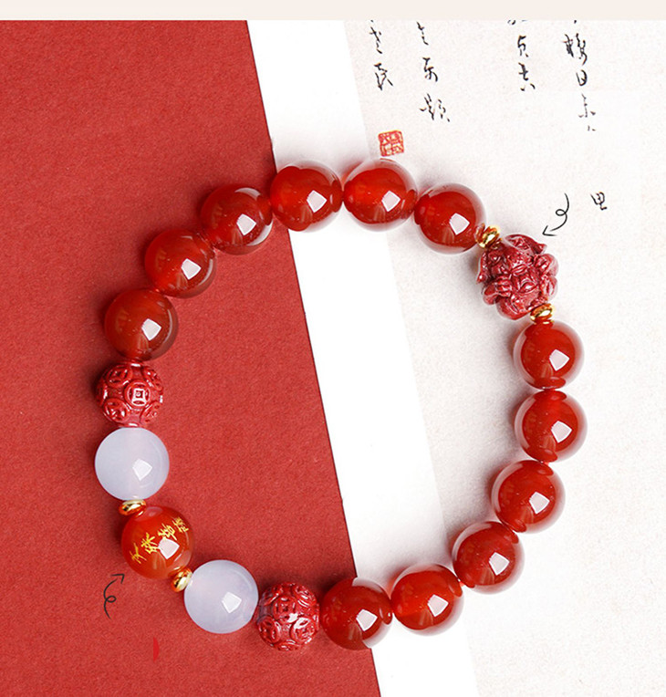 注:两颗铜钱和生肖是朱砂珠子,白色的是玉髓珠子,其他红色的是玛瑙哦~