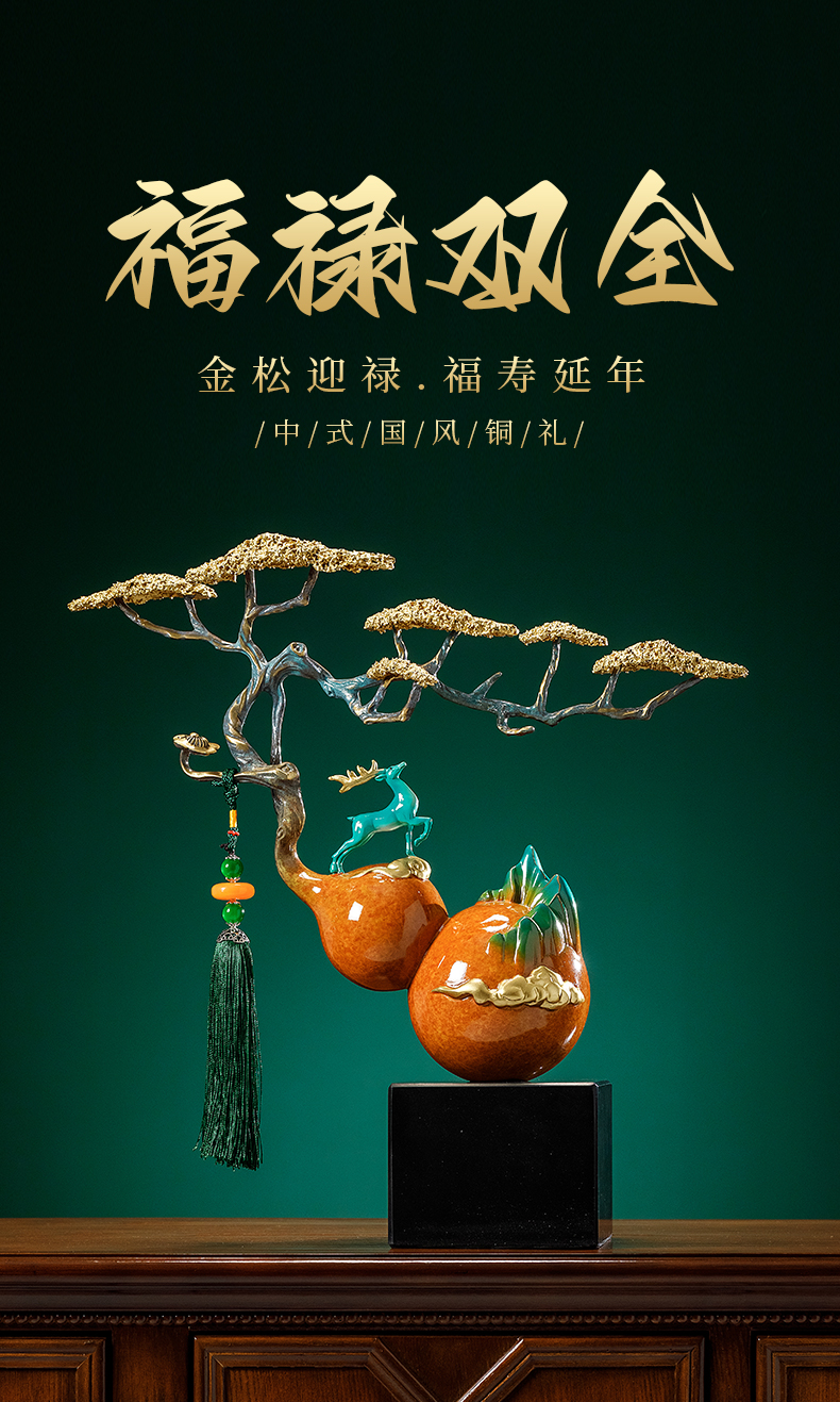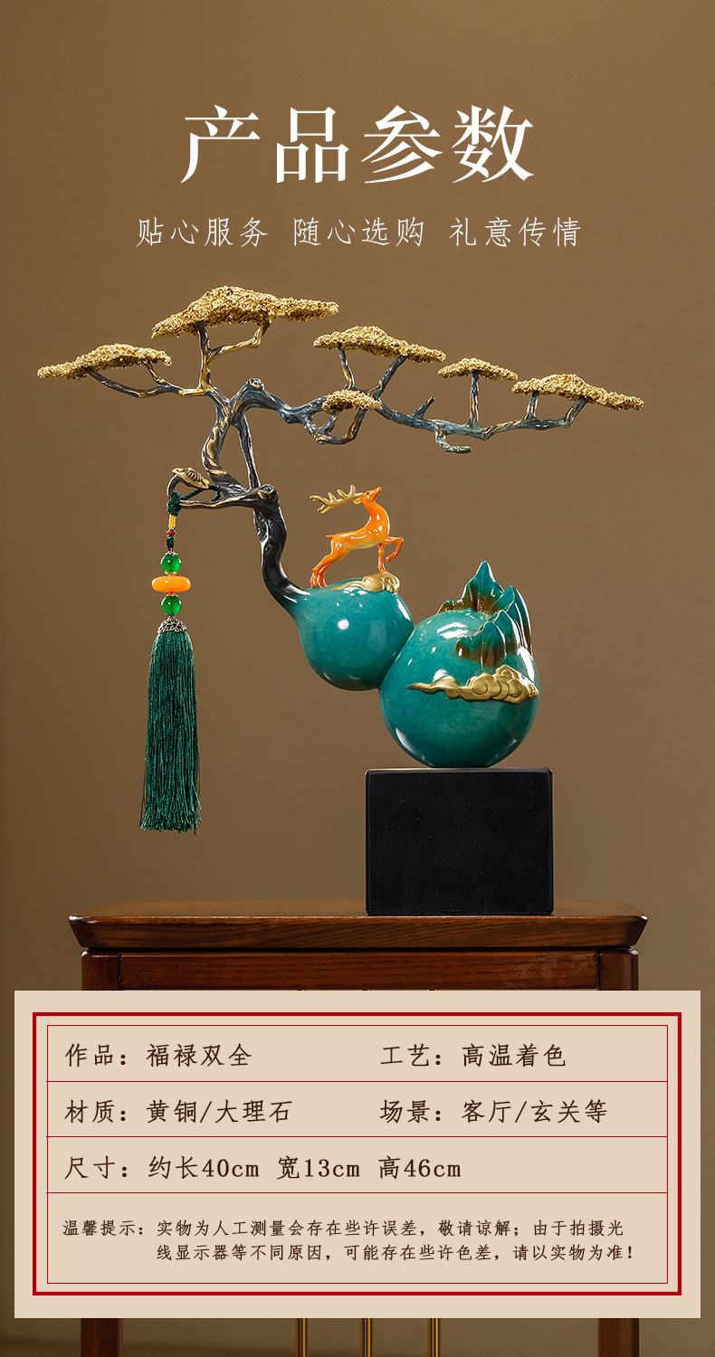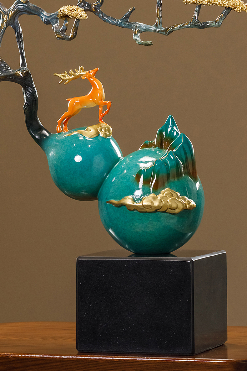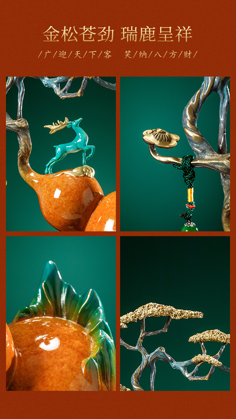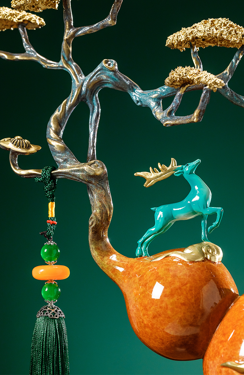 E-QK-BJ1326A/B 福来禄来(绿色/黄色)铜葫芦鹿摆件小号