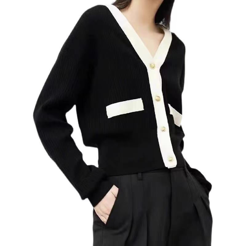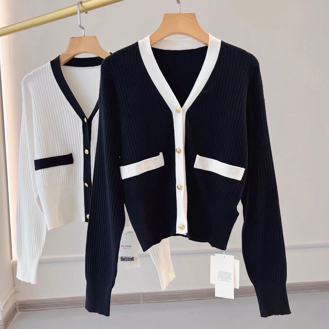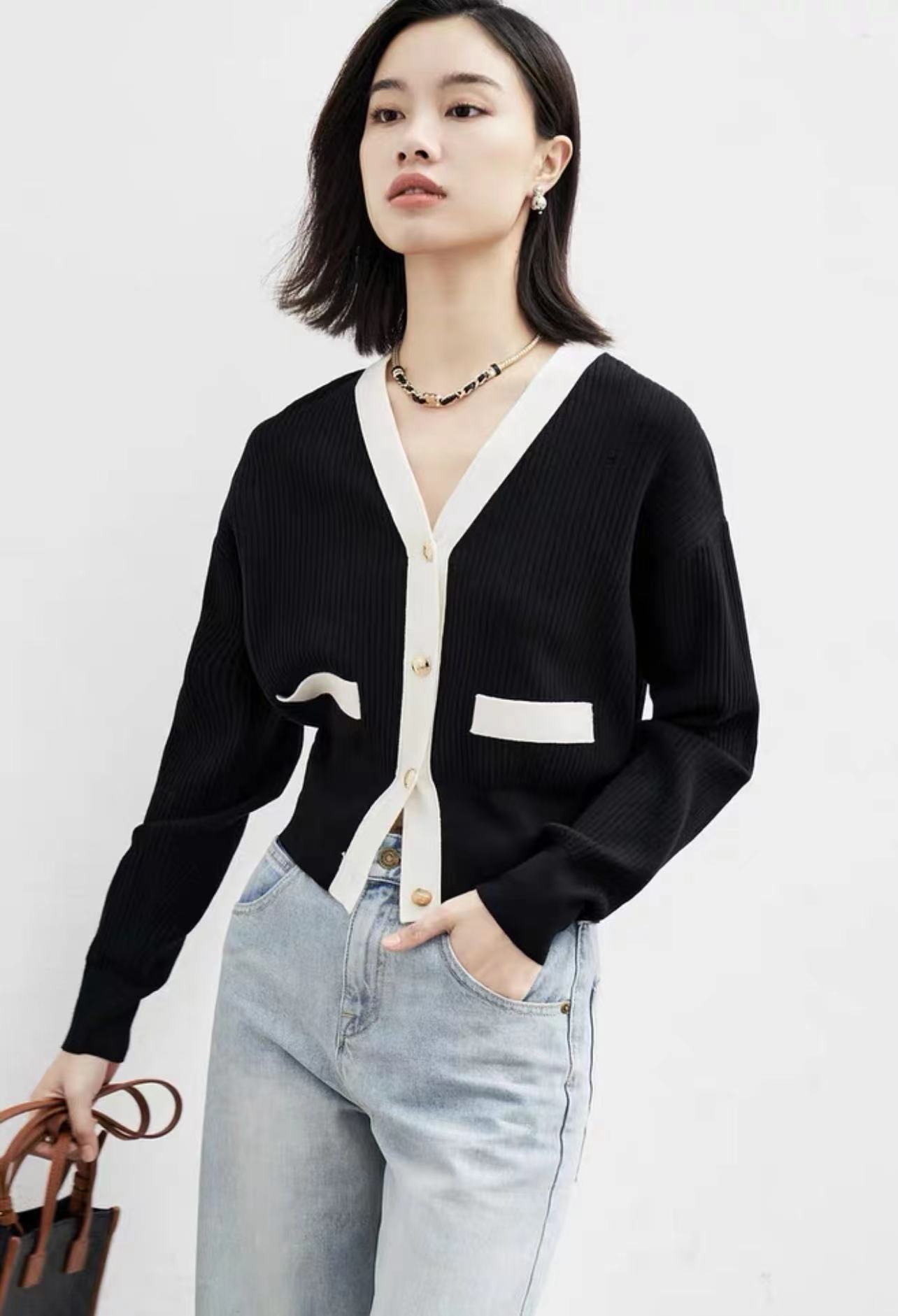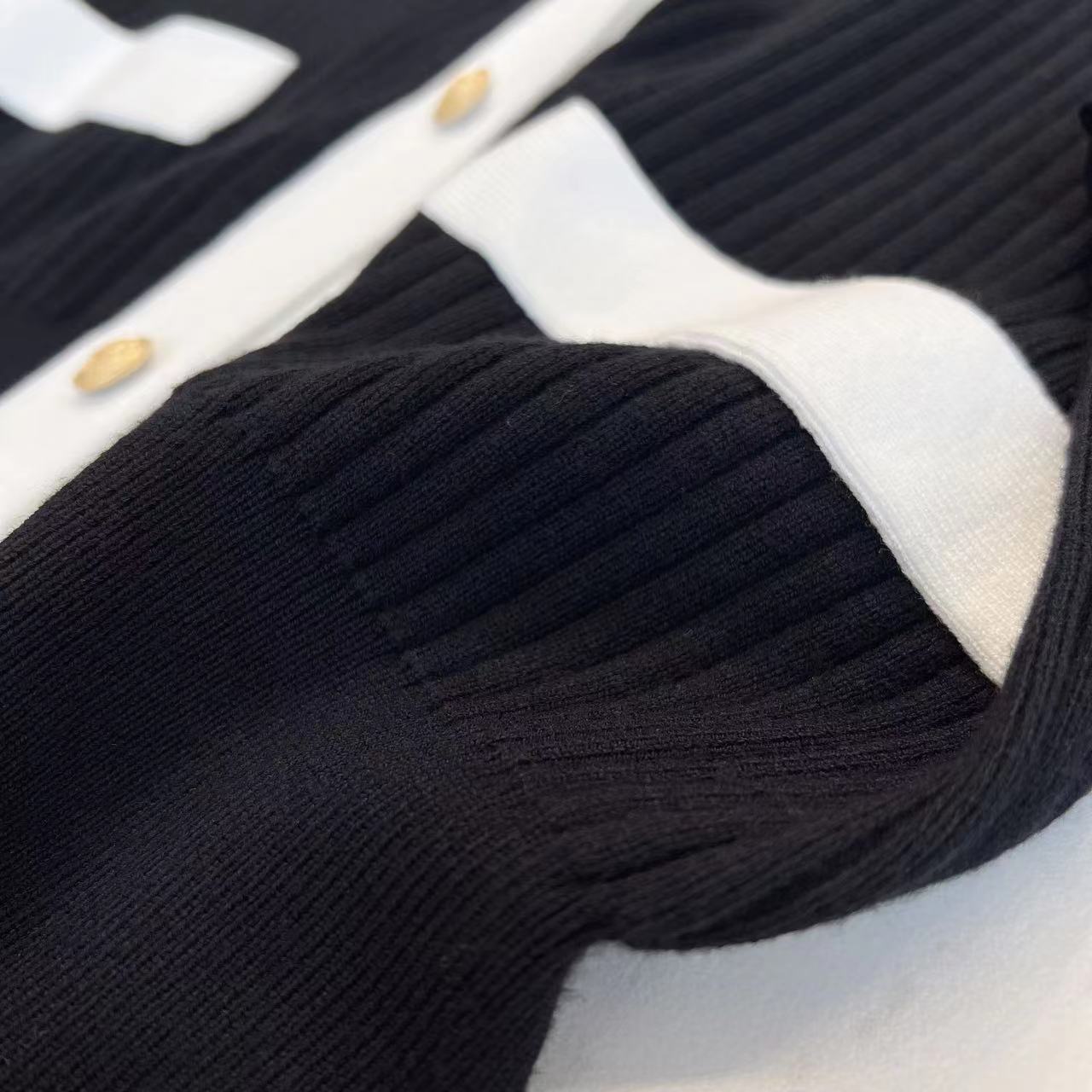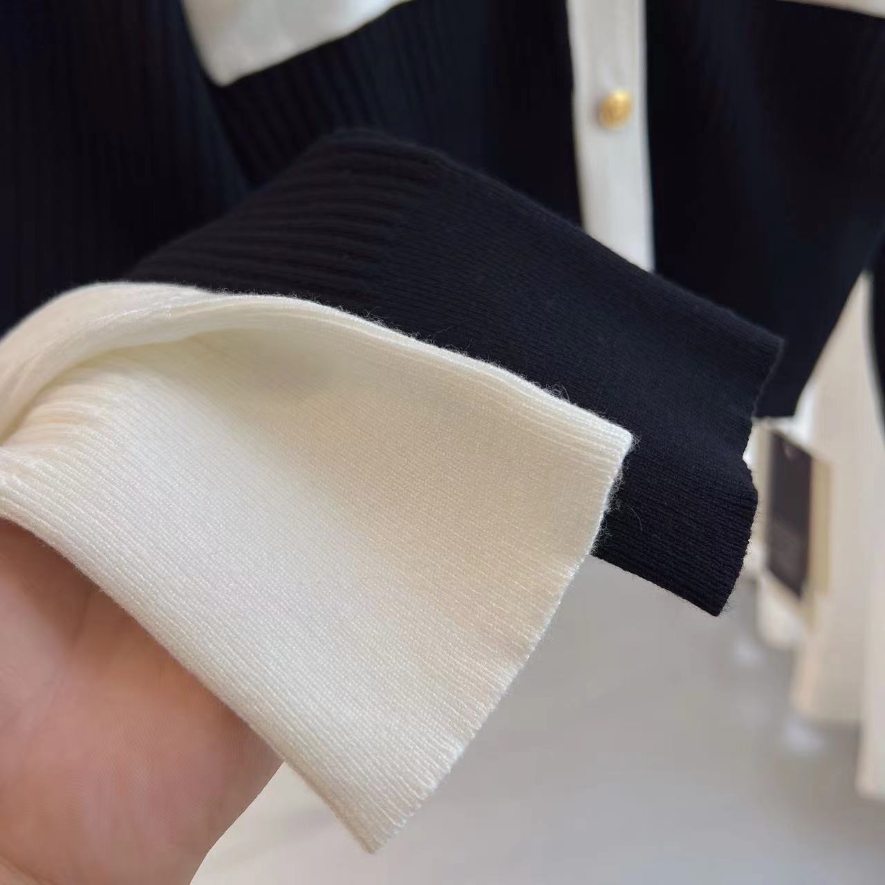 商品名称:小香拼色针织开衫(黑色/米色)均码