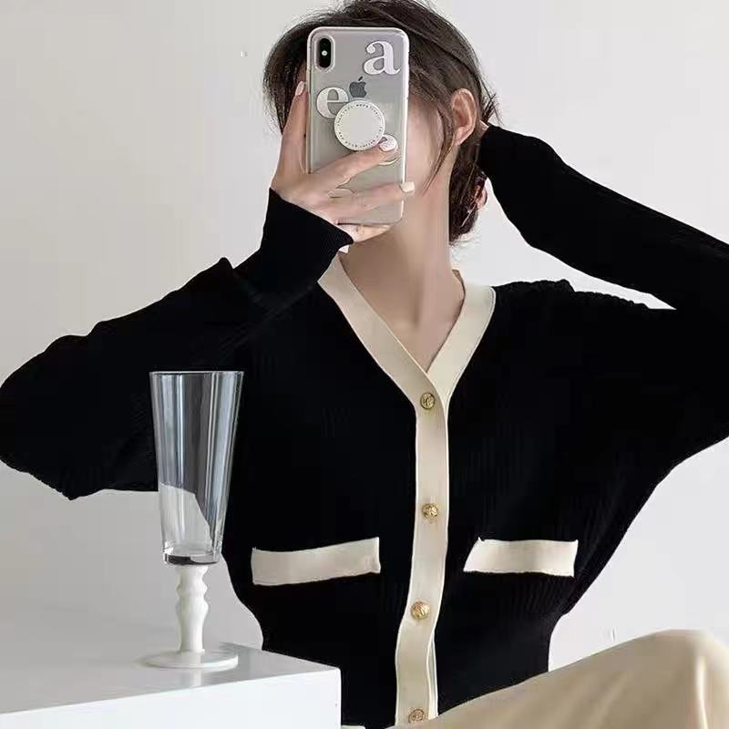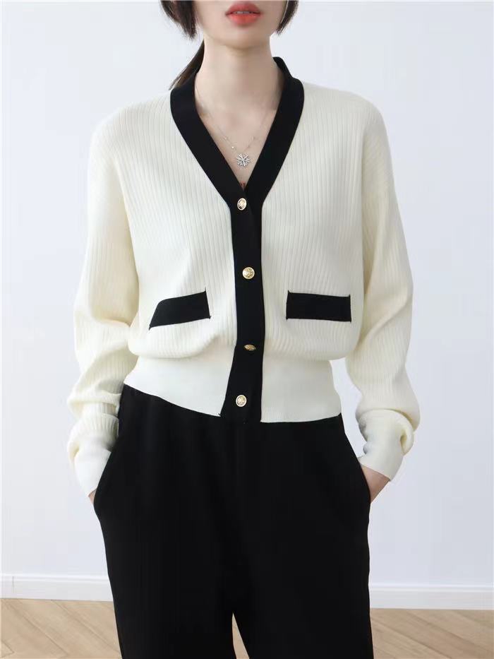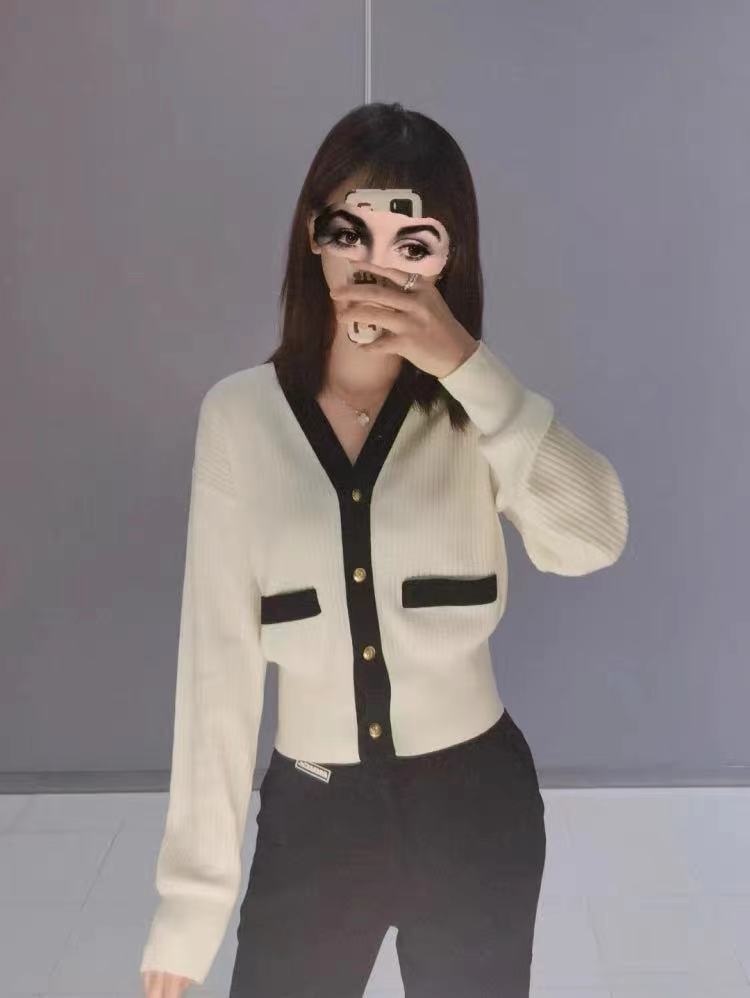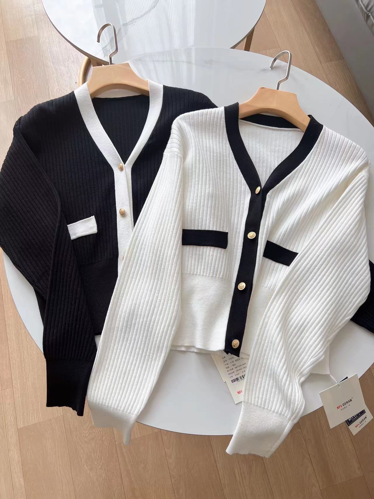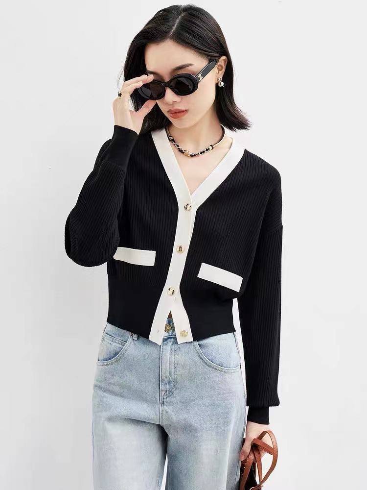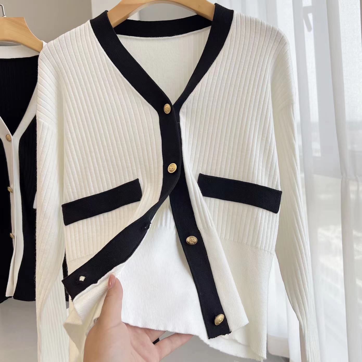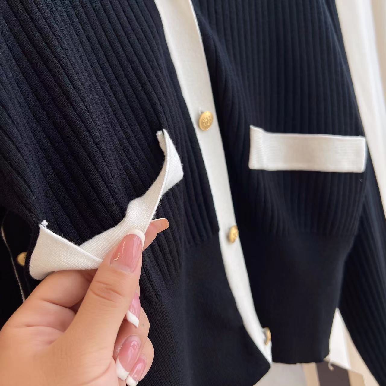 商品名称:小香拼色针织开衫(黑色/米色)均码
