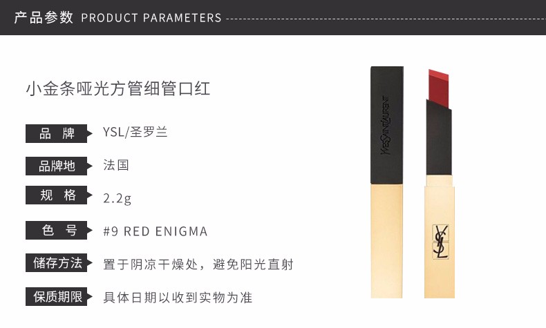 YSL圣罗兰 小金条哑光方管细管口红 #9 RED ENIGMA 法国
