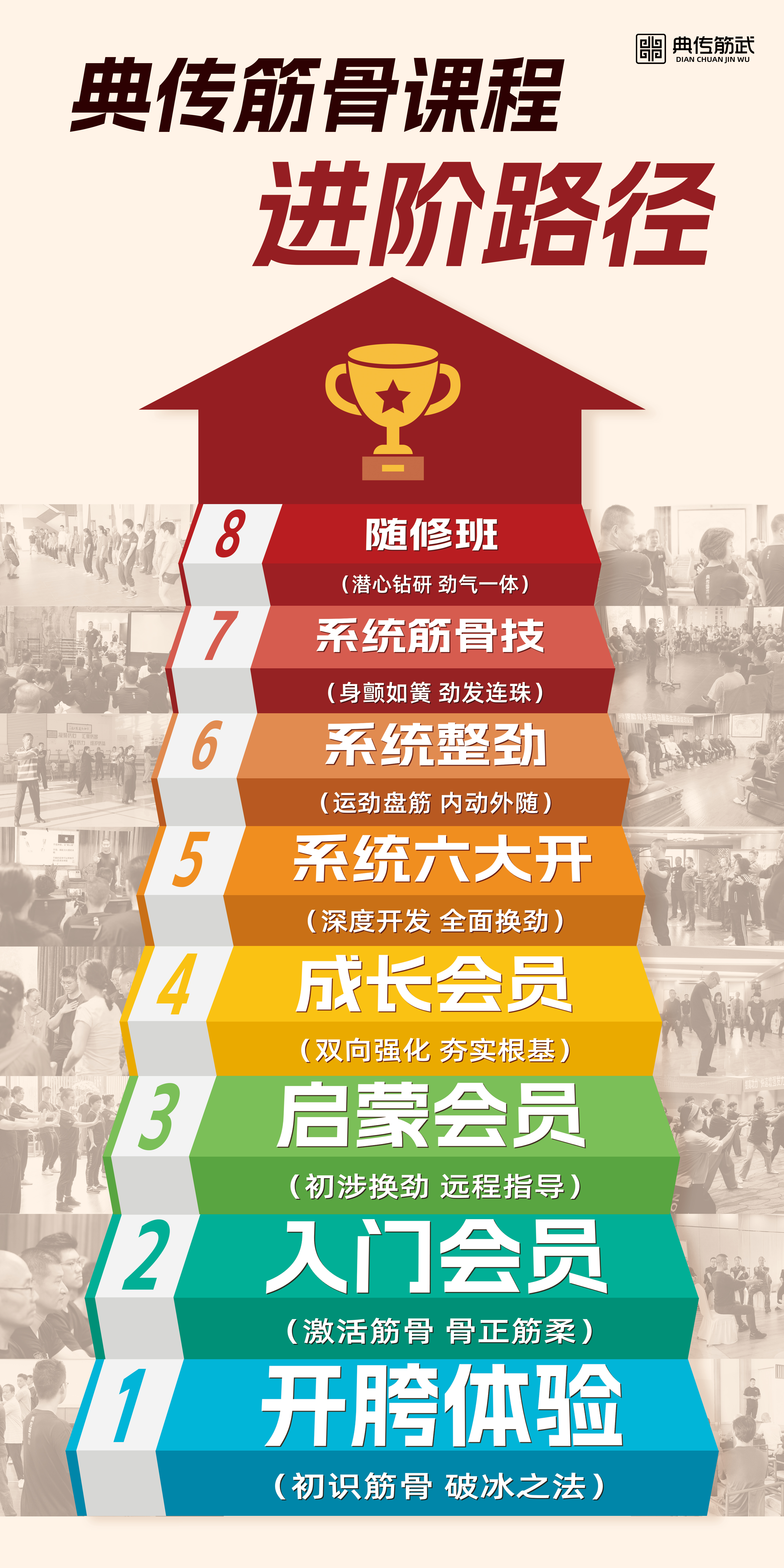 典传筋骨,传承于中华武术训练体系最精华部分,与解剖学、人体力学等科学理论相融合,致力于人体筋骨结构的内在开发与强化,为健康打下坚实基础。