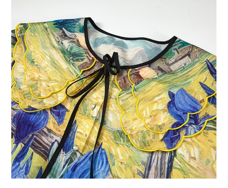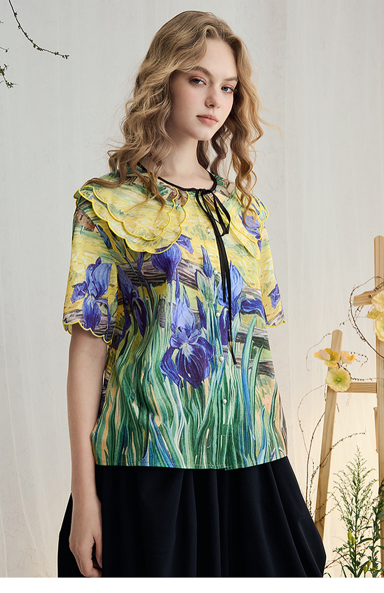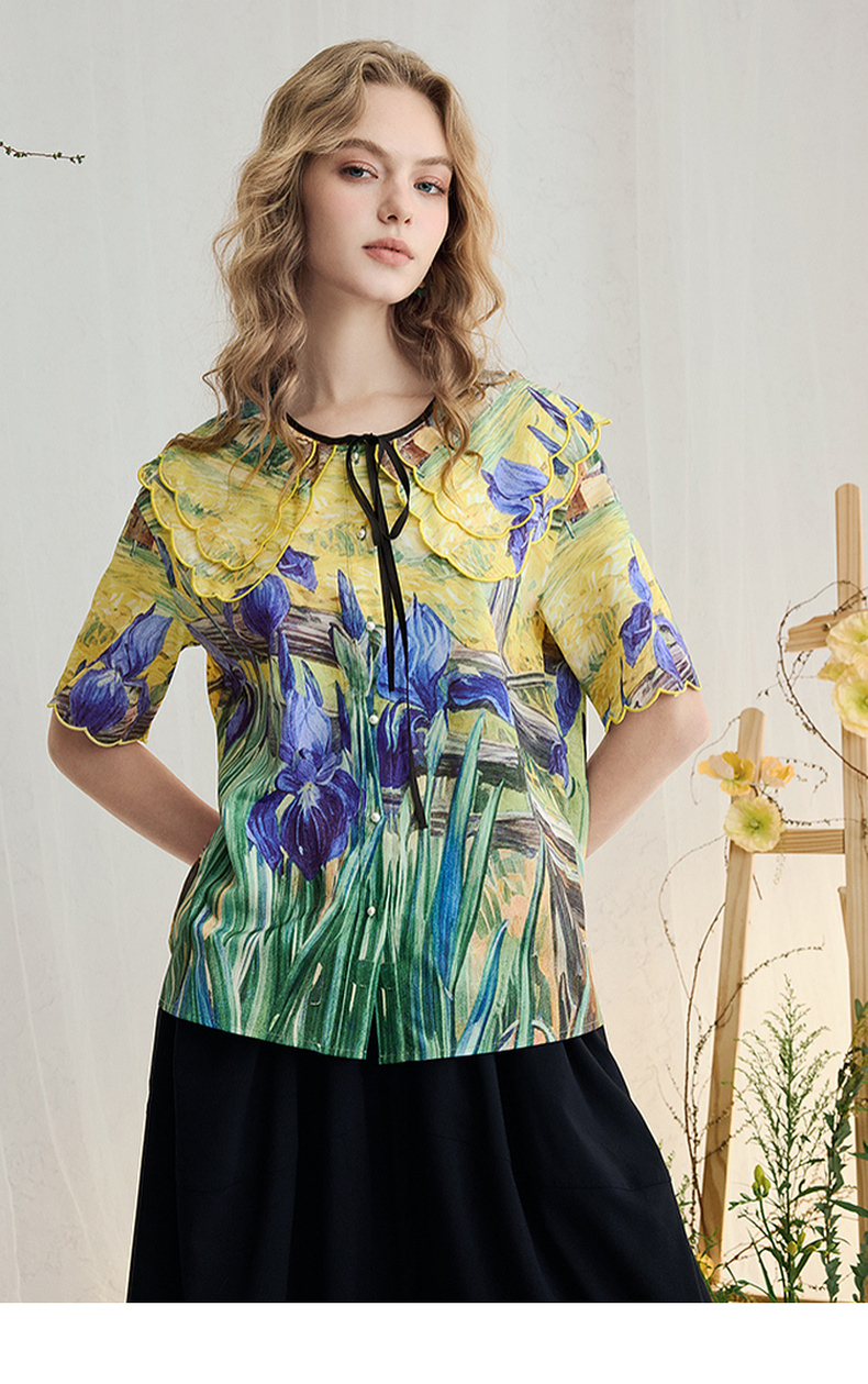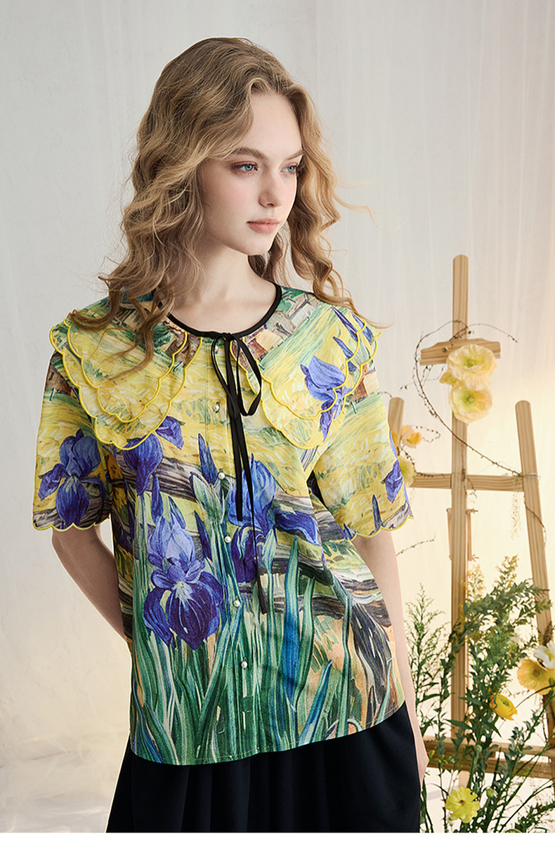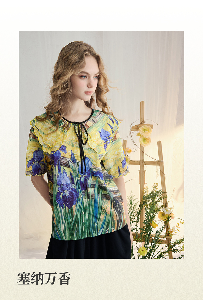 两三事梵高文艺塞纳万香2025夏季新款油画印花双层领绑带雪纺衫女