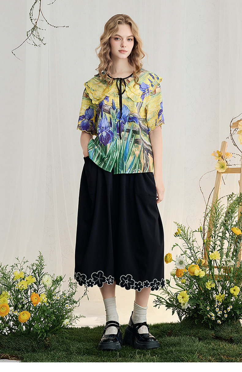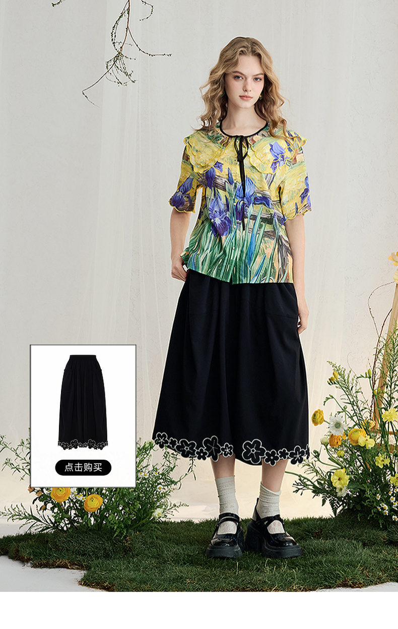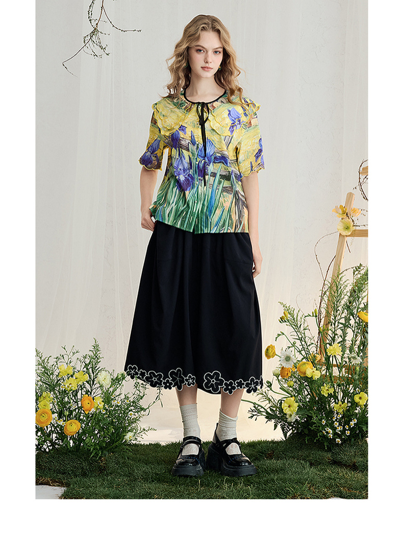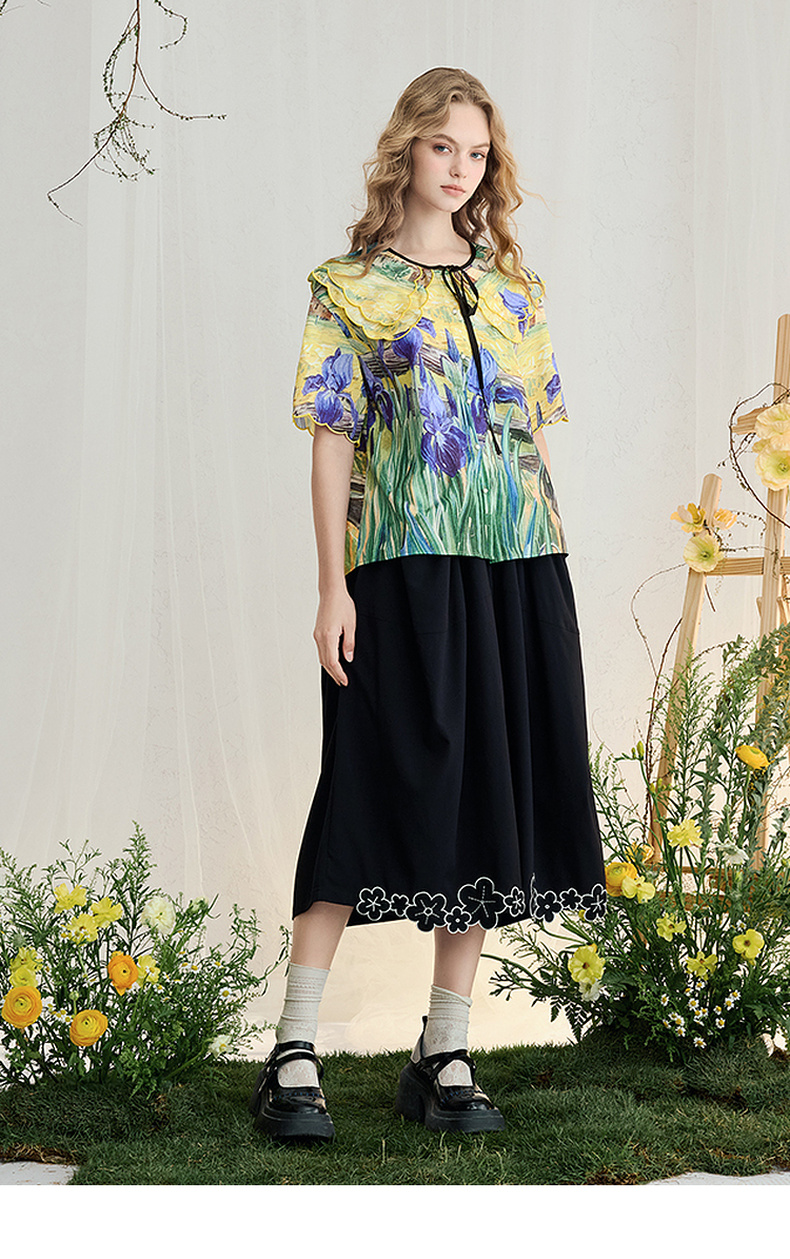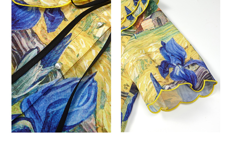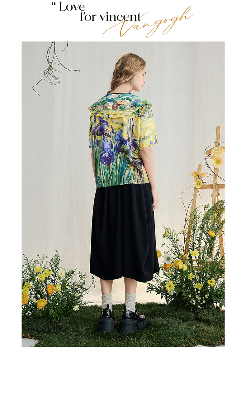 两三事梵高文艺塞纳万香2025夏季新款油画印花双层领绑带雪纺衫女