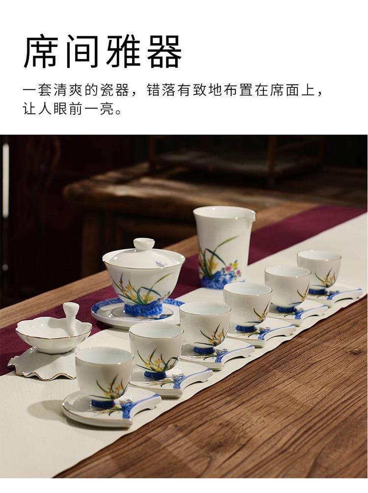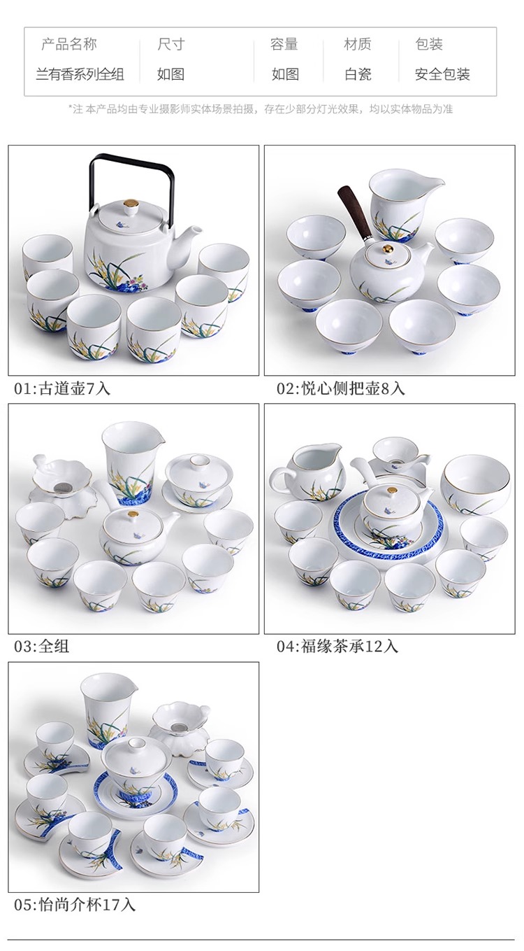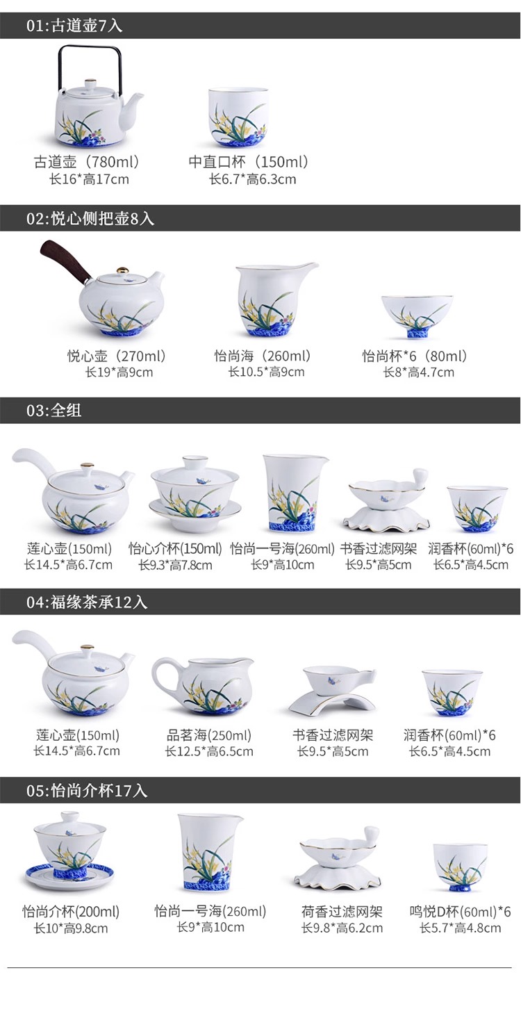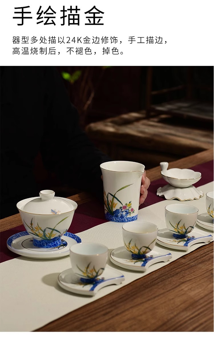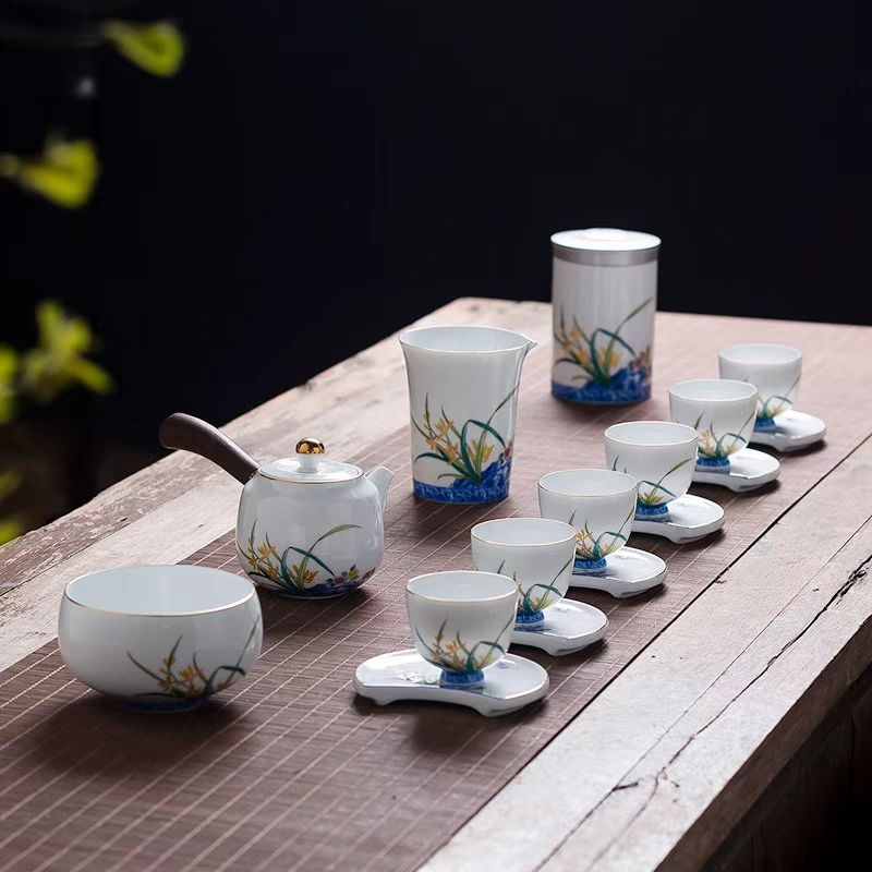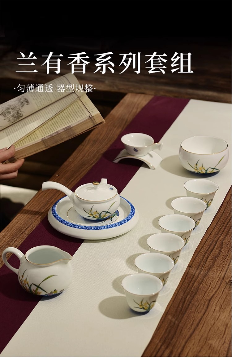 【特惠6折】高温白瓷兰花品茗杯陶瓷茶杯功夫茶具男主人杯手绘盖碗茶壶茶配件成艺兰有香缘心侧把壶16入
