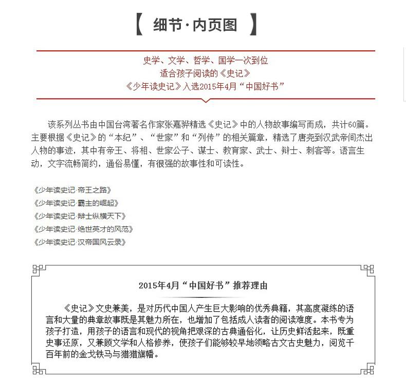 该系列丛书由台湾著名作家张嘉骅精选《史记》中的人物故事编写而成,共计60篇。主要根据《史记》的“本纪”、“世家”和“列传”的相关篇章,精选了唐尧到汉武帝间杰出人物的事迹,其中有帝王、将相、世家公子、谋士、教育家、武士、辩士、刺客等。语言生动,文字流畅简约,通俗易懂,有极强的故事性和可读性。