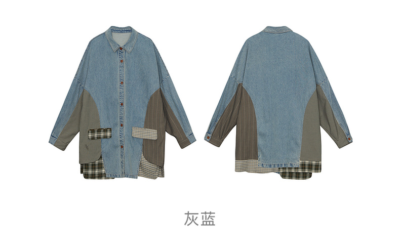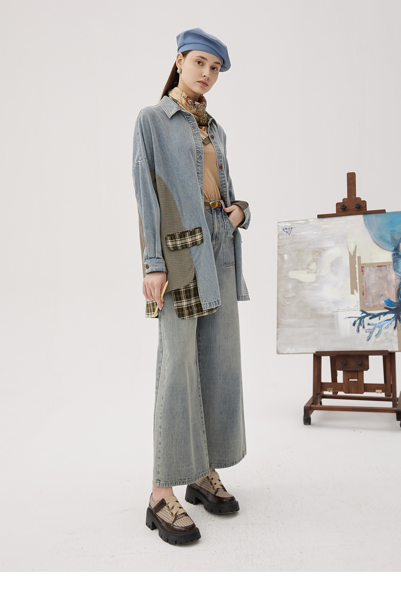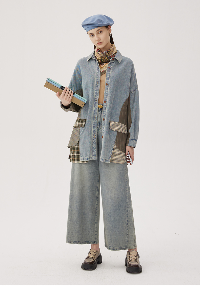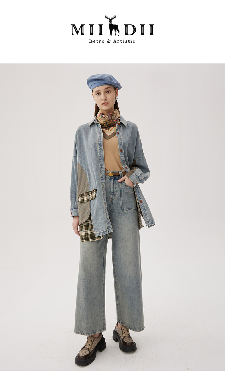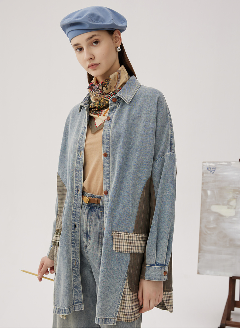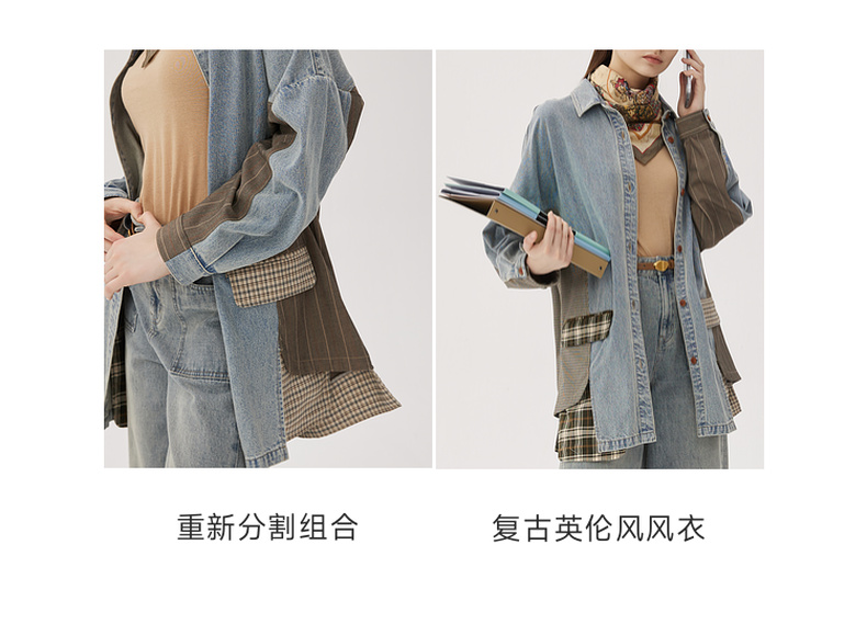 谜底衬衫式牛仔风衣女2024秋新品复古风拼接中长款外套243ME1141