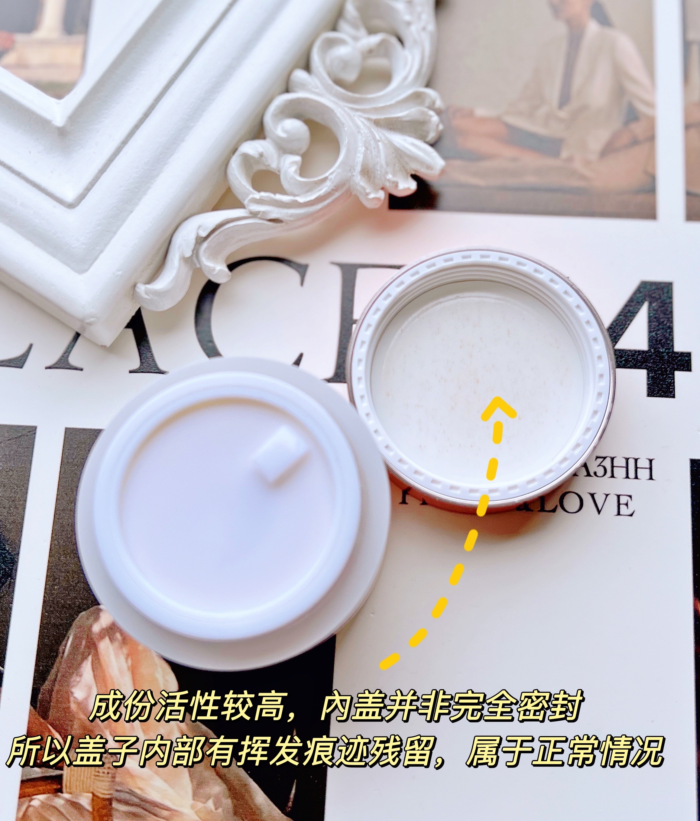 注意:面霜中含有活性成分,内盖又不密封的,所以蒸发到盖子内部会产生黄色点点的结晶,是正常现象哈,不是人为造成的污渍,不要误会了。对品质也没有丝毫影响,请知悉
