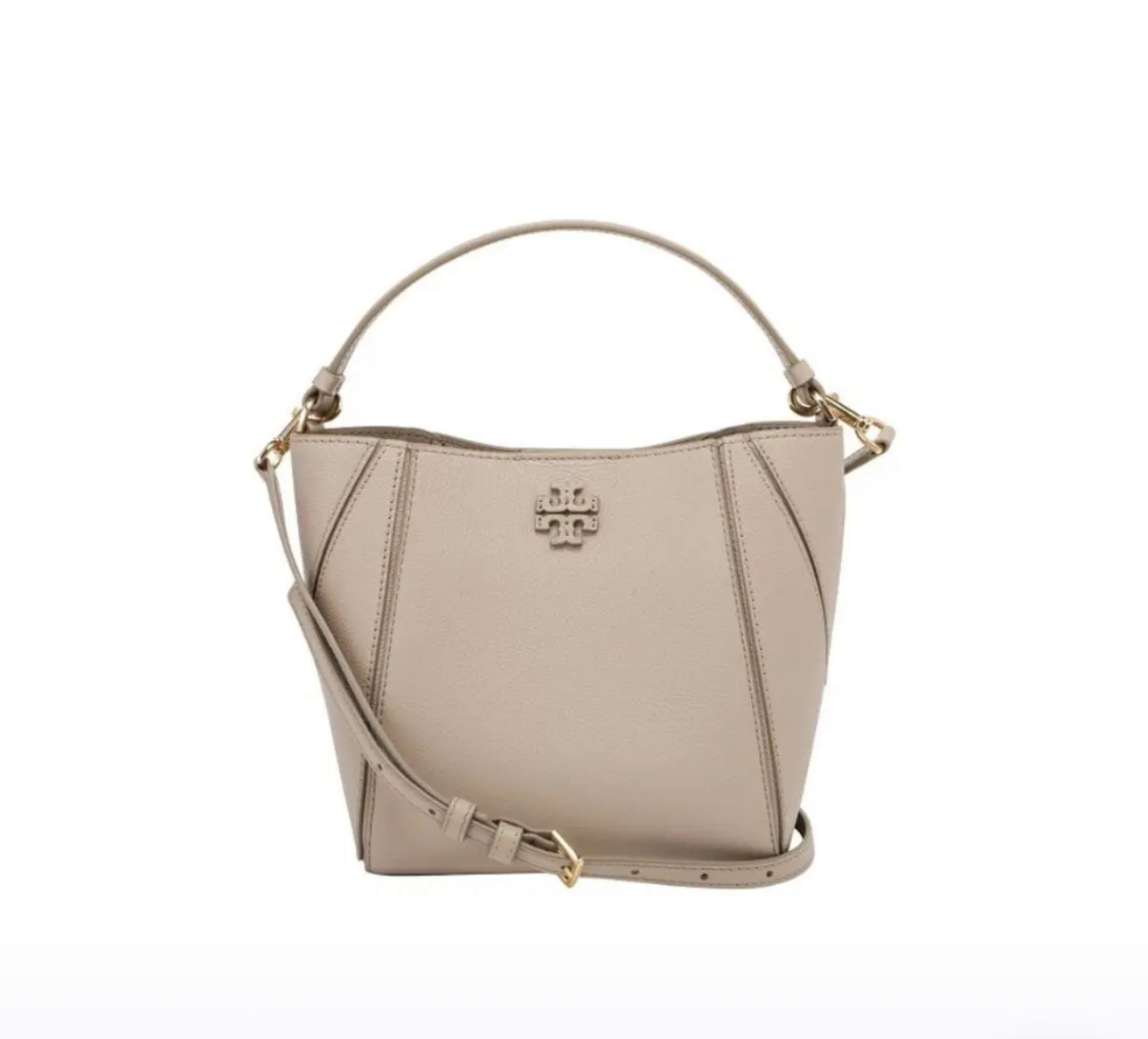 TORY BURCH 汤丽柏琦 MCGRAW 变形手提斜挎水桶包 158500-200,McGraw 小号水桶包,精选柔软荔枝纹皮革打造,配以模切工艺的标志性双 T Logo 和手工优雅缝线。可自在手提,也可随心斜挎。