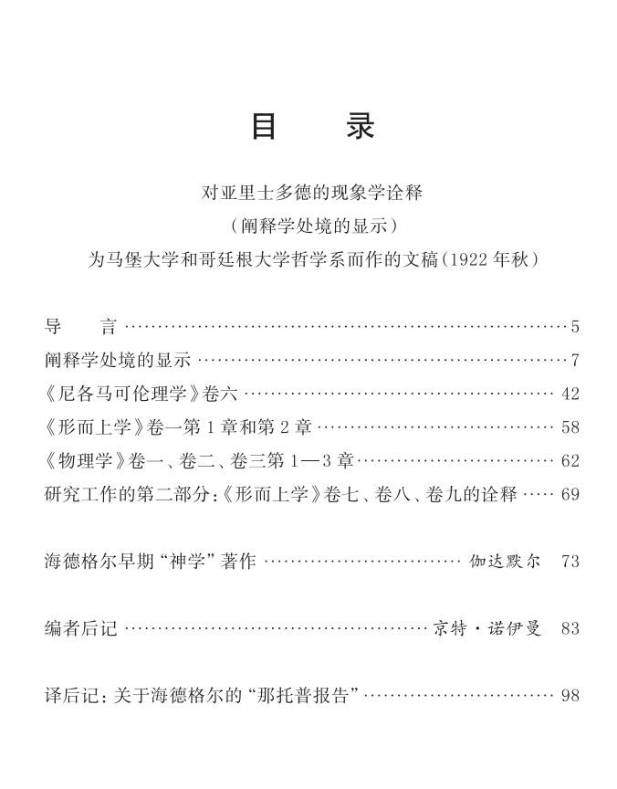 这本书是海德格尔为了申请马堡大学的哲学教授职位,而提供给马堡大学的哲学家那托普的研究纲要,因而被称为“那托普报告”(Natorp-Bericht)。跟随那托普读博的伽达默尔读到这份手稿之后,为海德格尔的哲学天赋折服,两次转学跟随海德格尔学习。在这本书中,海德格尔认为,如果要彻底理解西方-基督教的历史及其创造性,要在其来源之中使我们自己的处境变得显而易见,并且在一种活生生的当下中源始地居有它,那就必须重新回到亚里士多德。海德格尔于是从当代哲学问题出发重回亚里士多德,以这样一种方式建立了一种全新的哲学提纲。这一工作酝酿了《存在与时间》,是海德格尔思想道路的决定性的第一步。所以说,这一著作不仅是海德格尔的求职作品,还是海德格尔从一个哲学教师向哲学家转变的标志。本书附有伽达默尔写的导言。