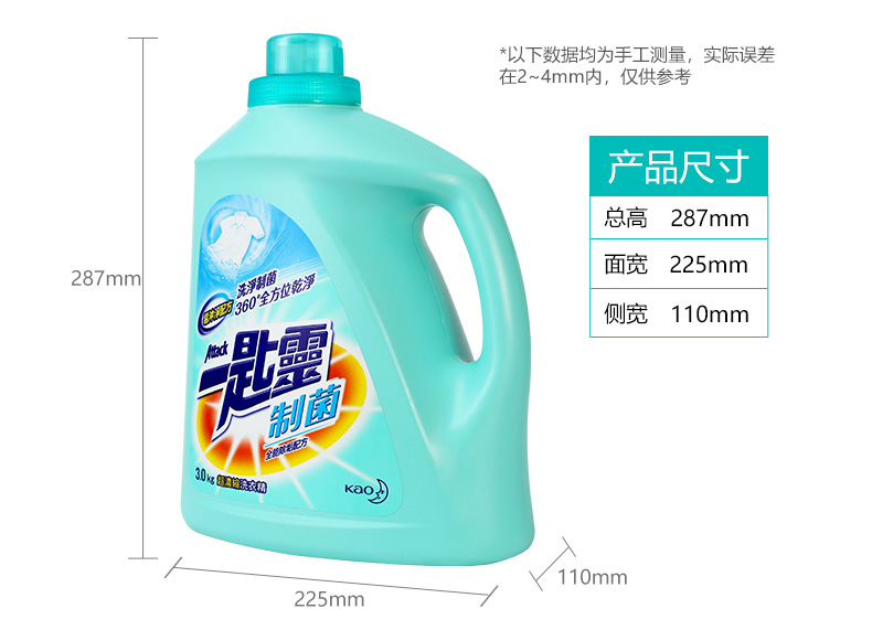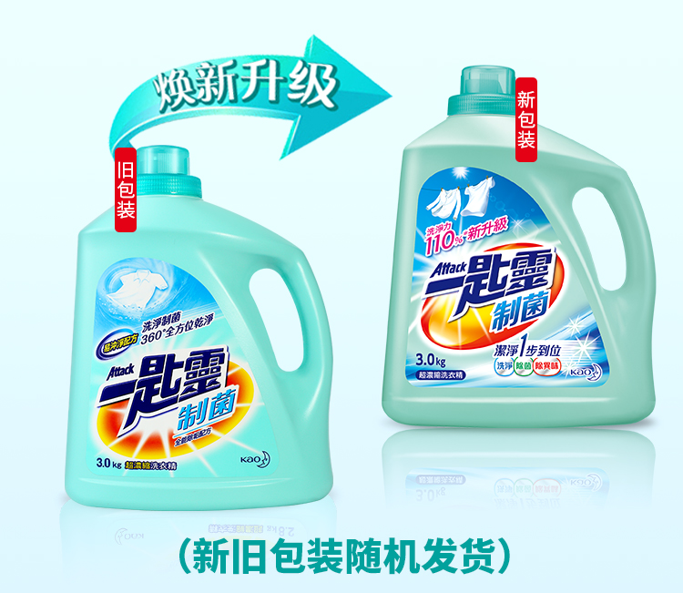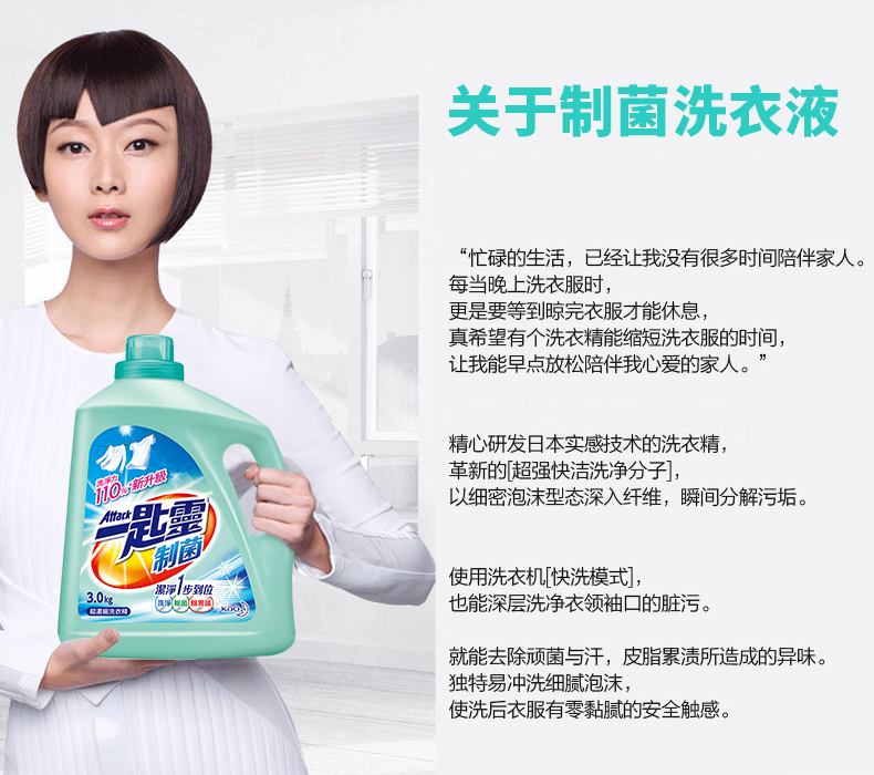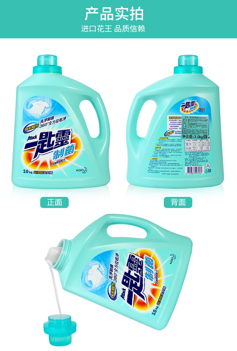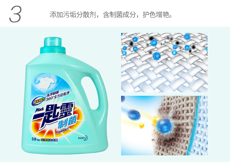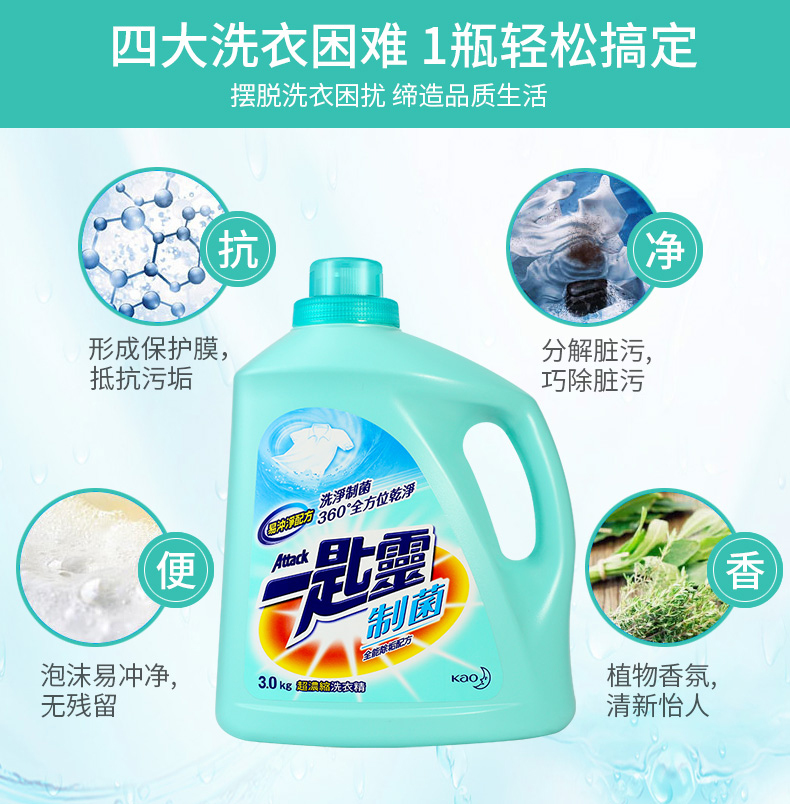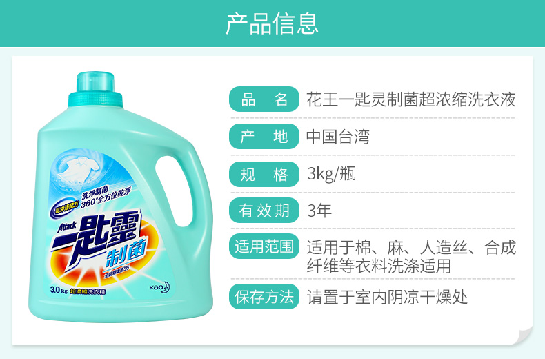 花王一匙灵浓缩去渍除菌防螨除异味持久留香洗衣液(抑菌除垢型)3kg/瓶