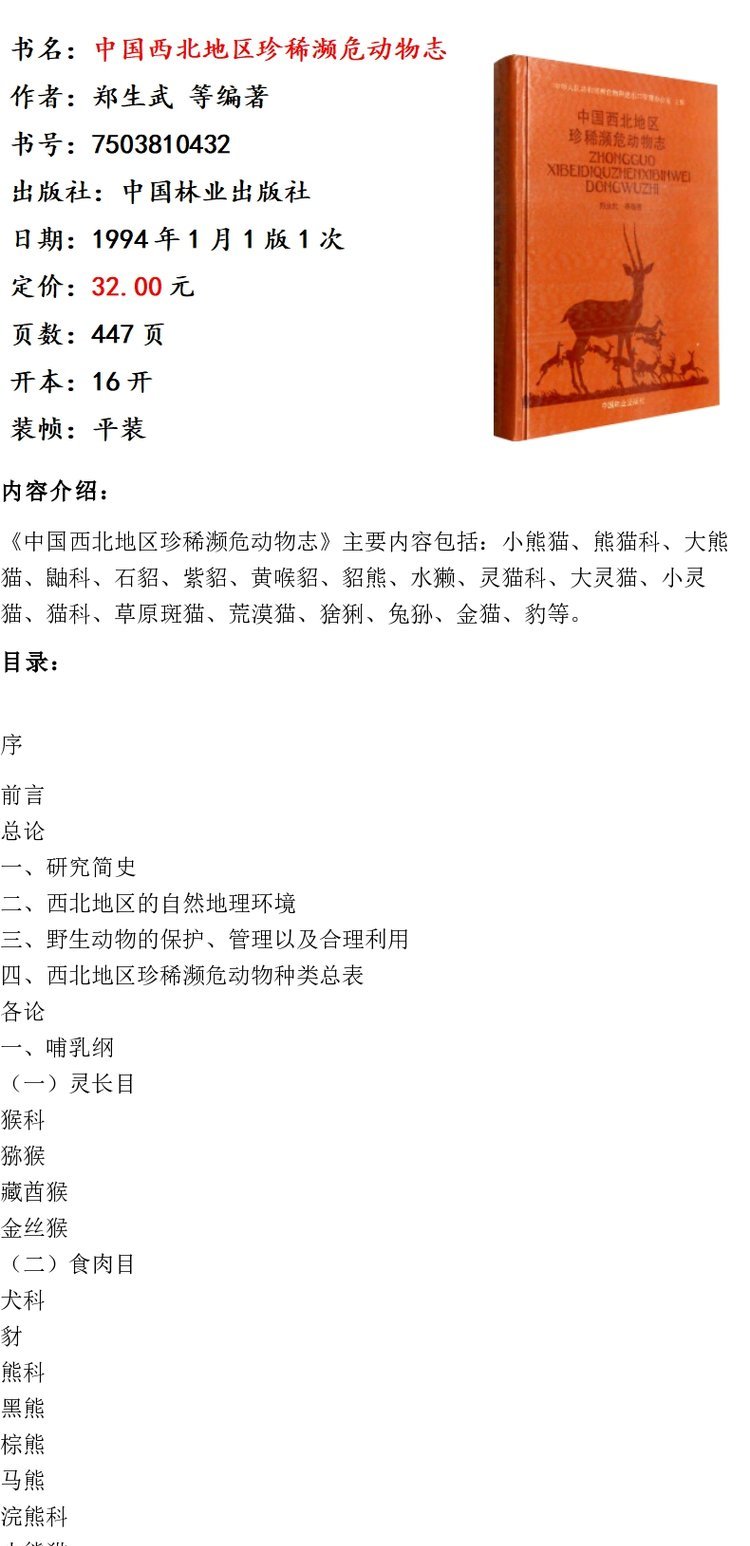 中国西北地区珍稀濒危动物志 郑生武 1043 野生动物的保护 中国林业出版社 畅销书