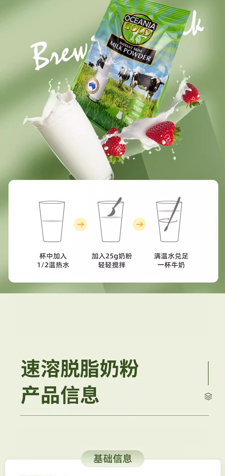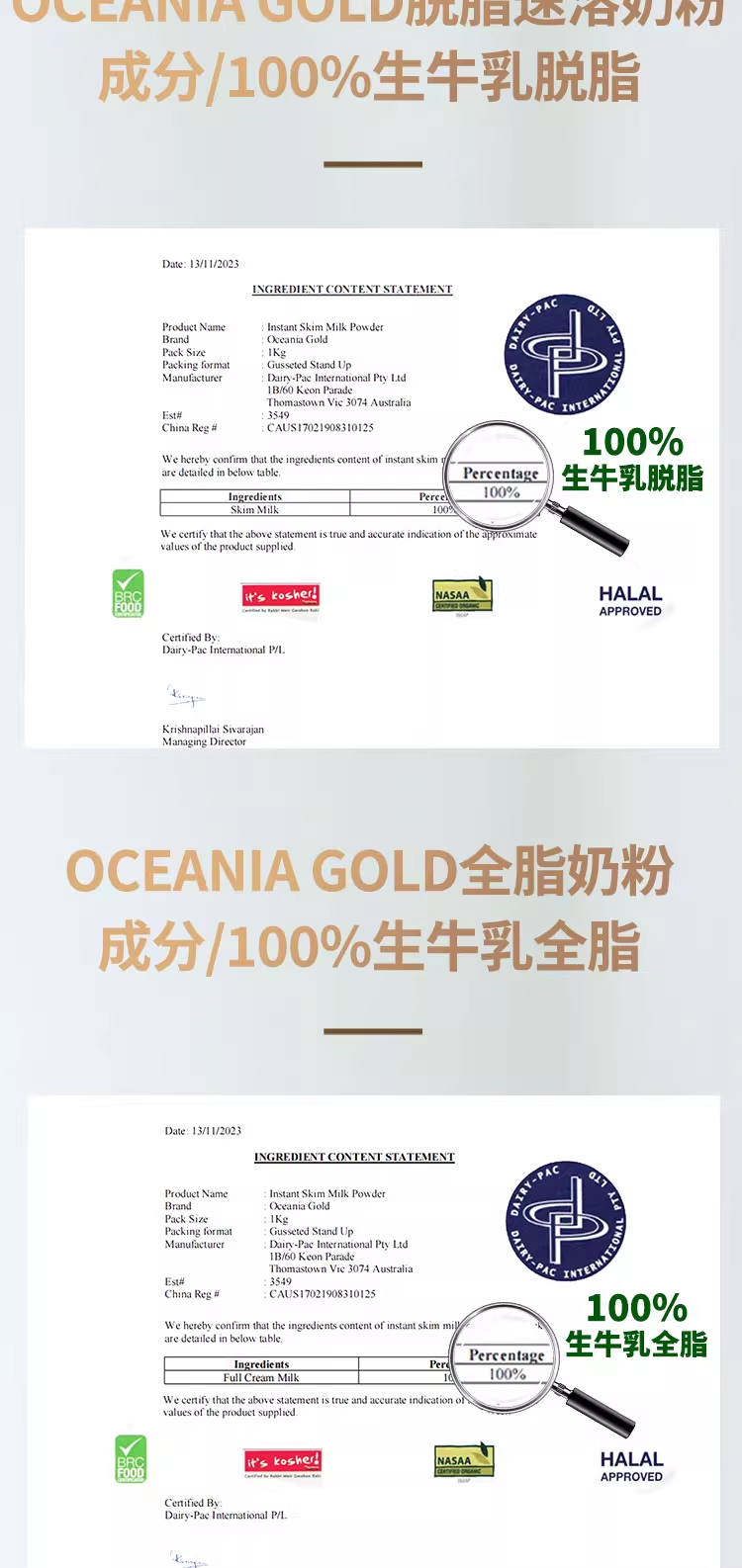 澳洲Oceania大洋洲全脂奶粉1kg 进口高钙成人老年人奶粉