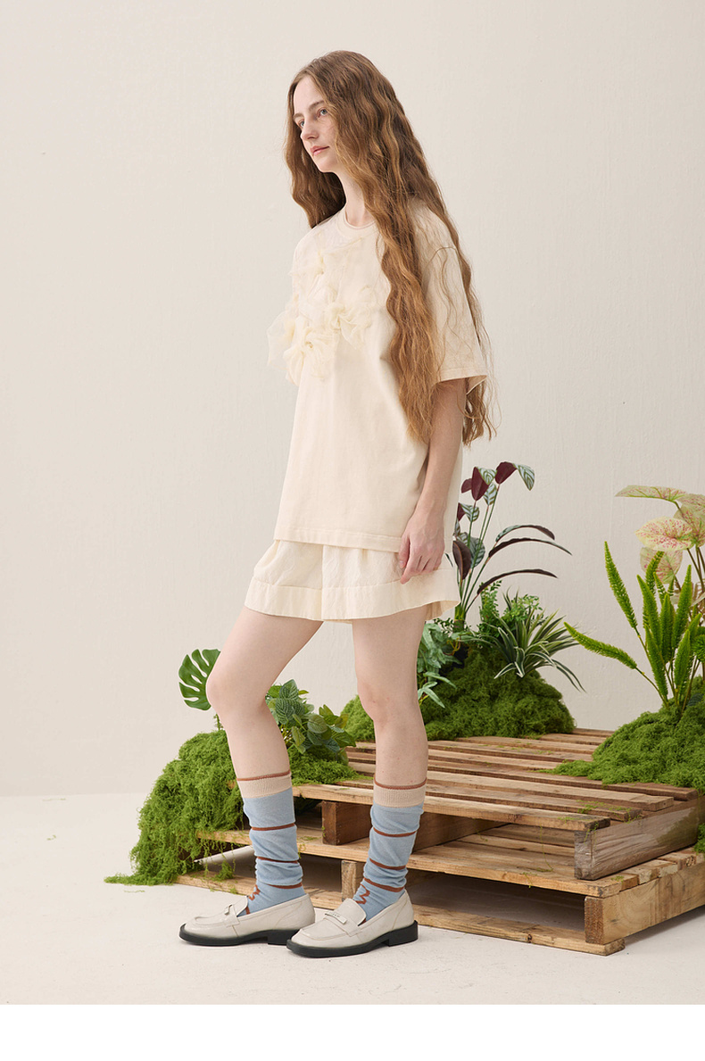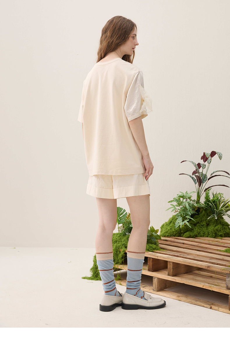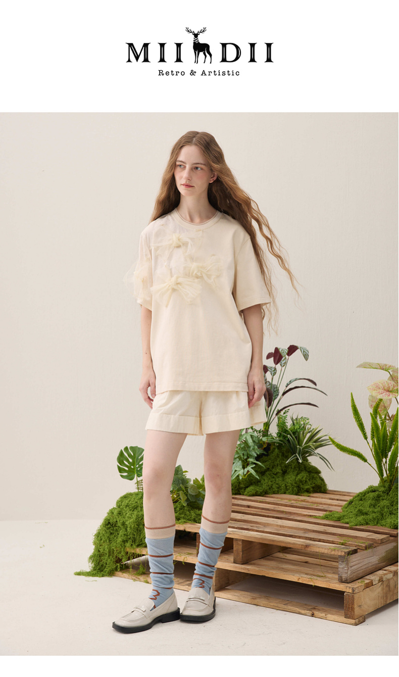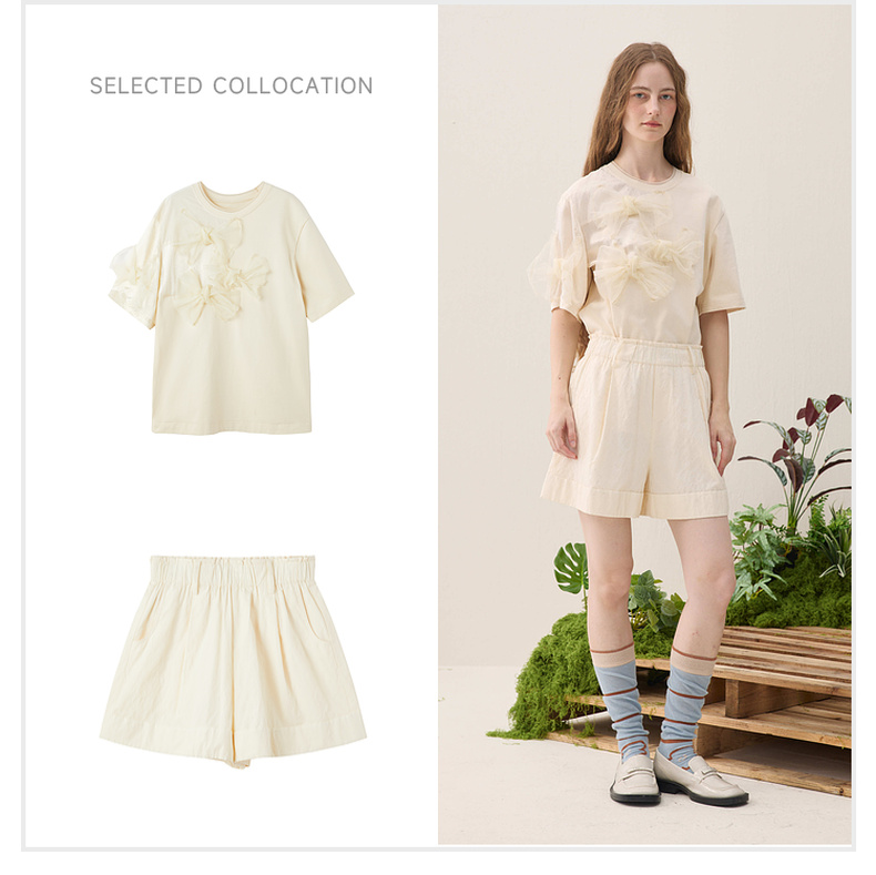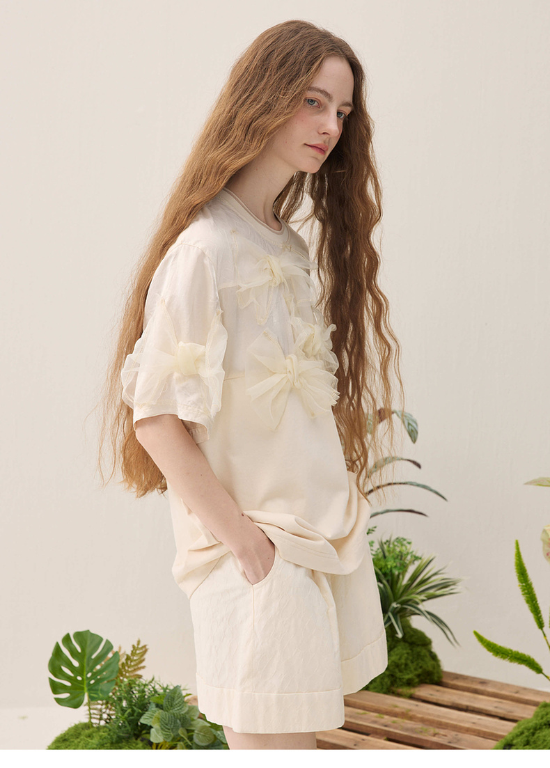 谜底宽松T恤短袖2026年春季新品欧根纱蝴蝶结甜美日常女261MT0246