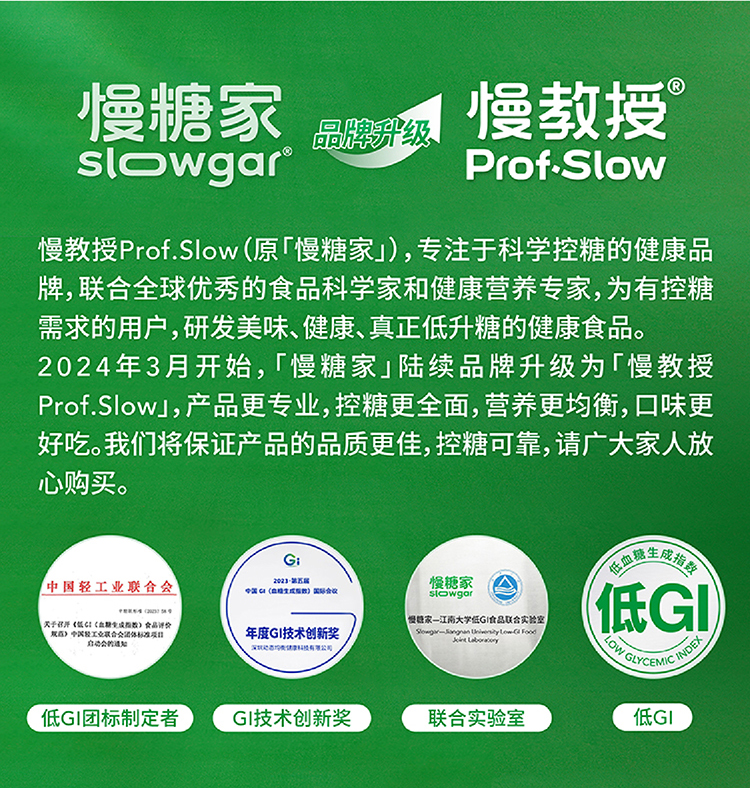 「慢教授ProfSlow」(原慢糖家),专注于科学控糖的健康营养品牌。由2位浙大校友创立,联合全球优秀的食品科学家和健康营养专家,为有控糖需求的用户研发好吃、低升糖的健康食品和营养补充剂。