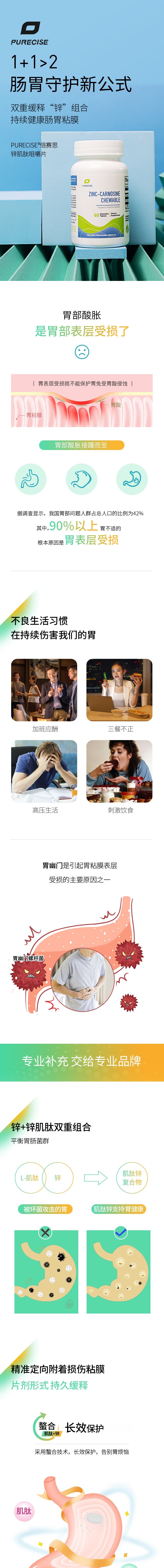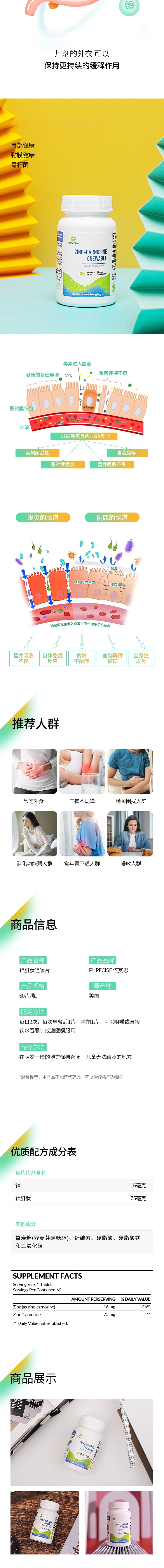 【复合锌肌肽咀嚼片】新包装 Zinc-Carnosine Chewable 每片75mg 锌肌肽咀嚼片 60片 胃肠道黏膜 胃液平衡 Purecise倍赛思