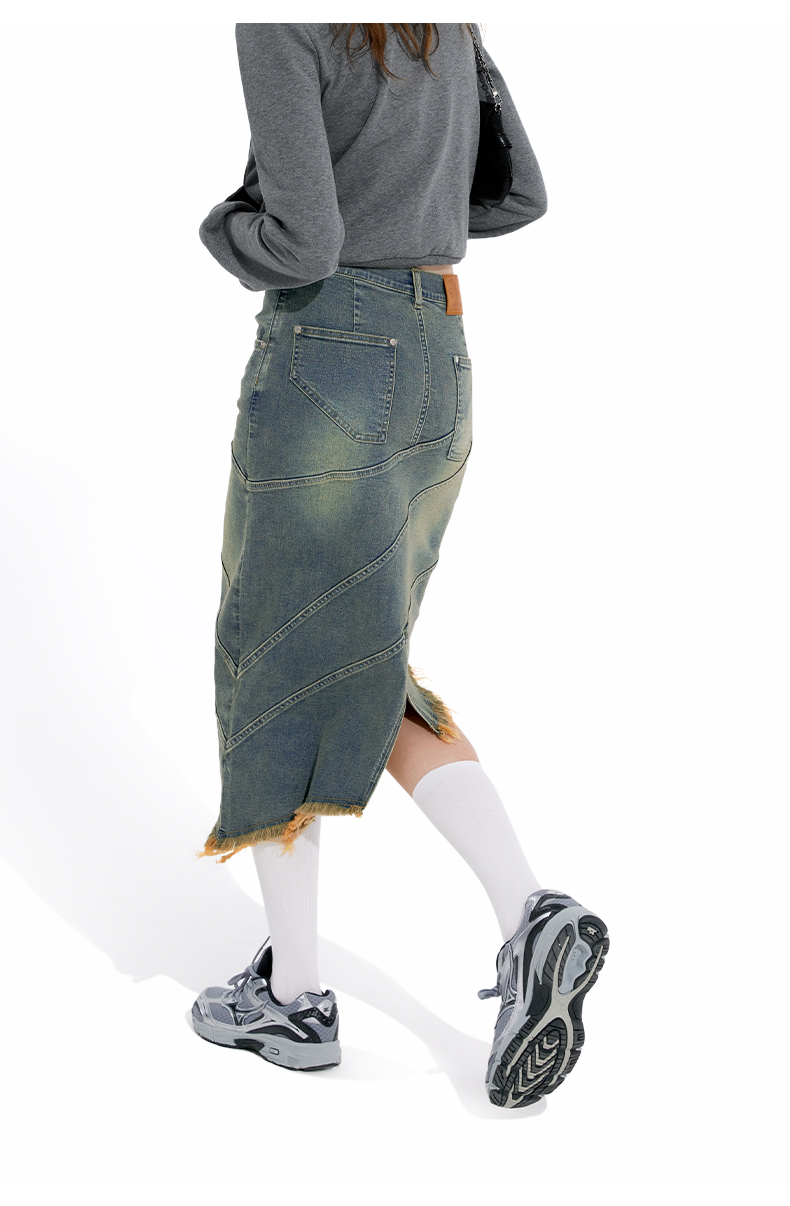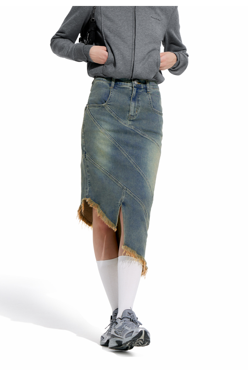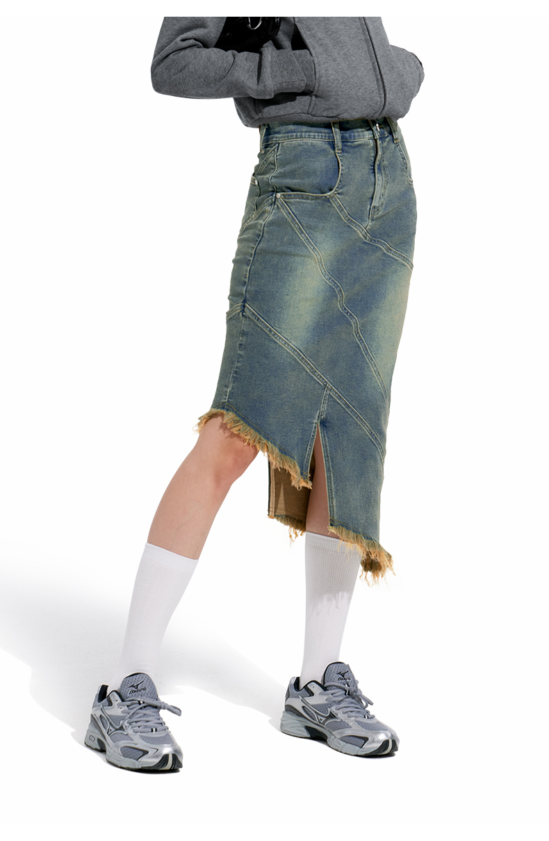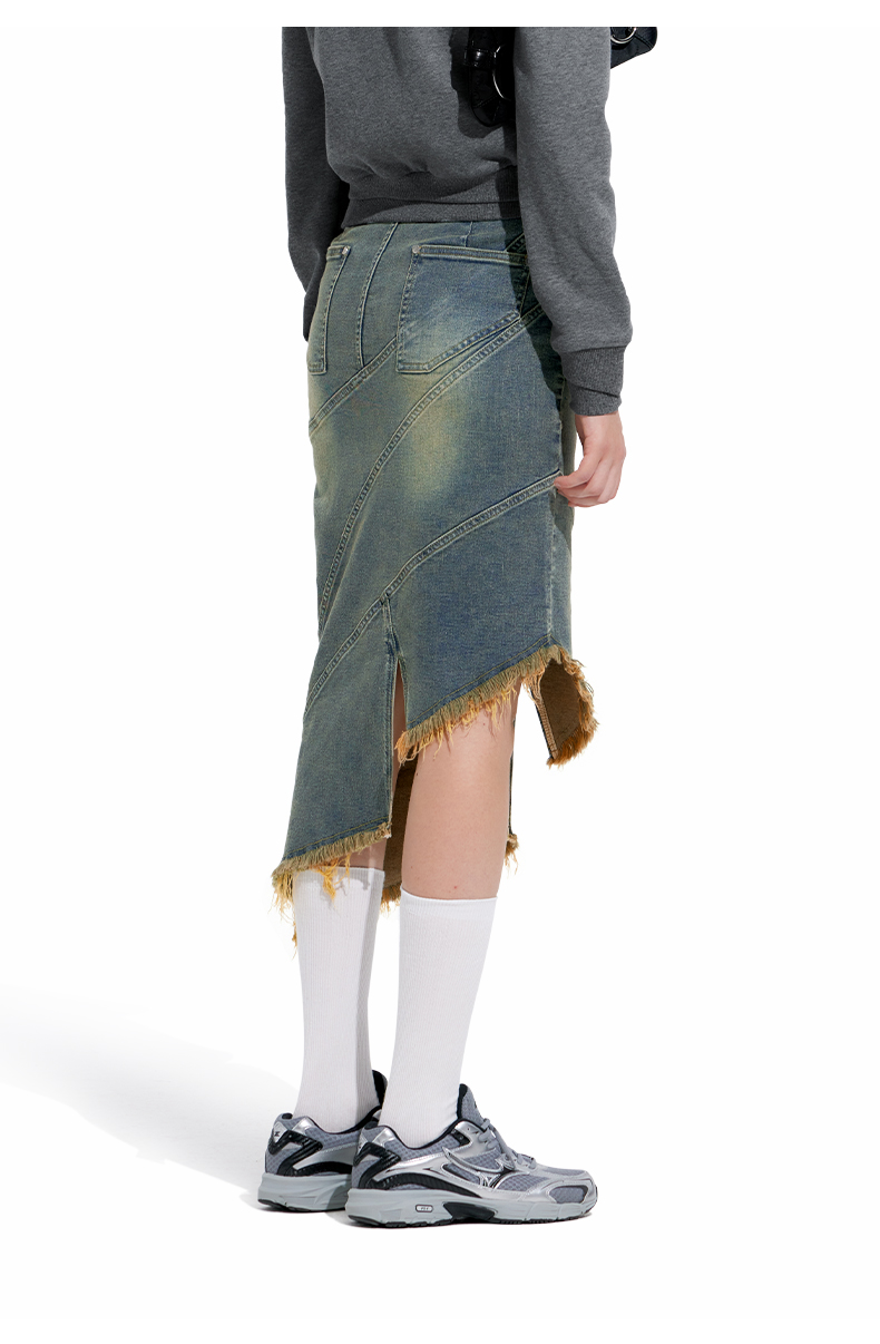 NUTH“画中少女”复古做旧牛仔裙不规则下摆半身裙