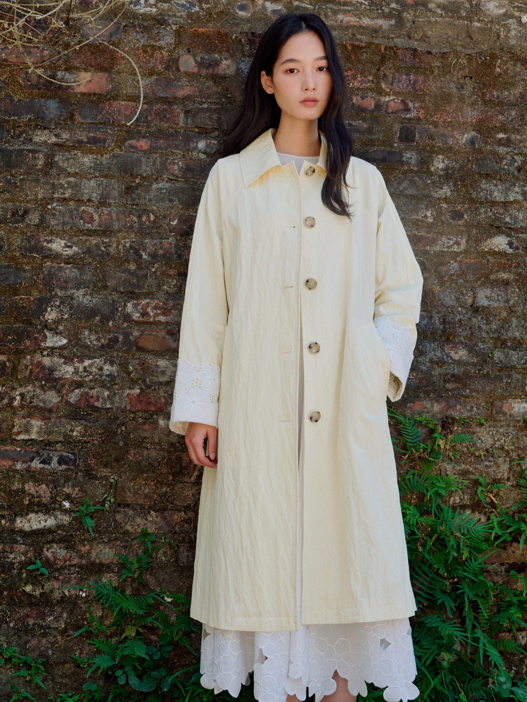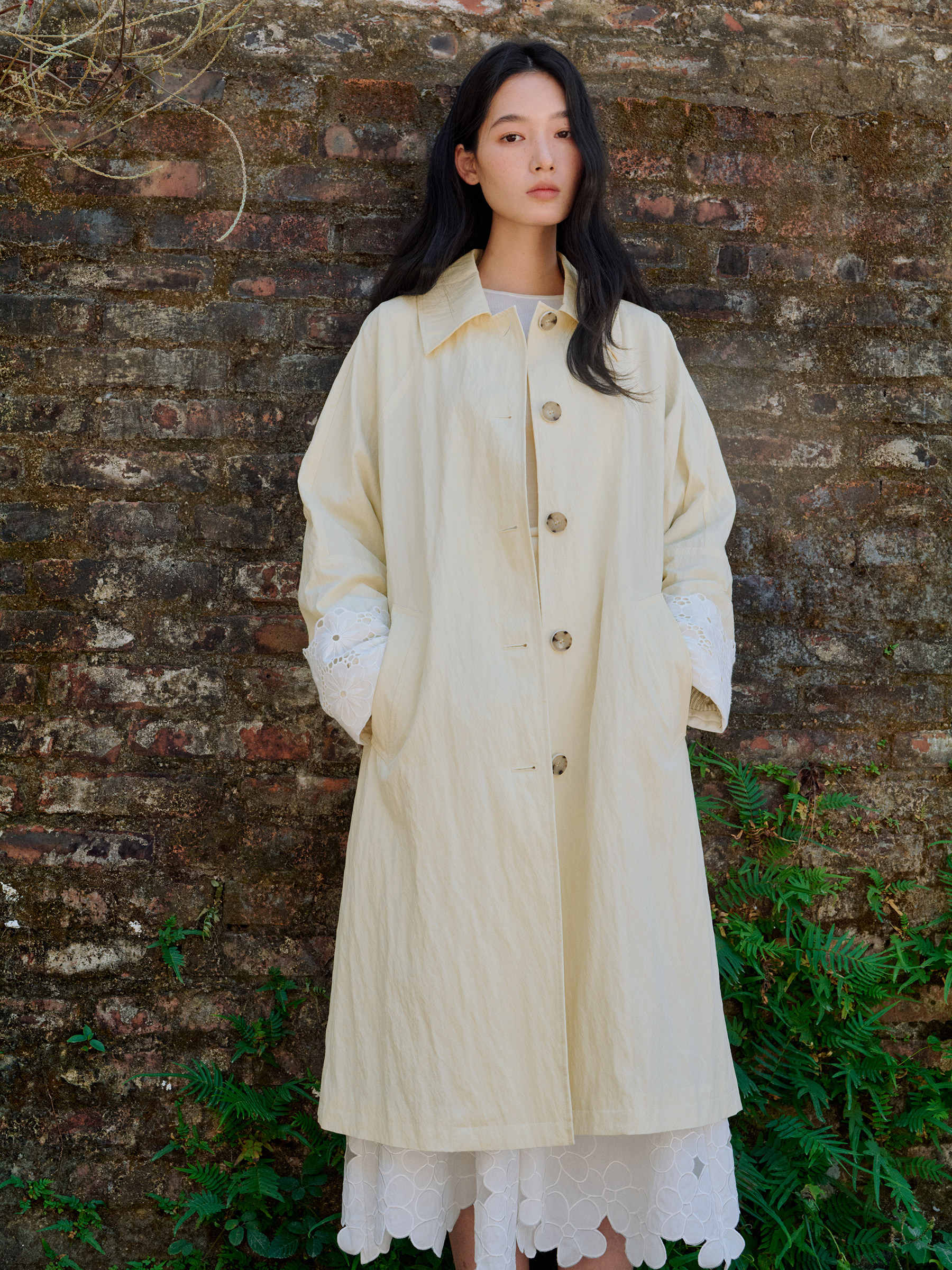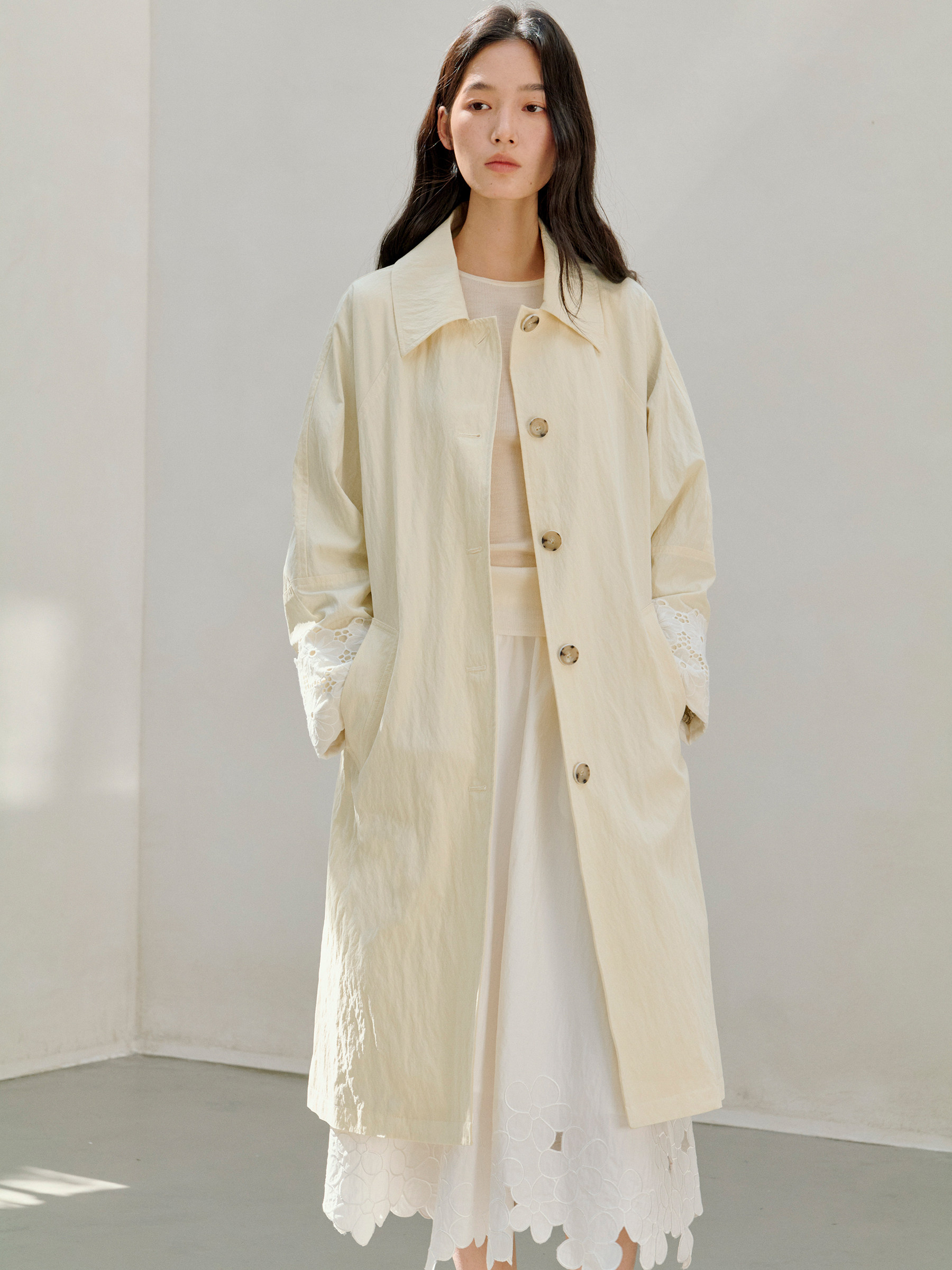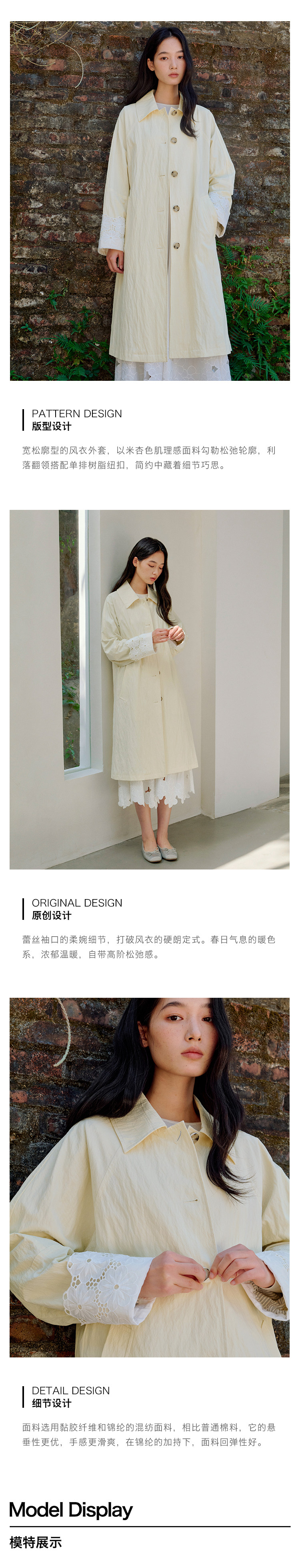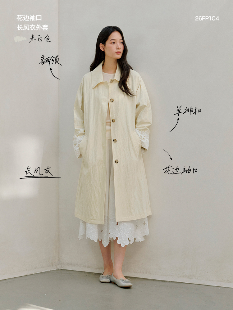 ForPoem 现货 26/SS原创设计米白色中长款花边袖口翻领风衣外套