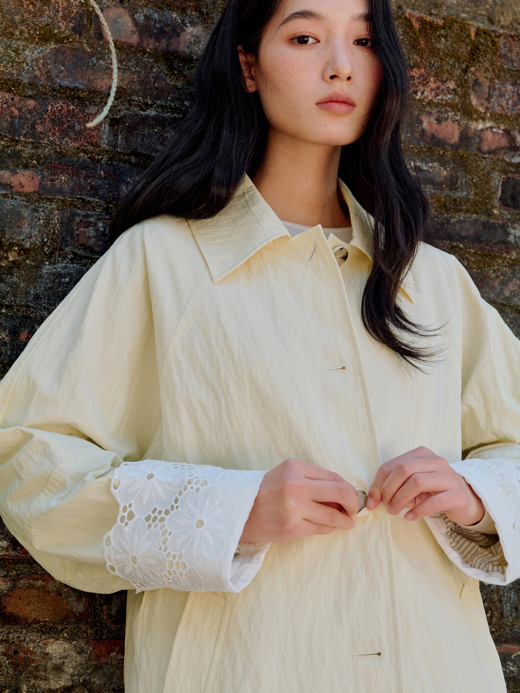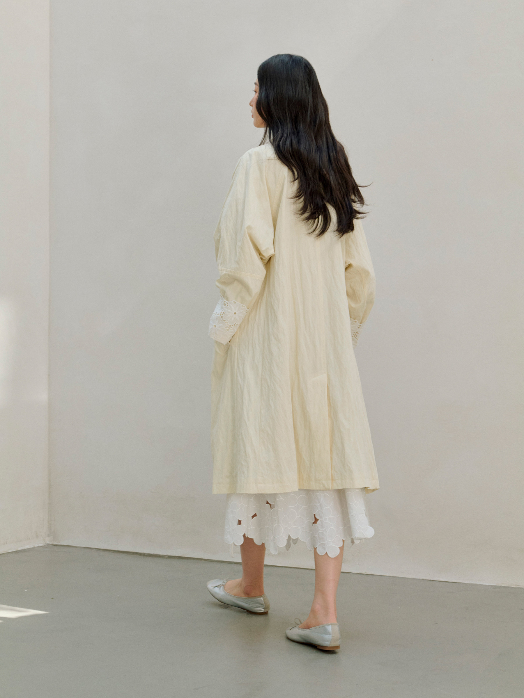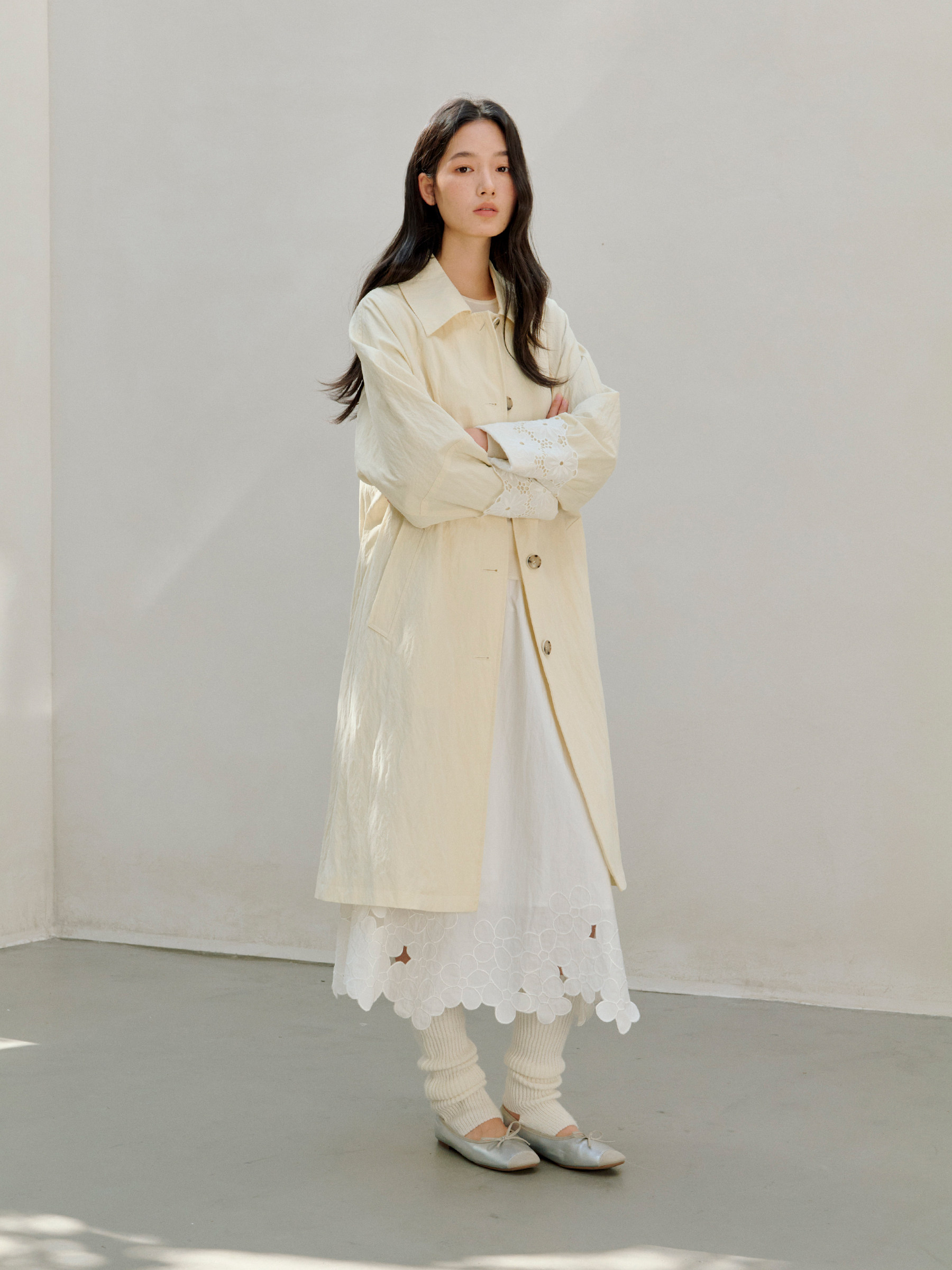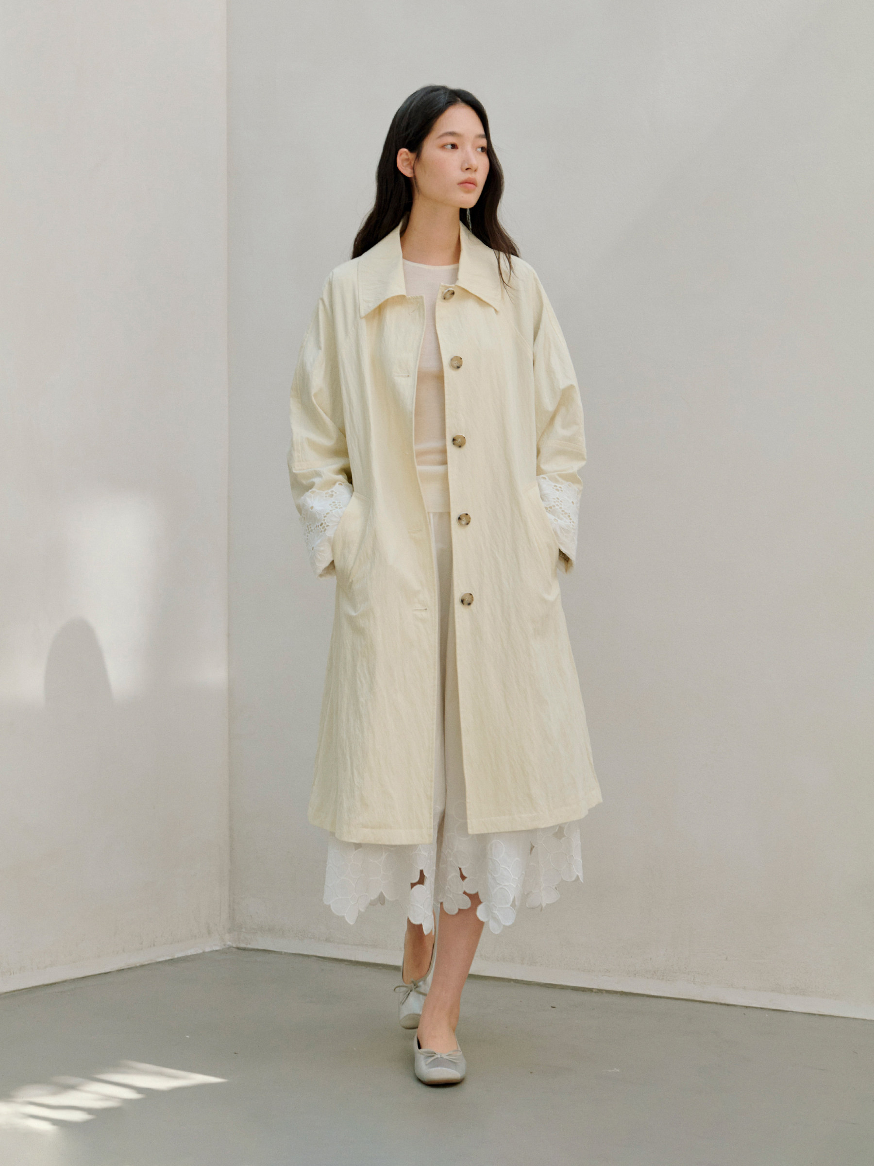 ForPoem 现货 26/SS原创设计米白色中长款花边袖口翻领风衣外套