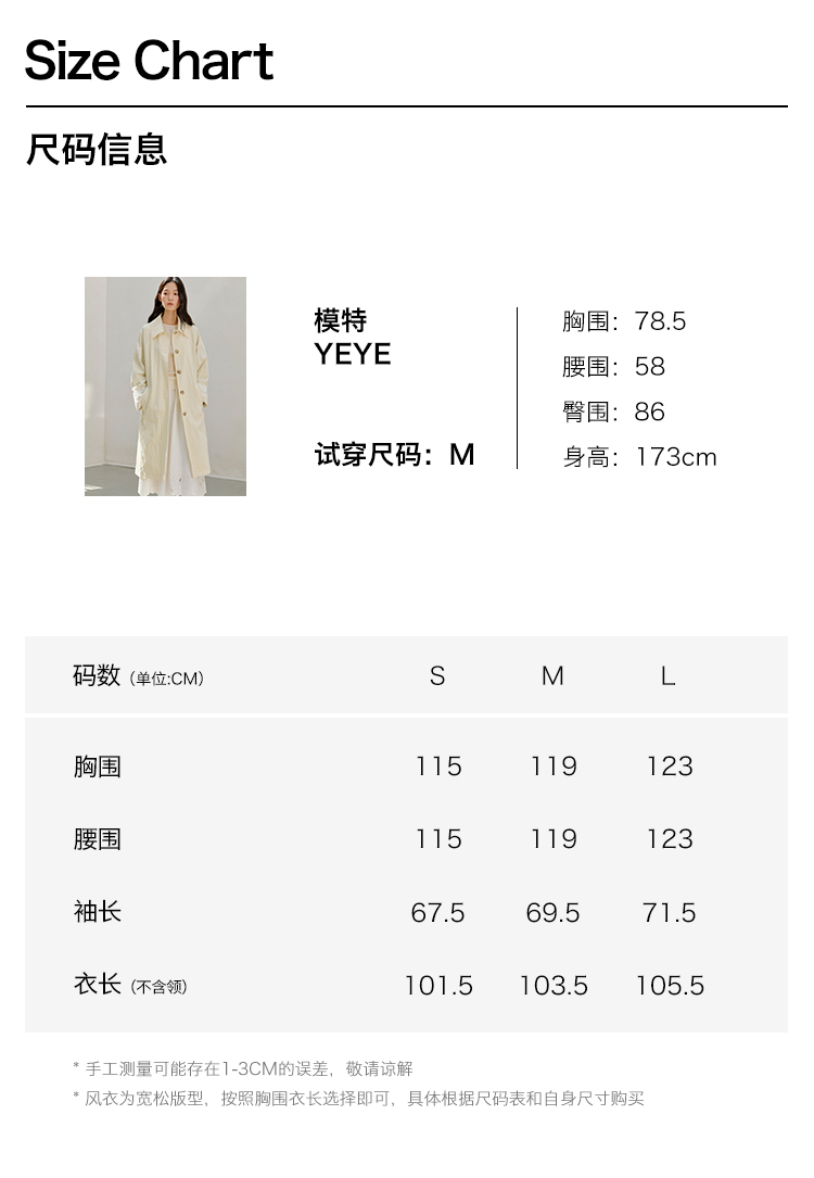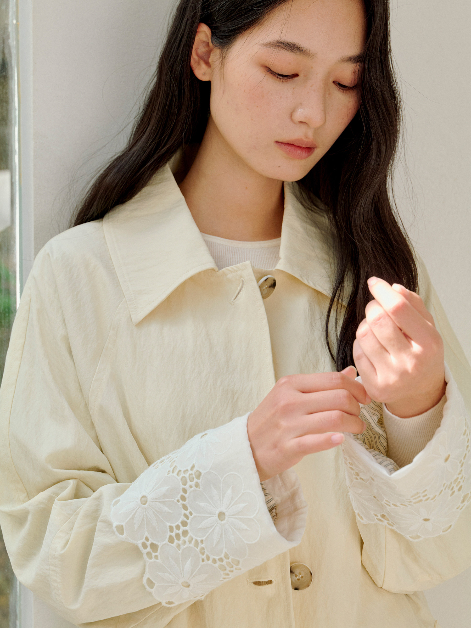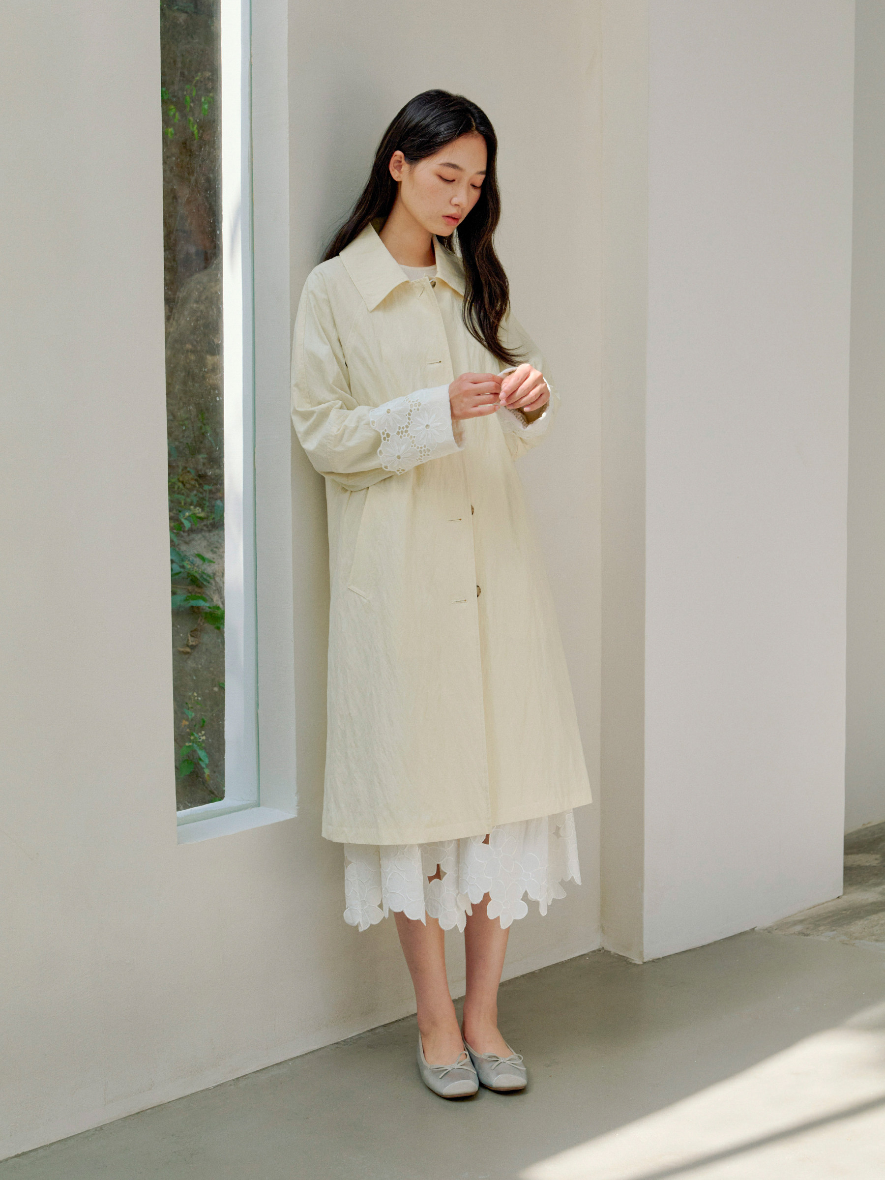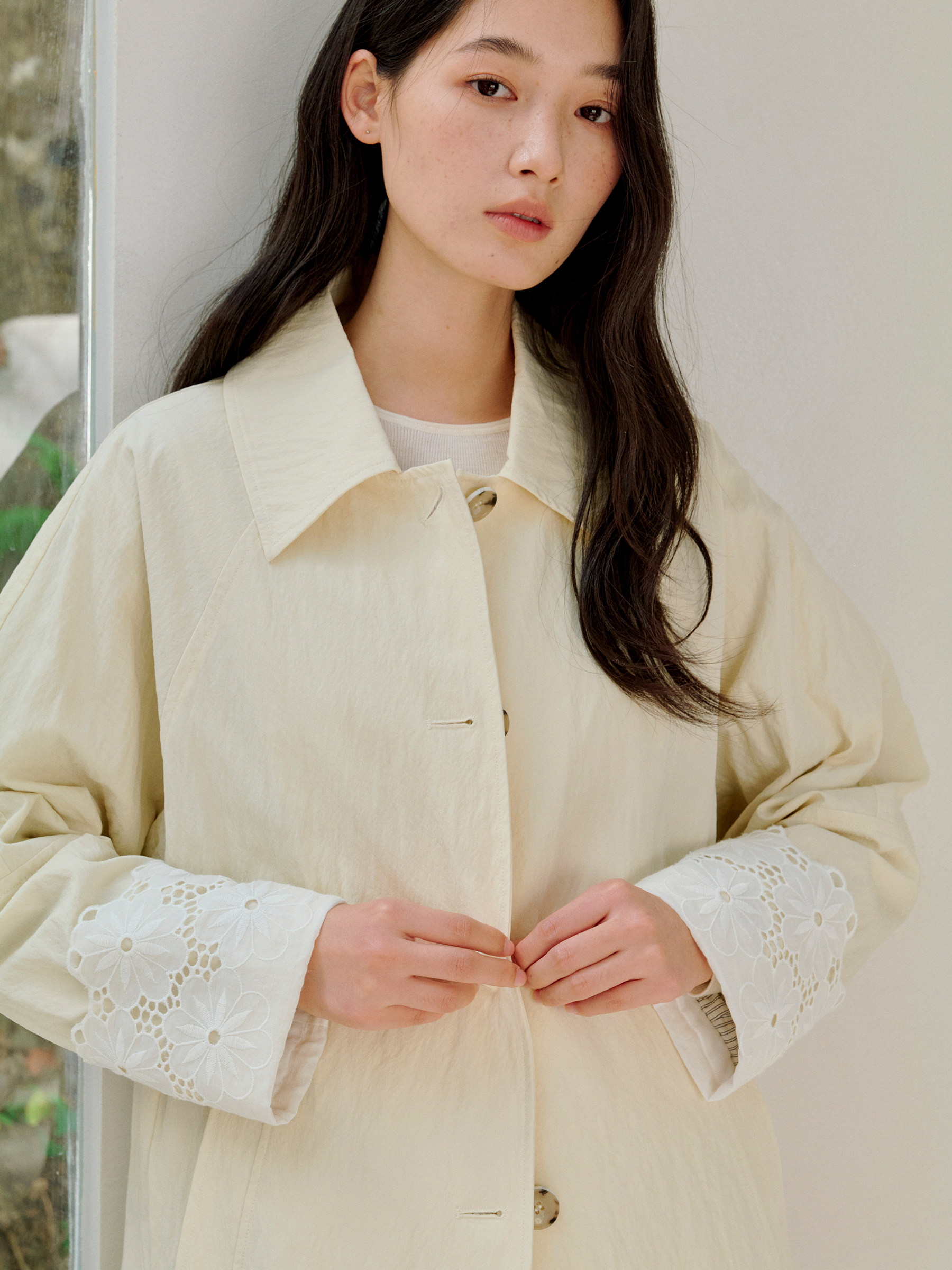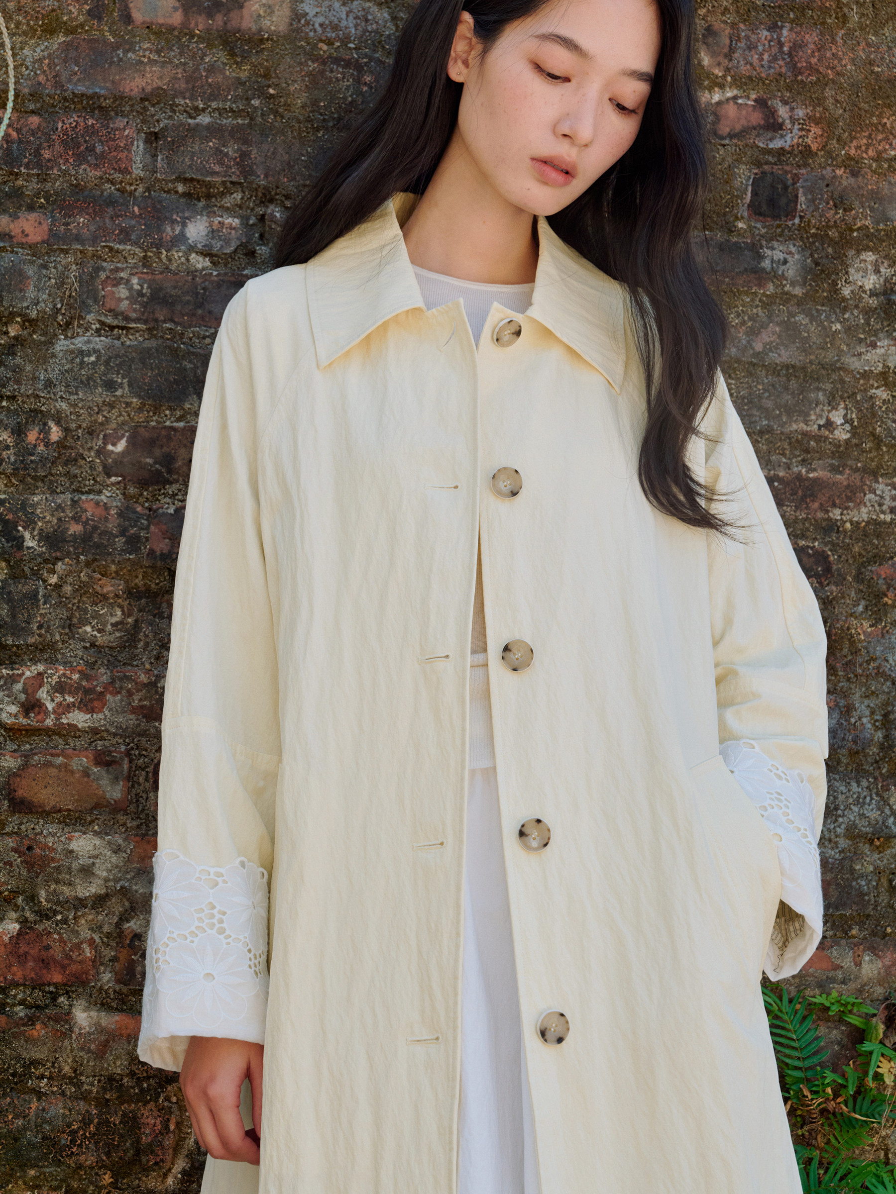 ForPoem 现货 26/SS原创设计米白色中长款花边袖口翻领风衣外套