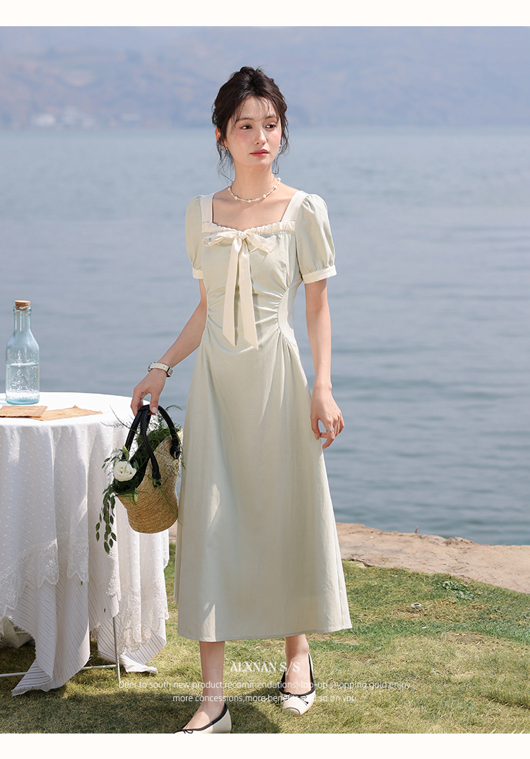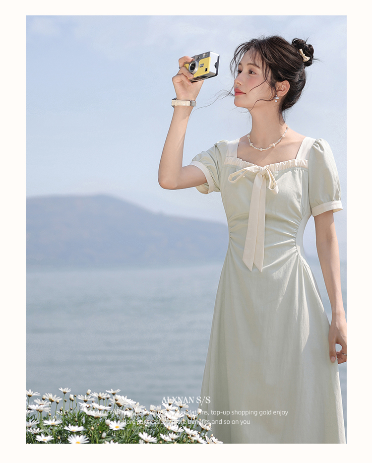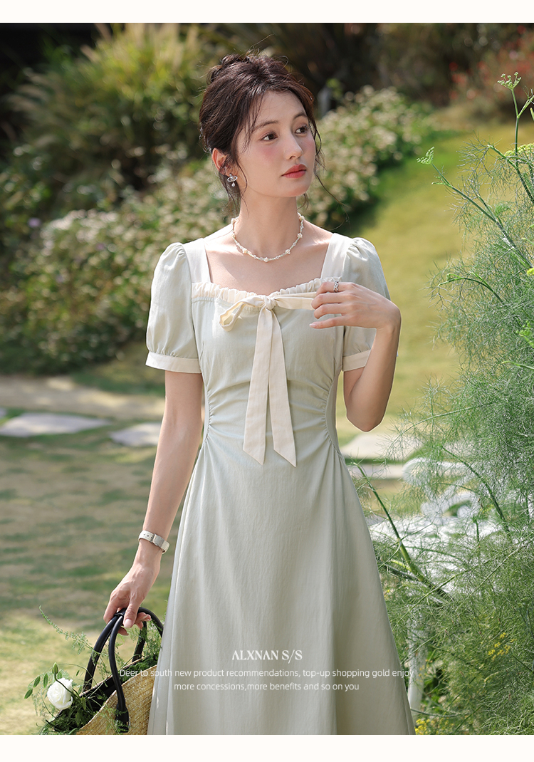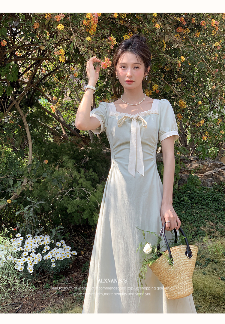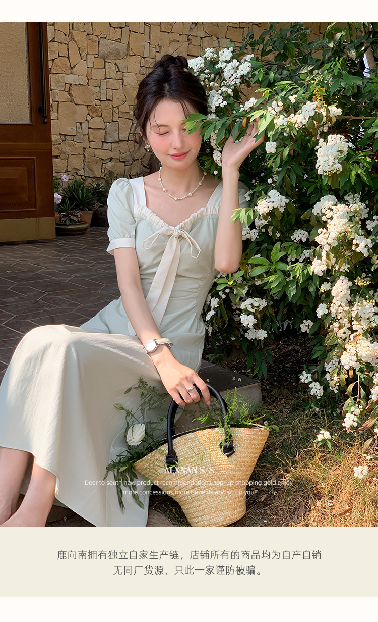 鹿向南「烟杏烷碧」绿色方领优雅短袖长裙女夏新款温柔收腰连衣裙
