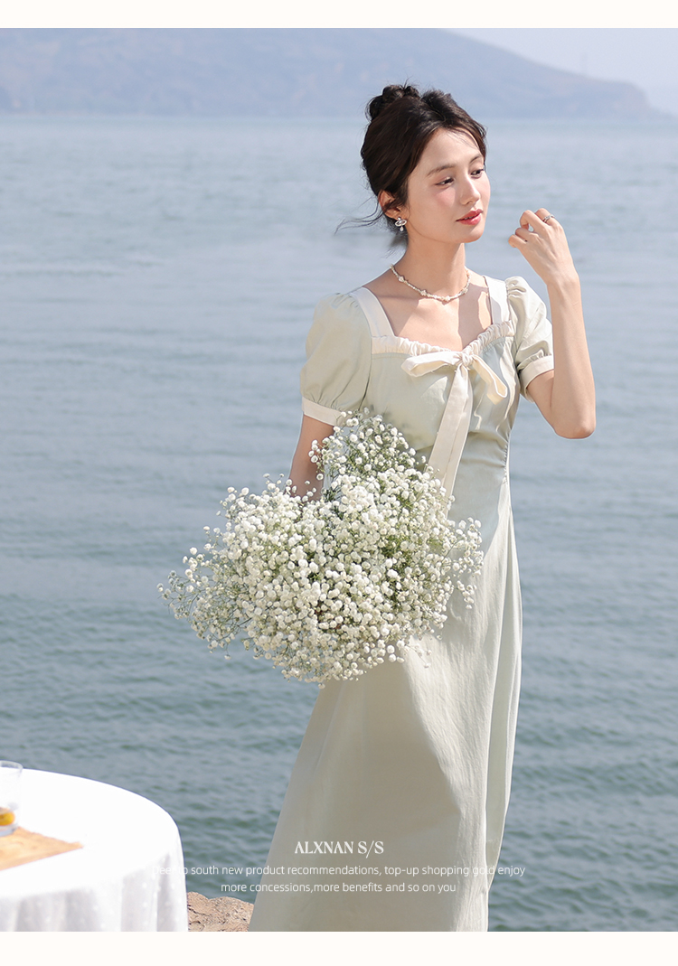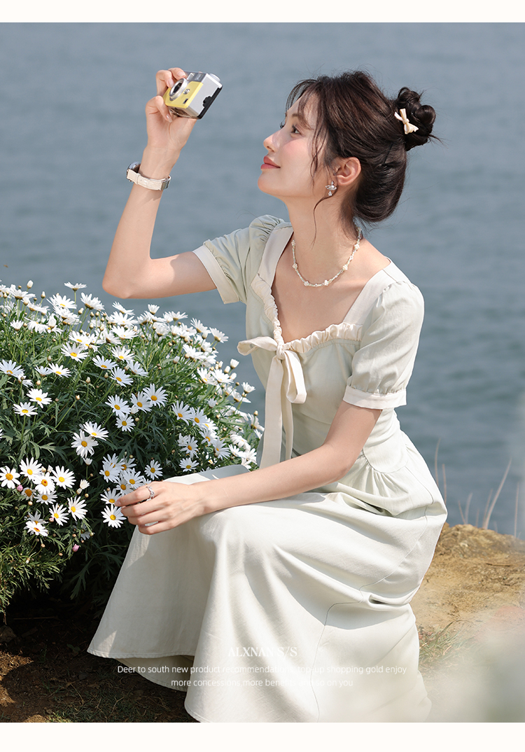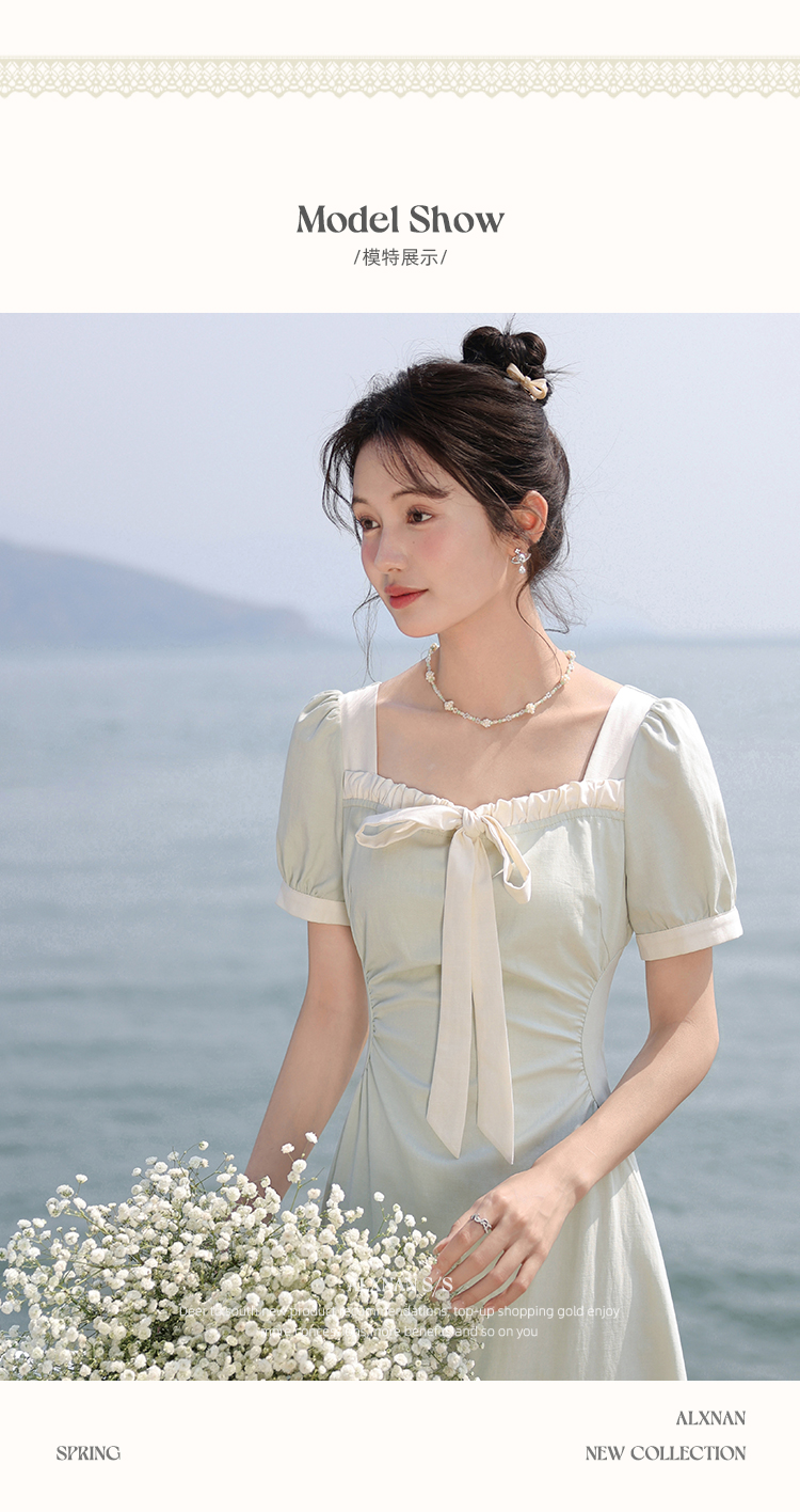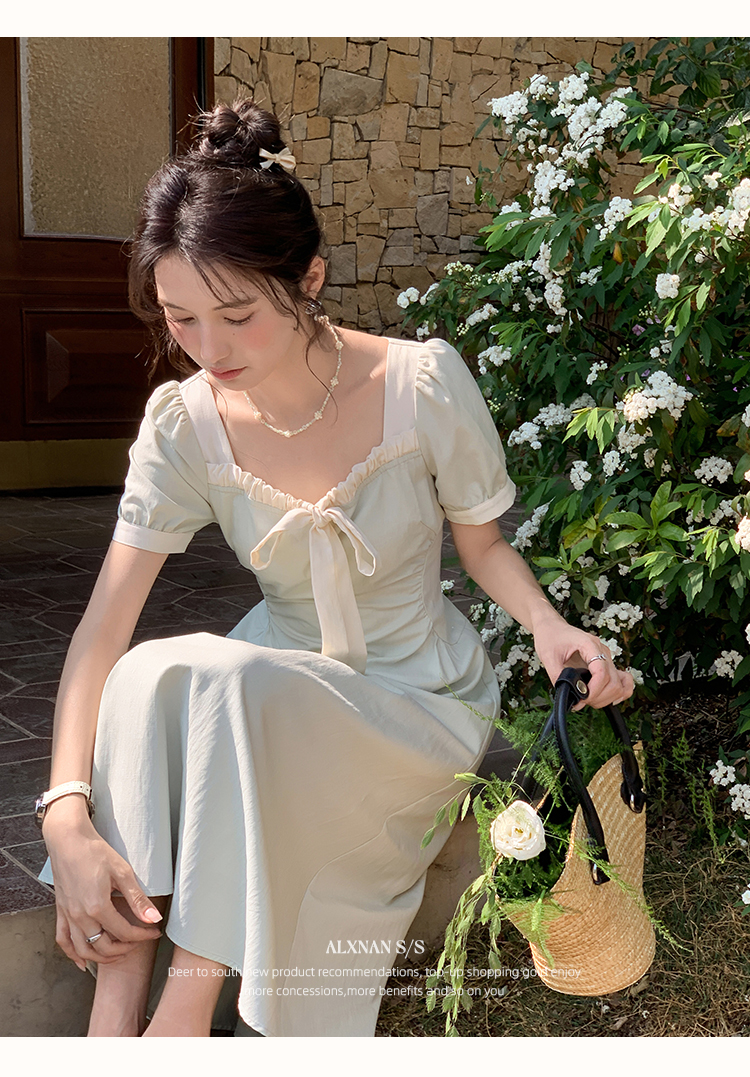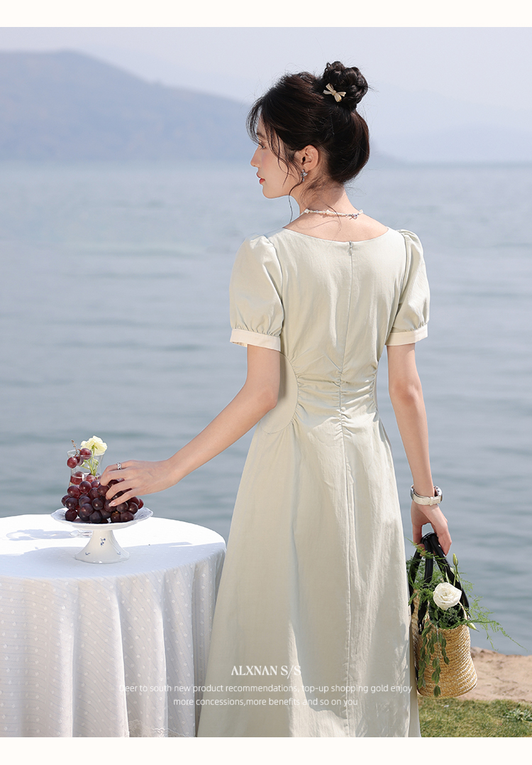 鹿向南「烟杏烷碧」绿色方领优雅短袖长裙女夏新款温柔收腰连衣裙