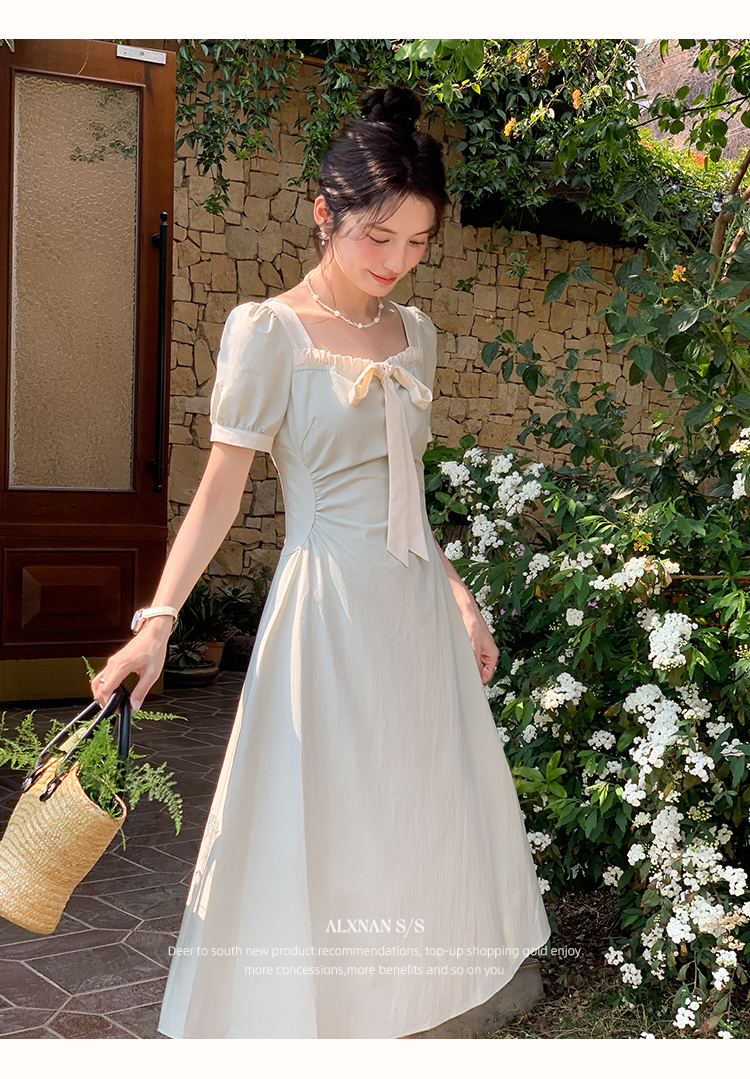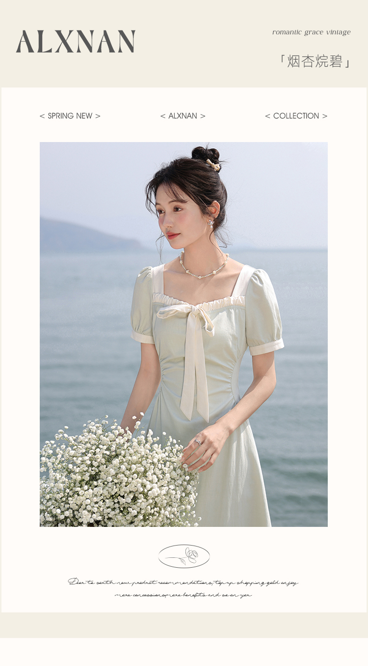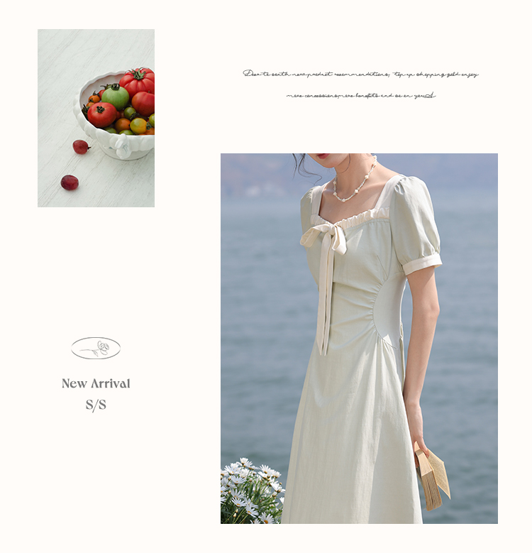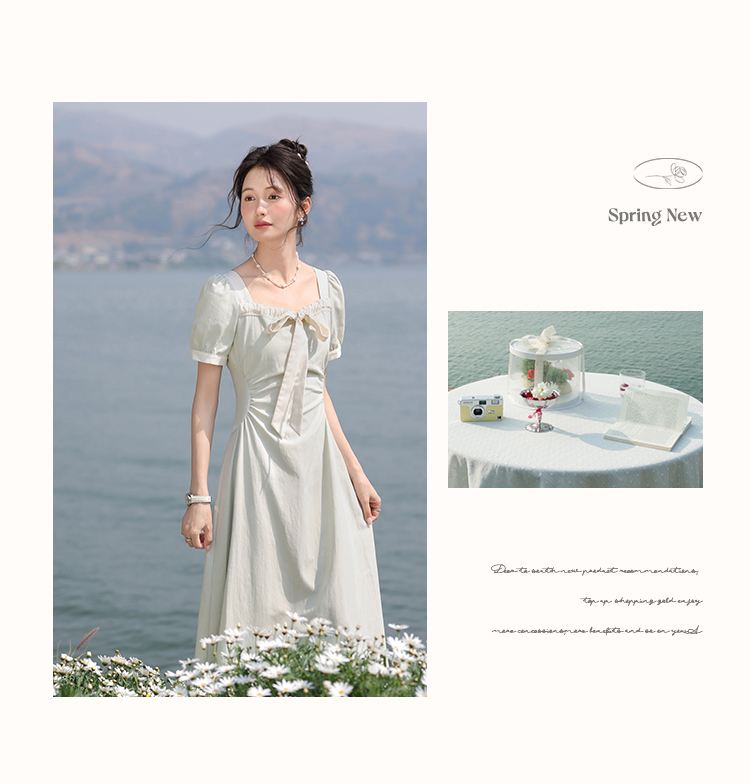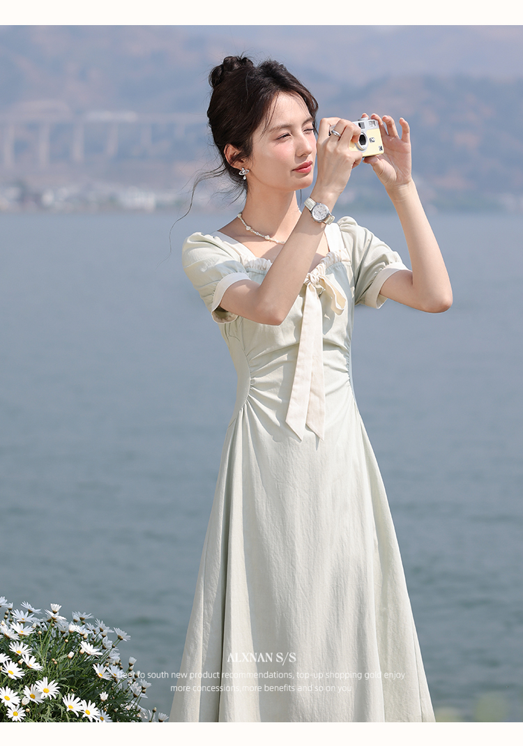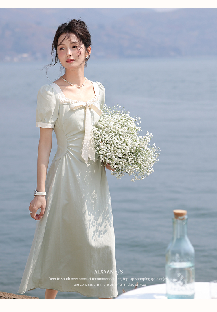 鹿向南「烟杏烷碧」绿色方领优雅短袖长裙女夏新款温柔收腰连衣裙