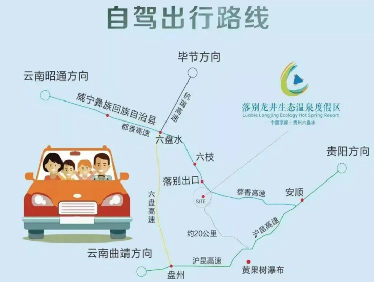 基地坐落于贵州省六盘水市六枝特区落别乡龙井村 。这里四面环山,风景如画。温泉与美景相得益彰,让您在此尽享舒适惬意的休闲度假之旅。