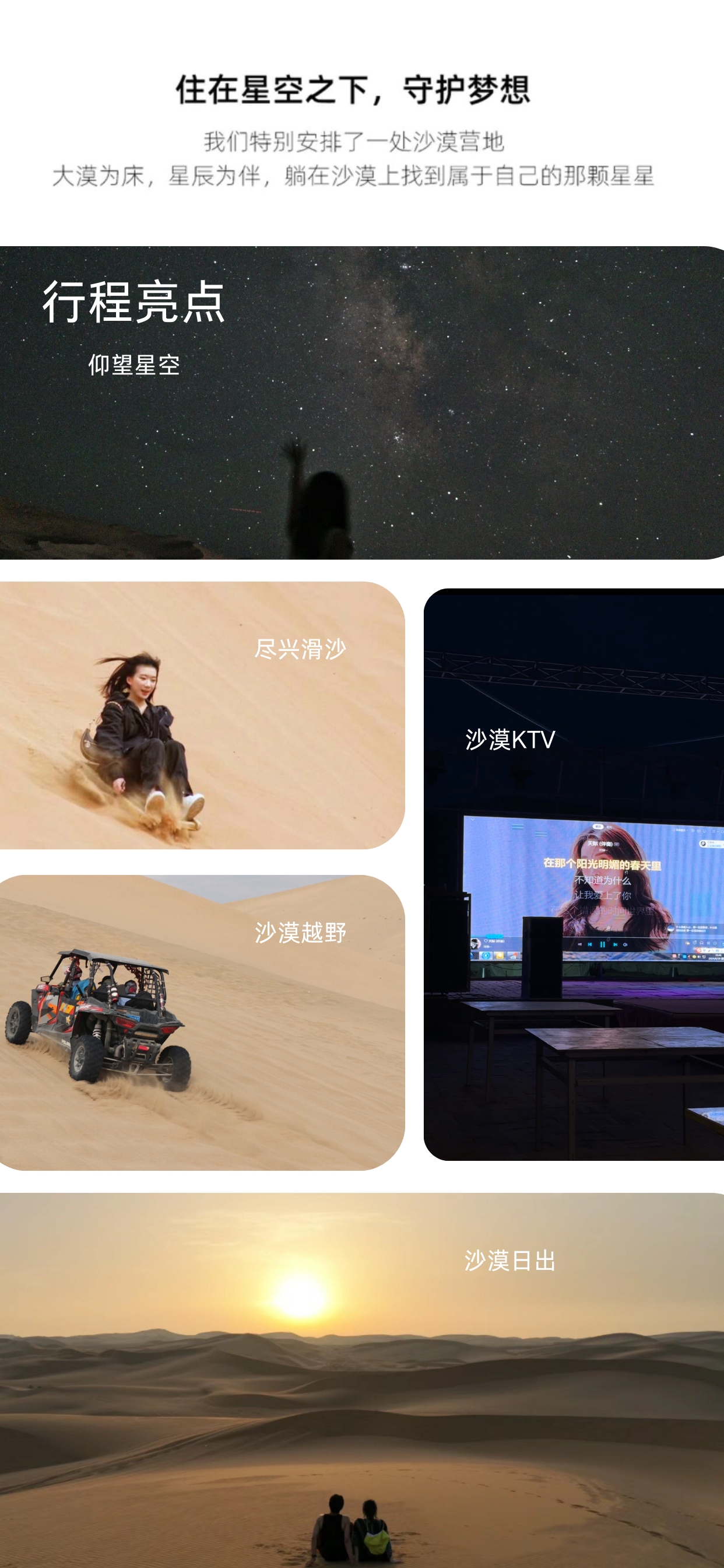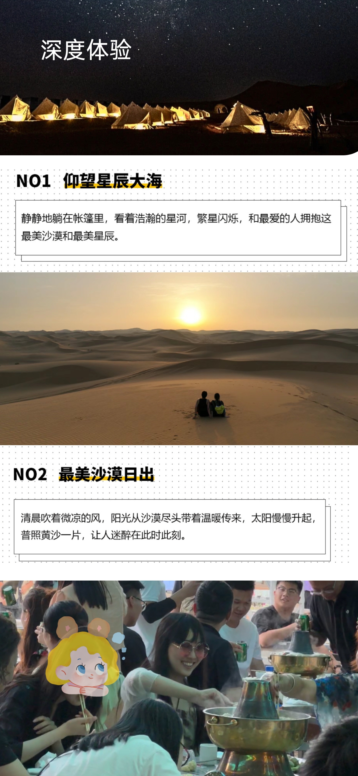 2.沙漠露营以体验为主,住宿条件有限,无独立卫生间,公共洗浴,无法洗澡。