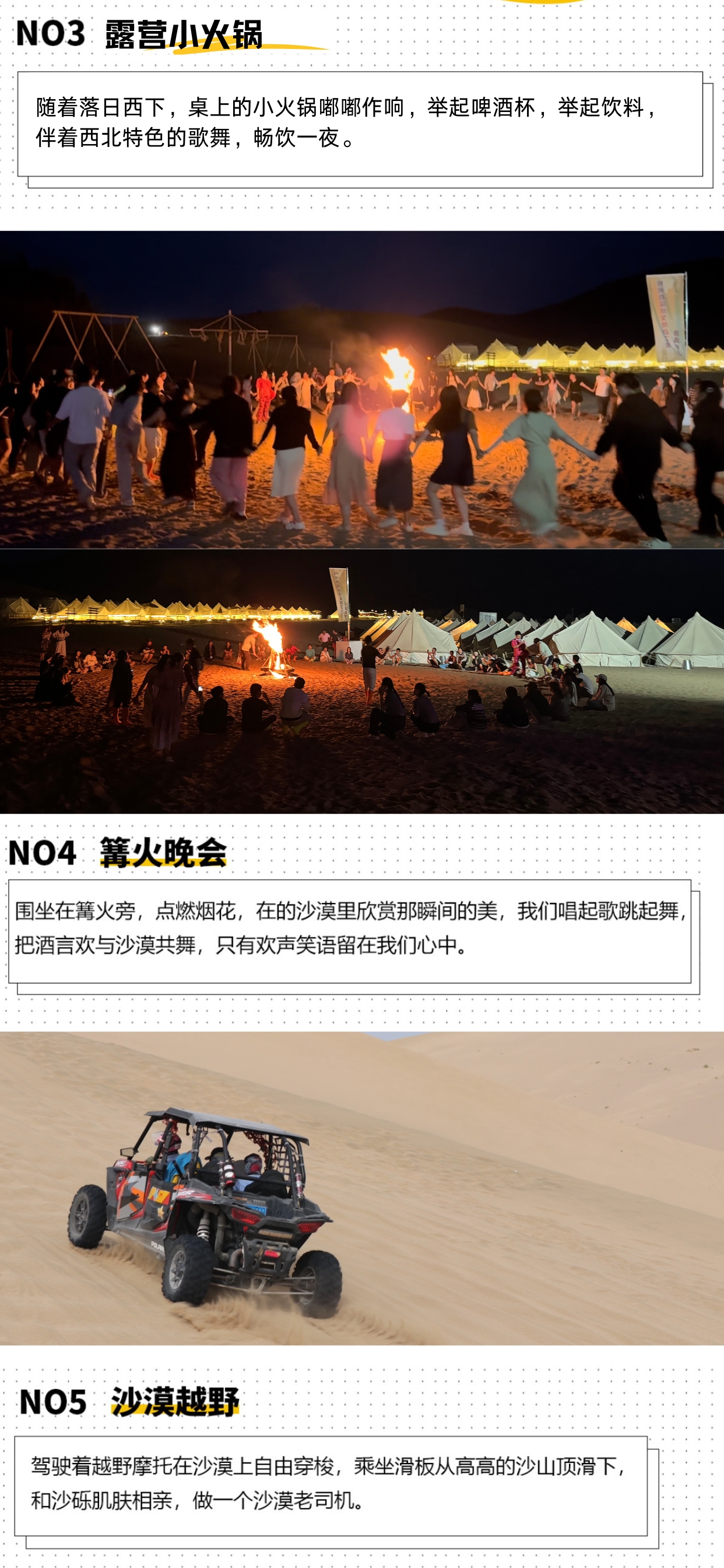 2.娱乐项目:爬鸣沙山后山、渭沙、篝火、打铁花、烟花、主持人演艺、飞天舞蹈,秋千、荡船、旋转椅、跷跷板等无动力沙漠娱乐项目及ATV摩托车冲浪体验一圈,;