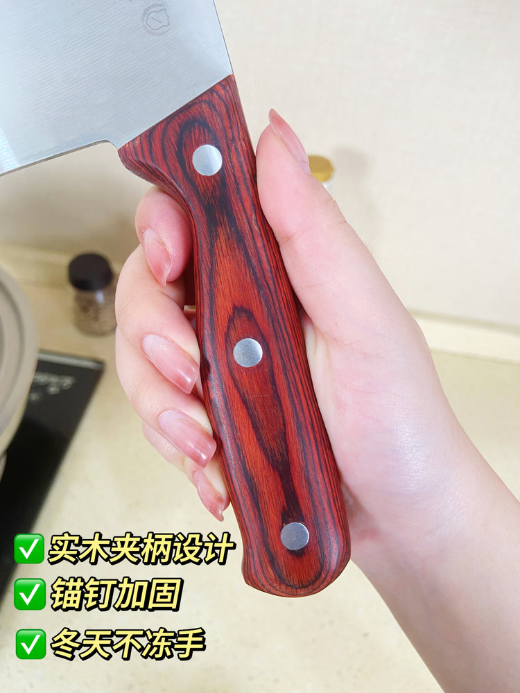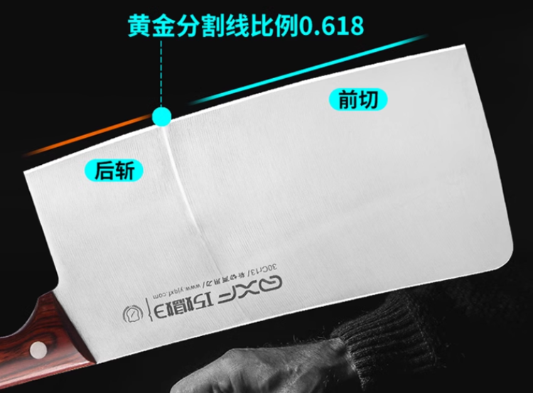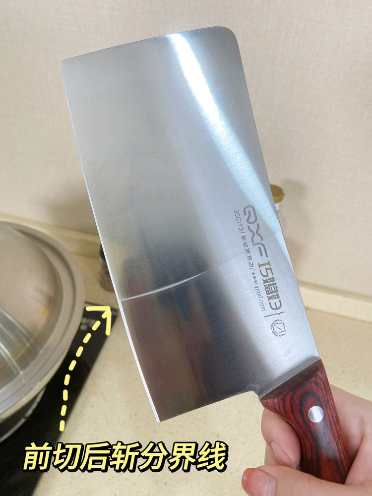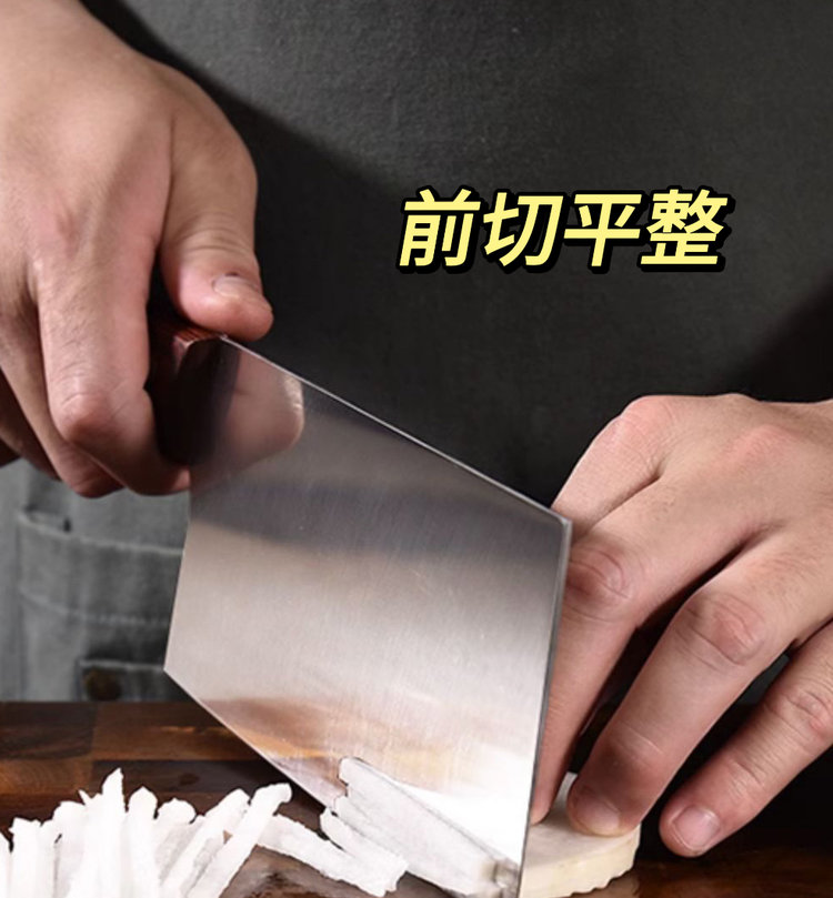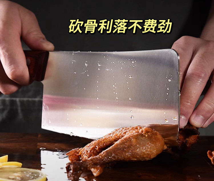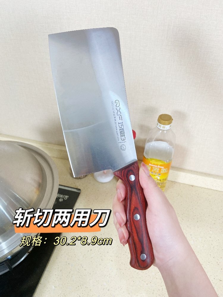 斩切两用刀:具有前切后斩两用功能,前刃三分之二可以切肉菜果蔬,后刃三分之一可砍剁中小骨头、三鸟家禽中小骨头类食物。