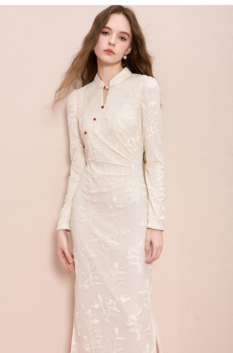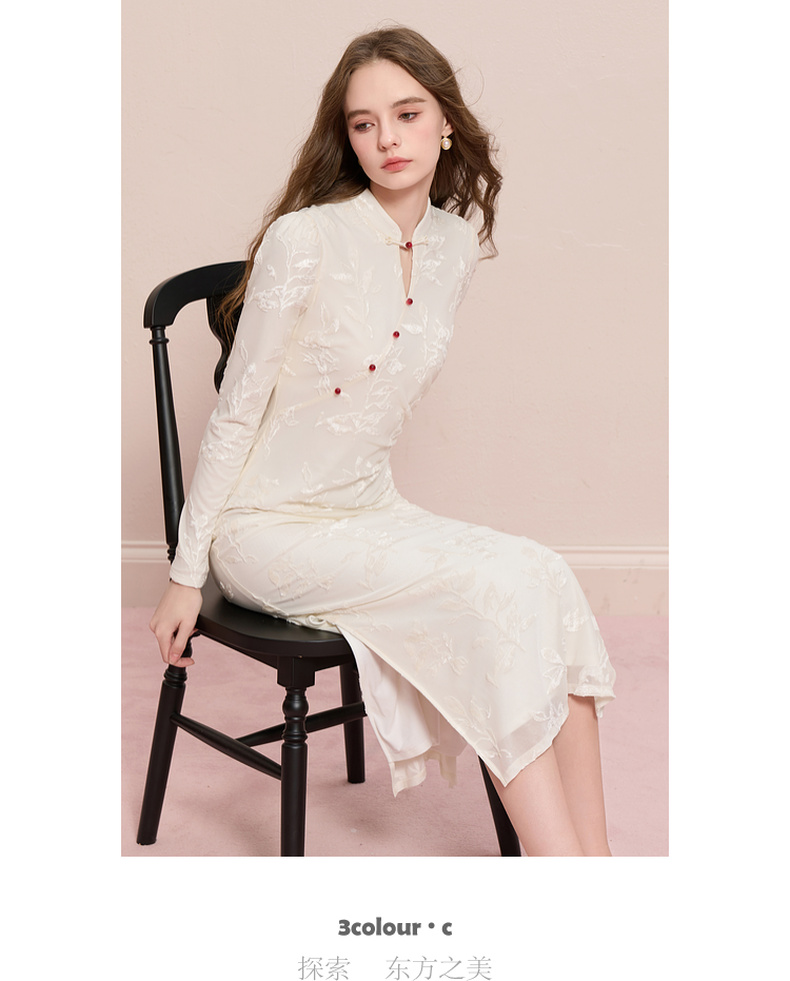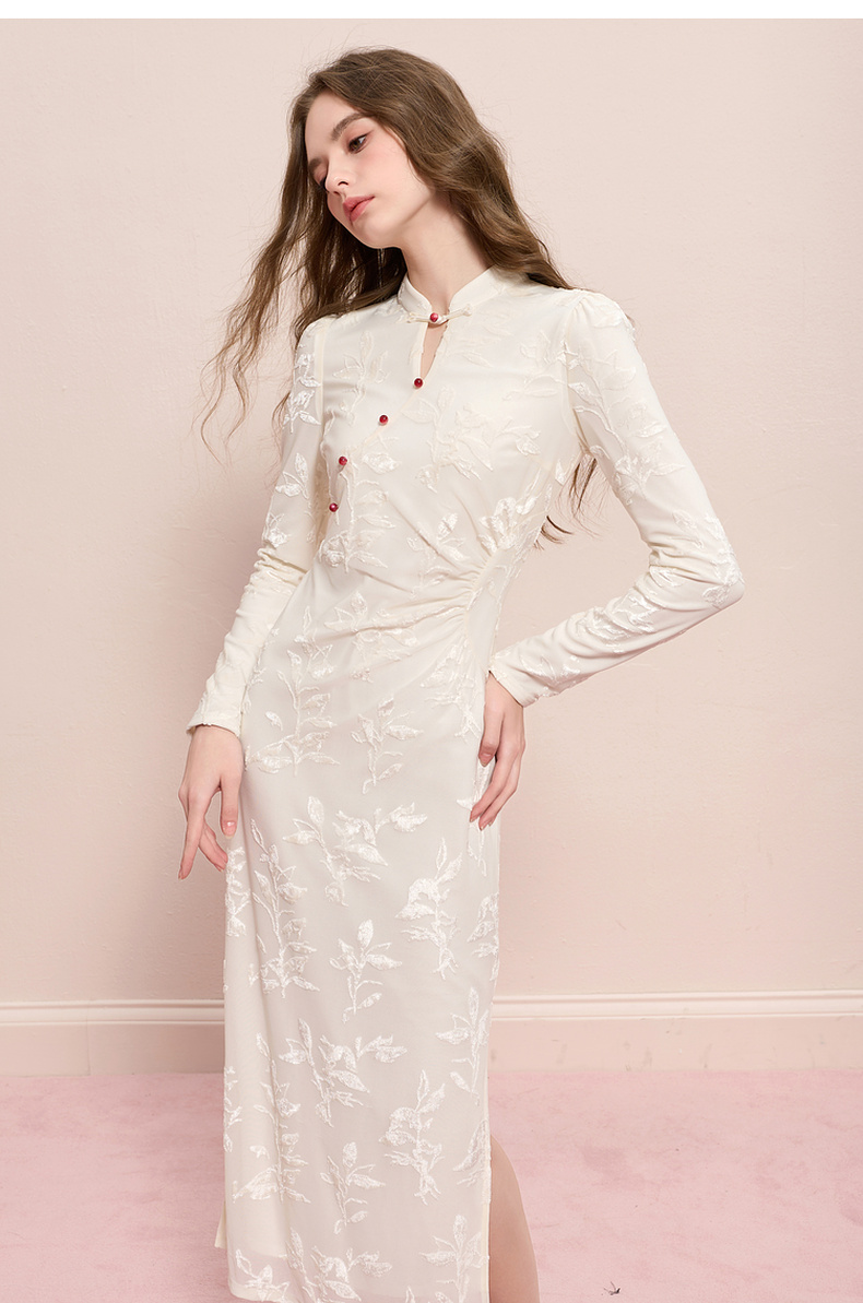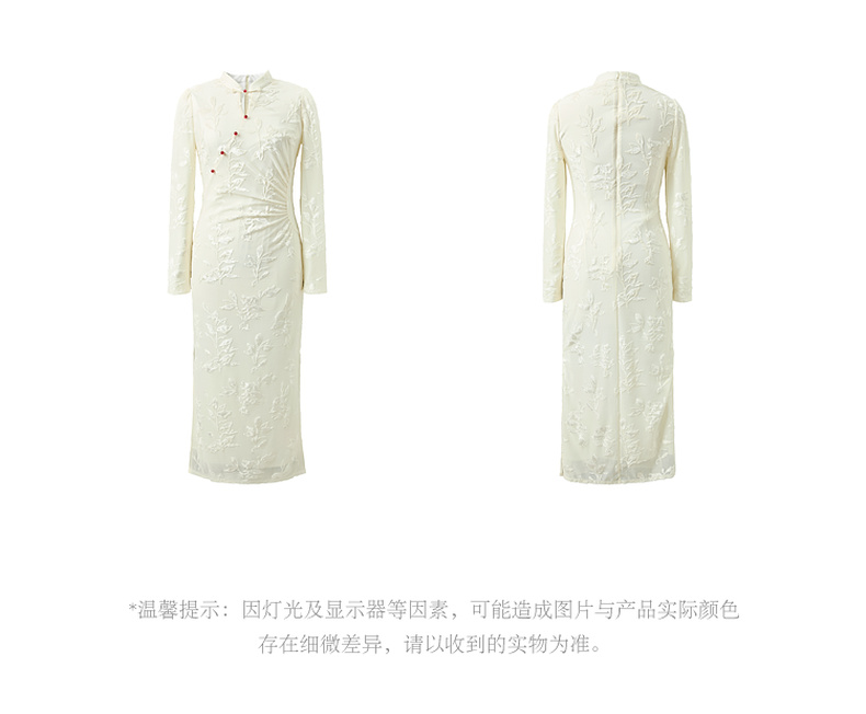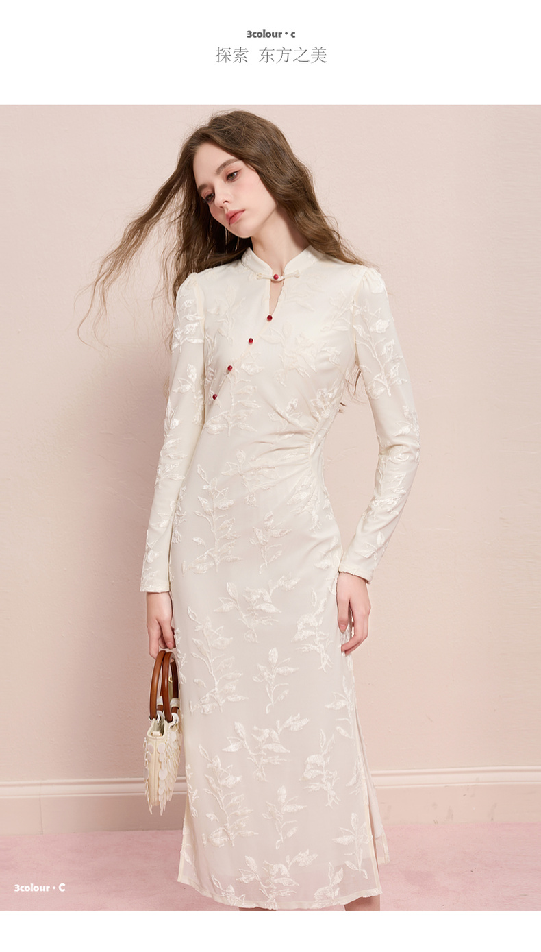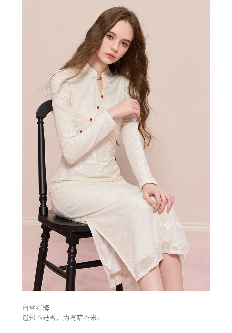三彩【白雪红梅】2025冬季新款修身连衣裙开叉收腰长裙C