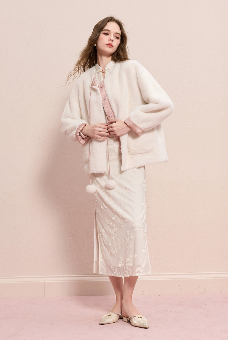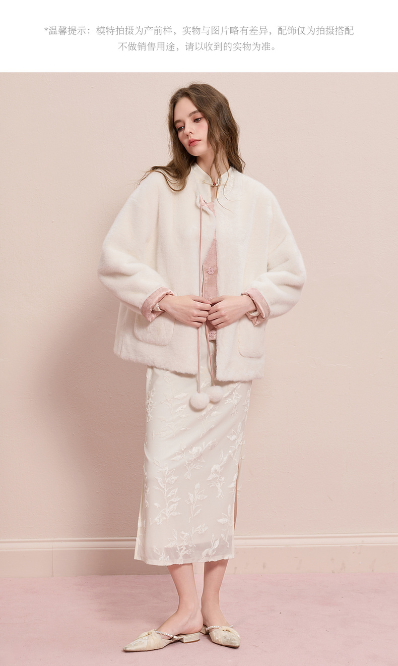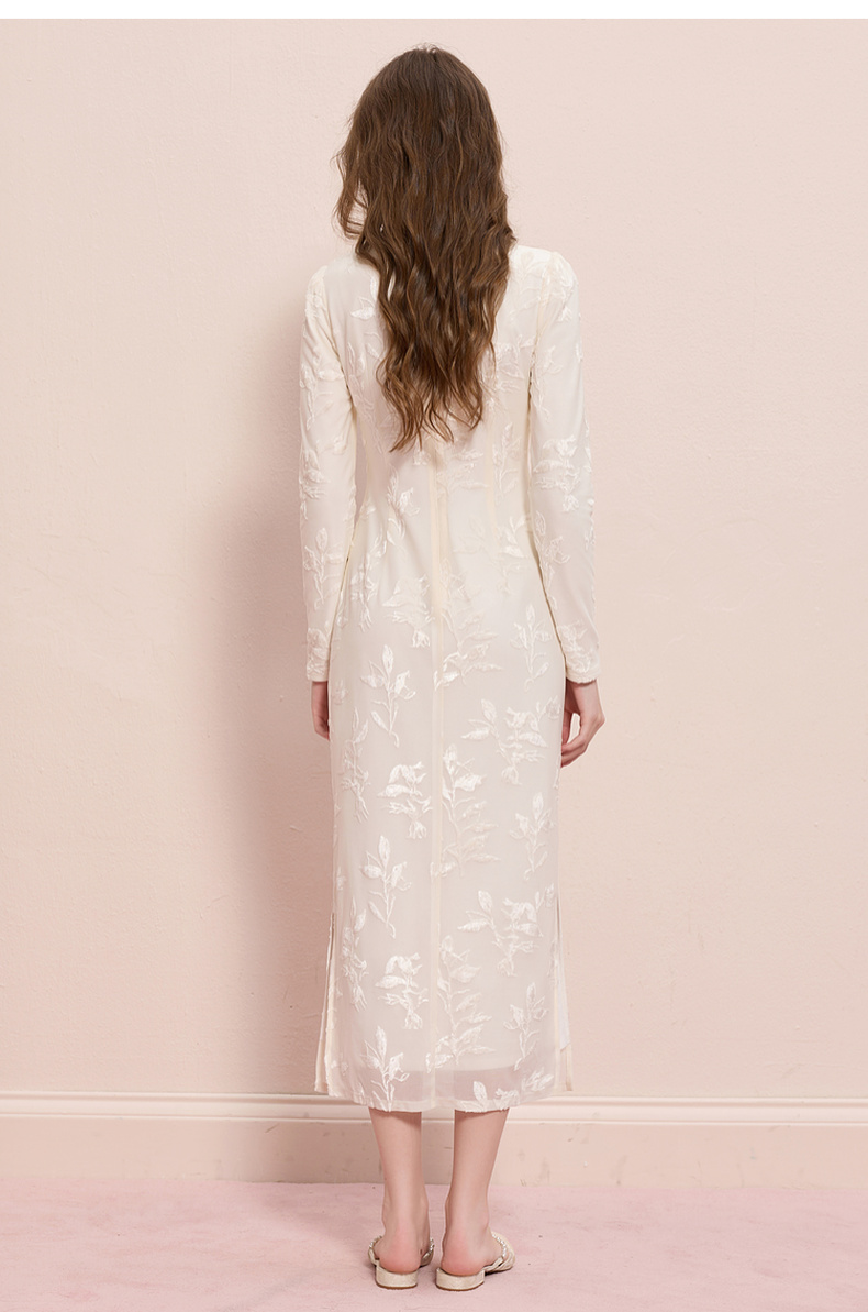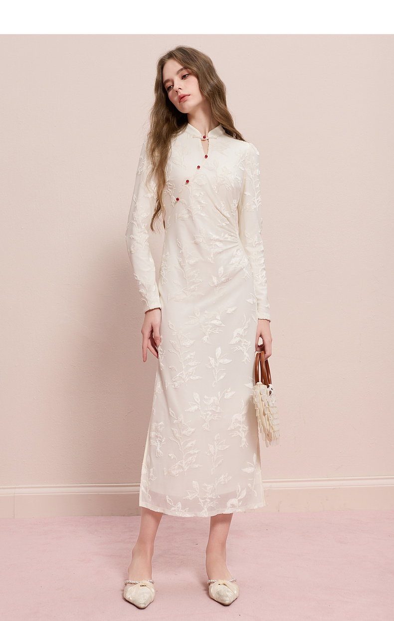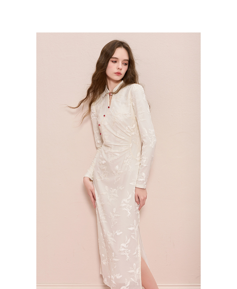 三彩【白雪红梅】2025冬季新款修身连衣裙开叉收腰长裙C